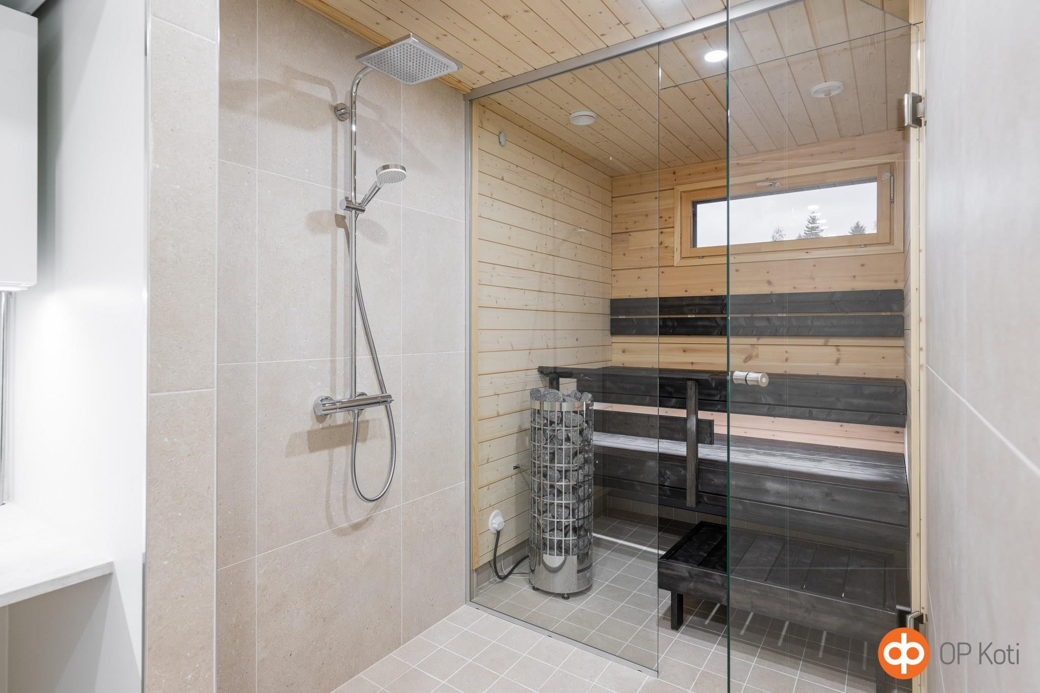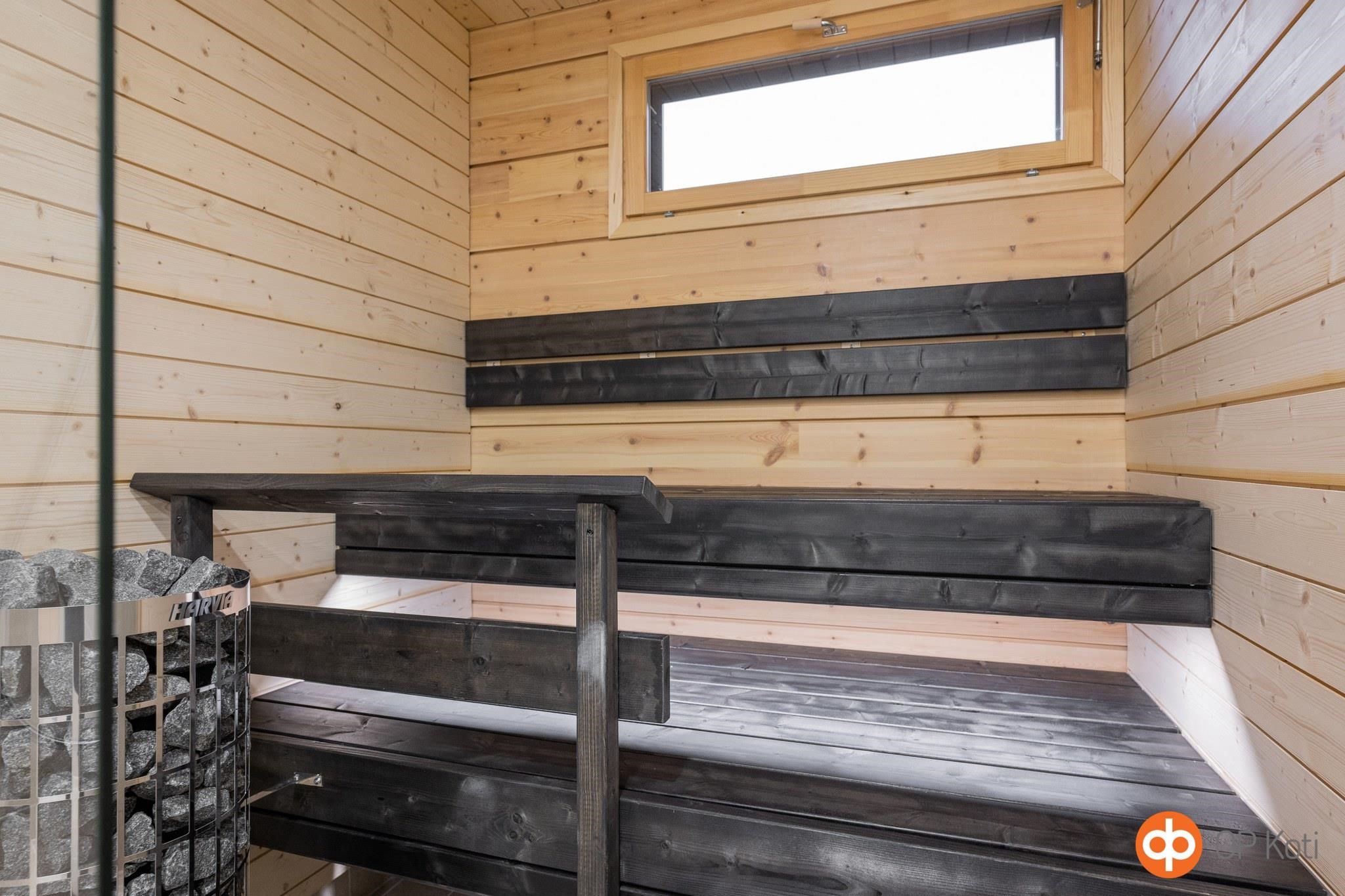 - Pesuhuoneiden lattiat ja seinät ovat laatoitettuja. Saunan seinät ja katot ovat sävytettyä vähäoksaista kuusipaneelia, jossa LED-tunnelmavalaistus. Saunassa on sähkökiuas erillisellä ohjausyksiköllä. Saunan ja pesuhuoneen erottaa lasiseinä. WC:n seinät ovat maalipintaiset, lattia on laatoitettu.