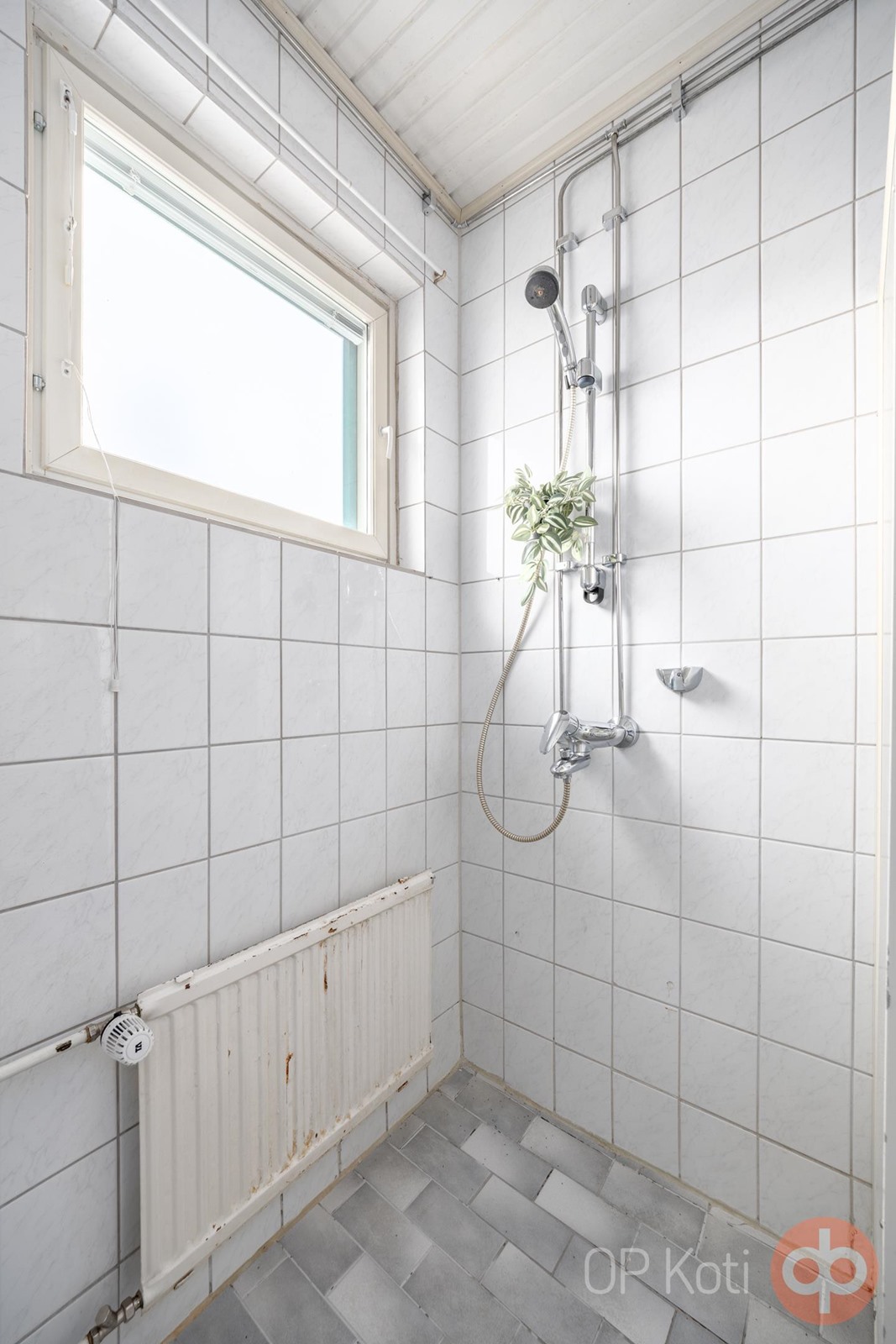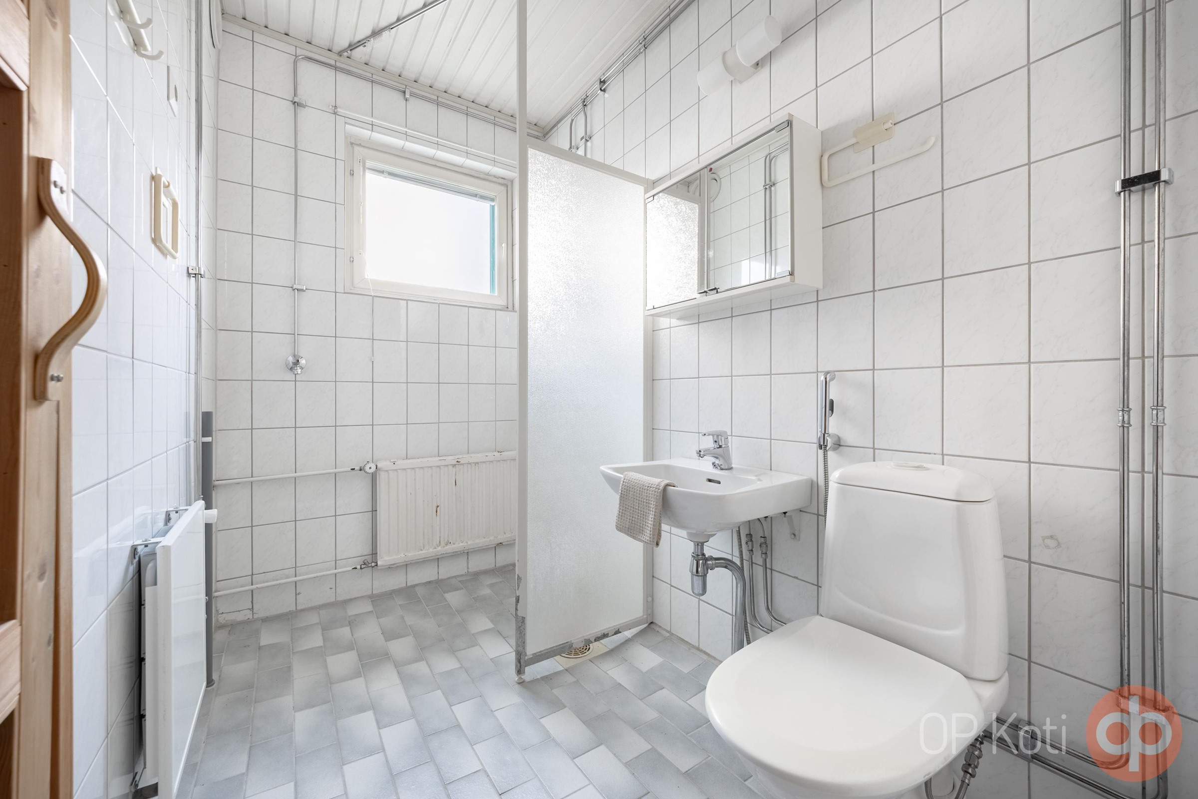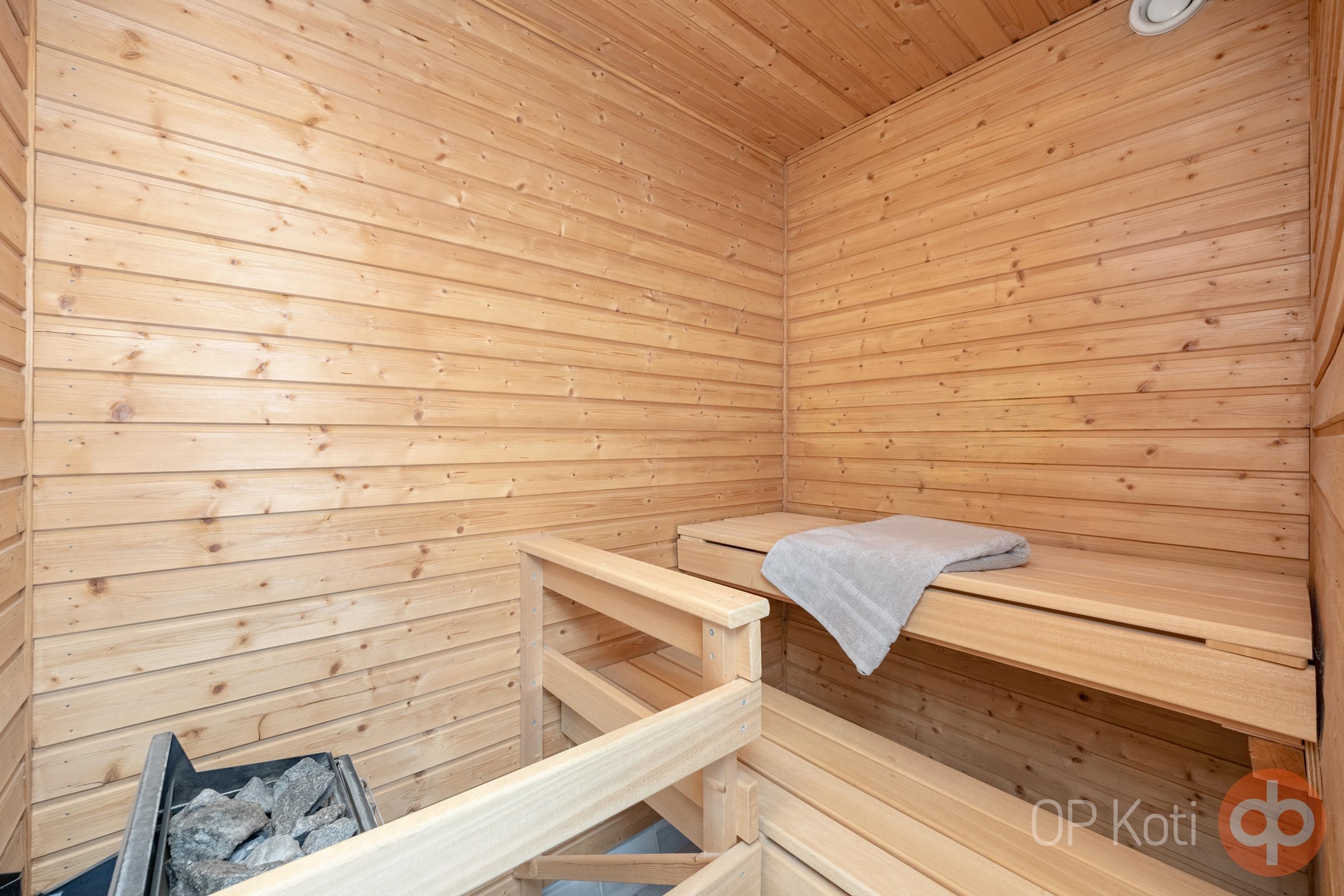 - Sauna, sähkökiuas, kylpyhuone, suihku, peilikaappi, pesukoneliitäntä.