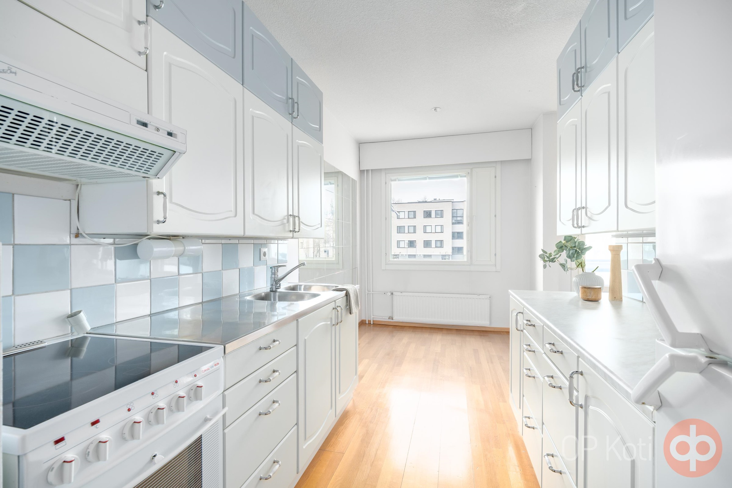 - Jääkaappipakastin, lattialiesi, keraaminen liesi, liesituuletin, kaapistot.