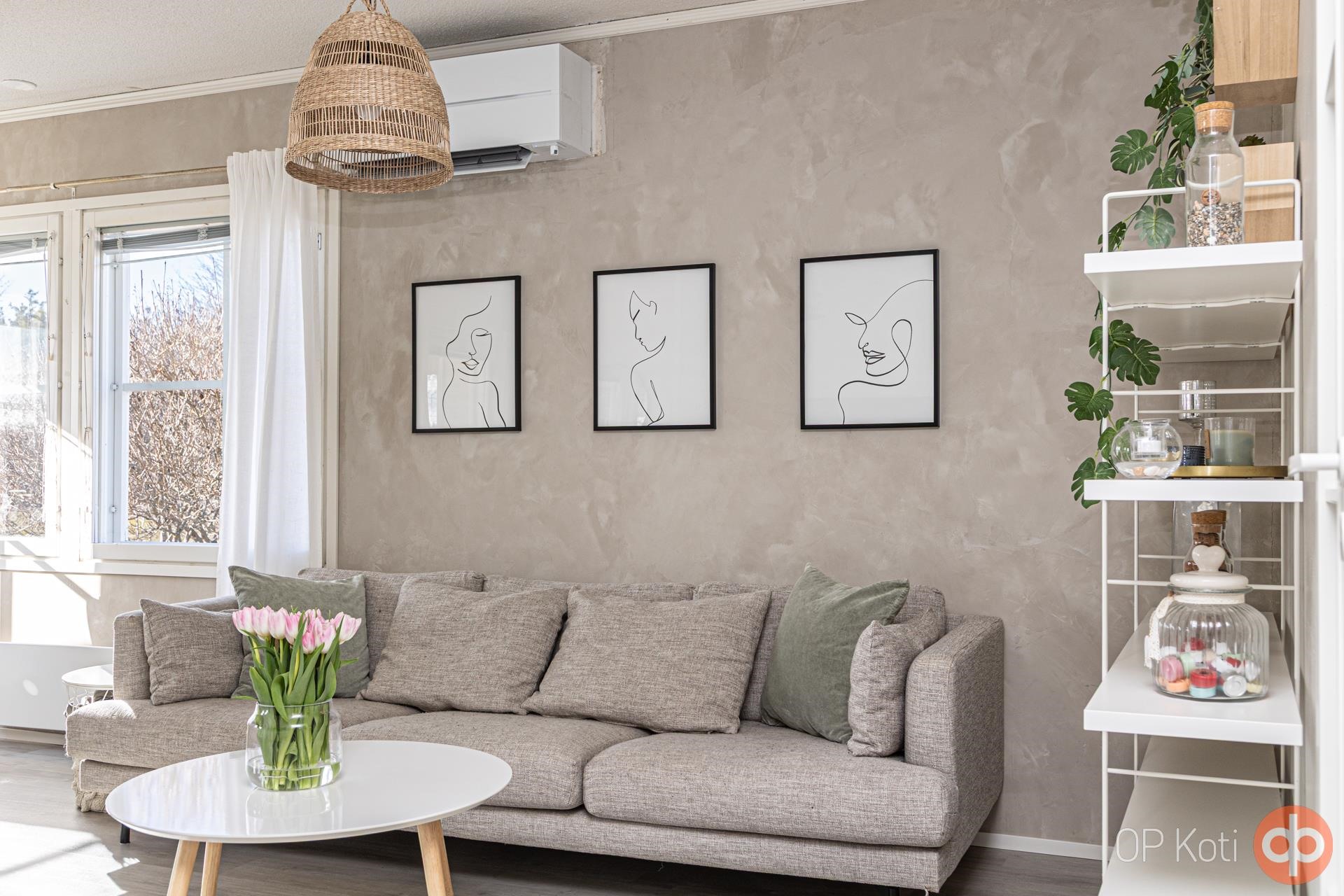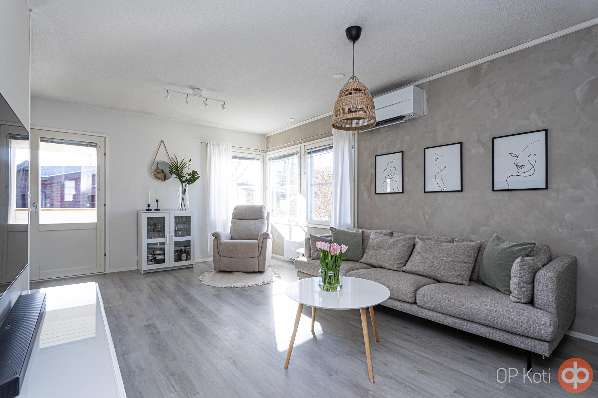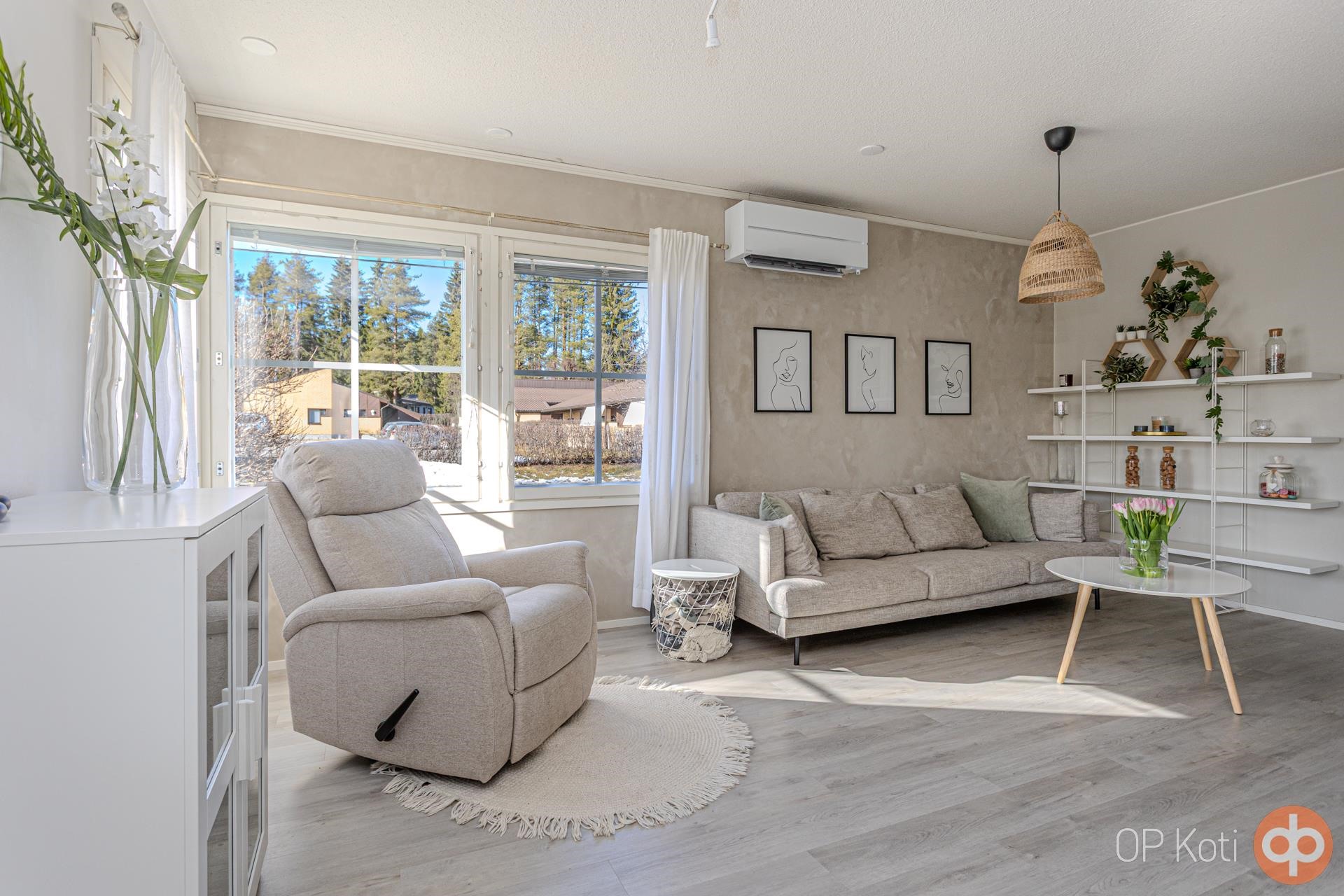 Kodissa on vaalean harmoninen sisustus ja lähes kaikki pinnat ovat hiljattain uudistettu. Ilmalämpöpumppu tuo viihtyvyyttä niin helteisiin kuin viileämpiinkin päiviin. Käytännöllinen pohjaratkaisu tarjoaa kaksi makuuhuonetta: toisessa vaatehuone, toisessa kätevä työskentelytila. Tilavassa eteisessä on laattalattia ja runsaasti kaappitilaa, muissa huoneissa taas laadukkaat vinyylilankkulattiat tuovat lämpöä askeliin.