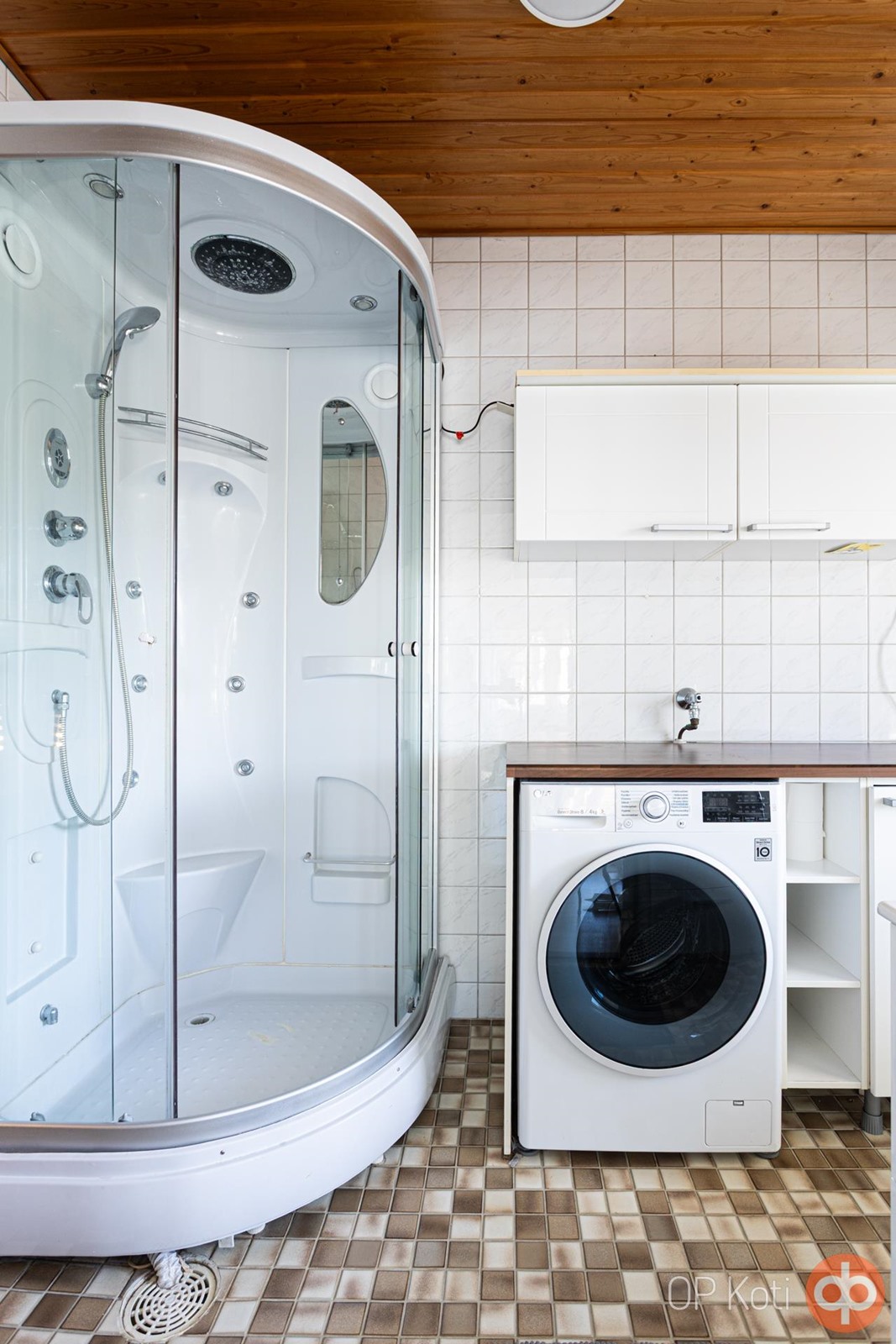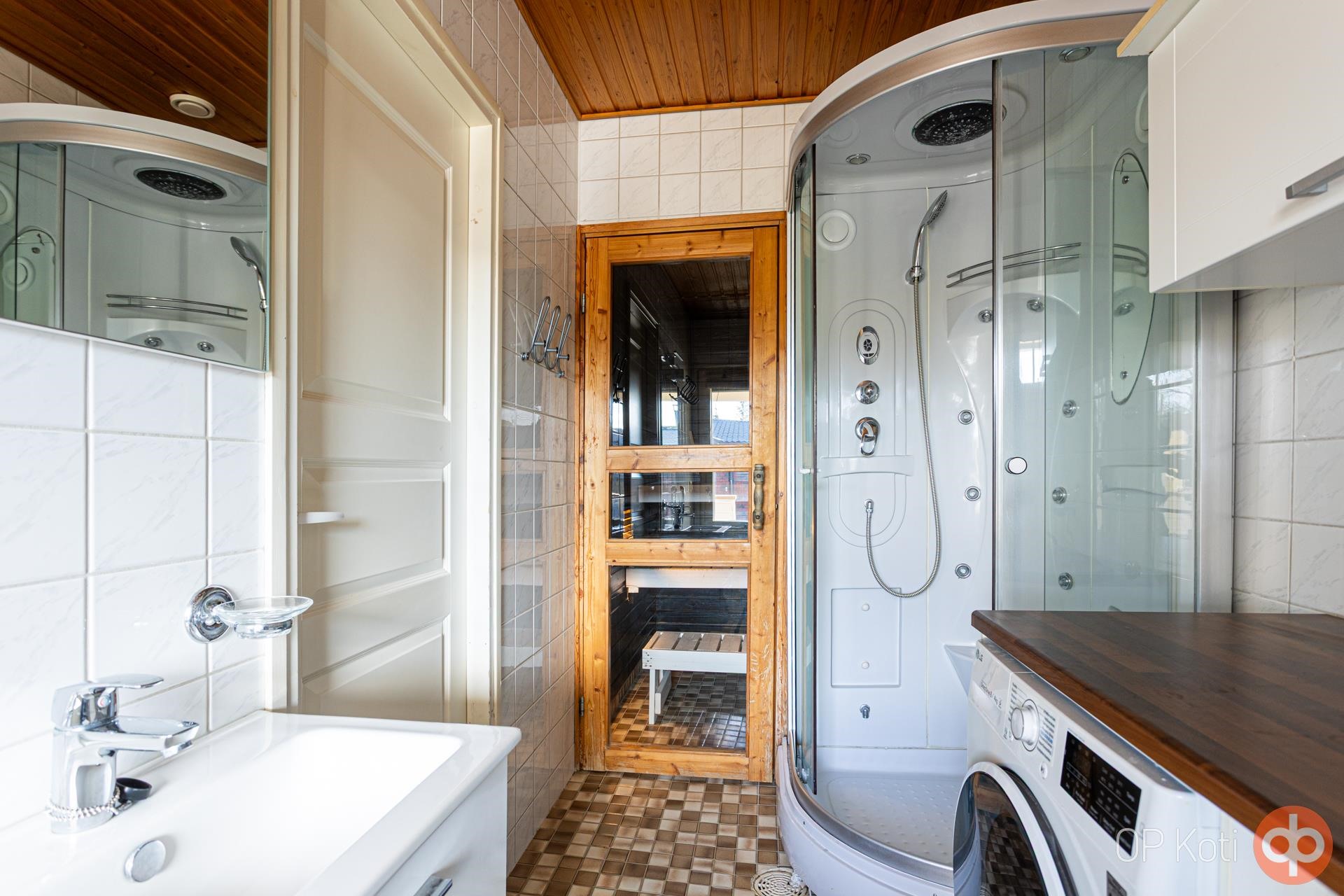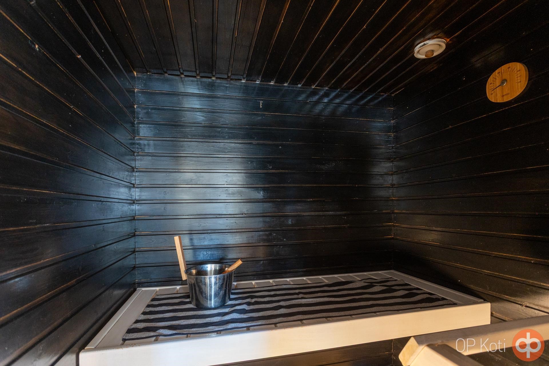 - Sauna, sähkökiuas, kylpyhuone, erillinen wc, suihkukaappi, peilit, peilikaappi, allaskaappi, pesukoneliitäntä, lattialämmitys, kiinteät valaisimet.