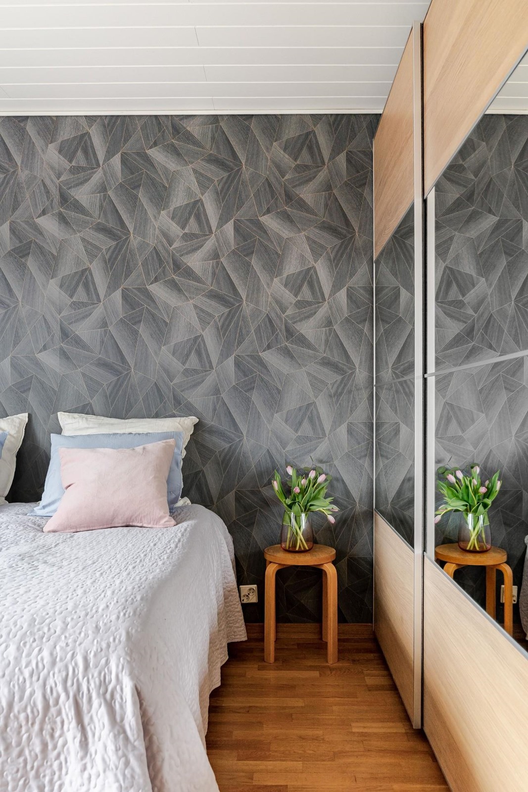 Keittiö: vinyylilankkulattia, maalatut seinät ja katto. Olohuone: parkettilattia, maalatut seinät ja katto. Makuuhuone 1: parkettilattia, maalatut seinät, osittain tapetoitu ja katto paneloitu. Makuuhuone 2: parkettilattia, maalatut seinät ja katto paneloitu. Makuuhuone 3: parkettilattia, maalatut seinät ja katto paneloitu. Sauna: seinät ja katto paneloitu. Kylpyhuone: seinät ja lattia laatoitettu, katto paneloitu. Eteinen: kivilattia ja maalatut seinät sekä paneloitu katto.