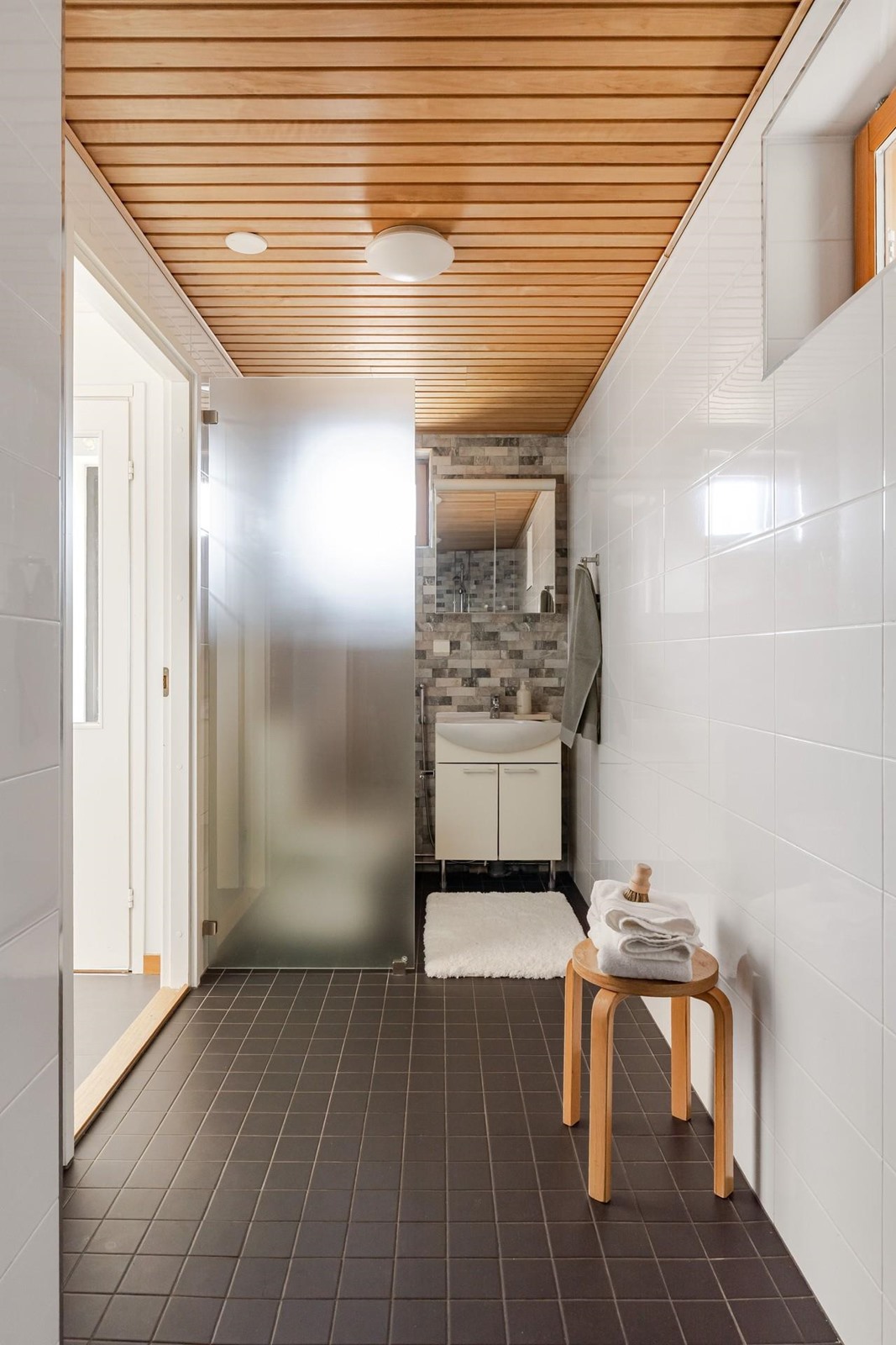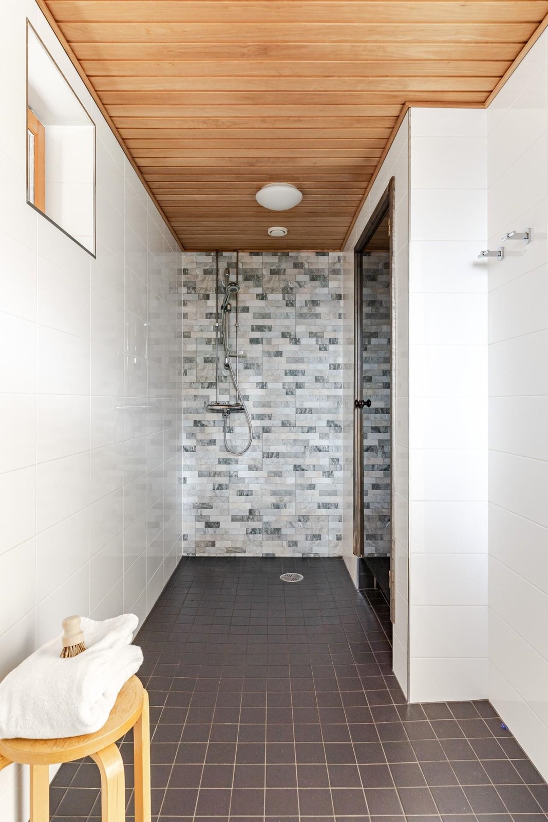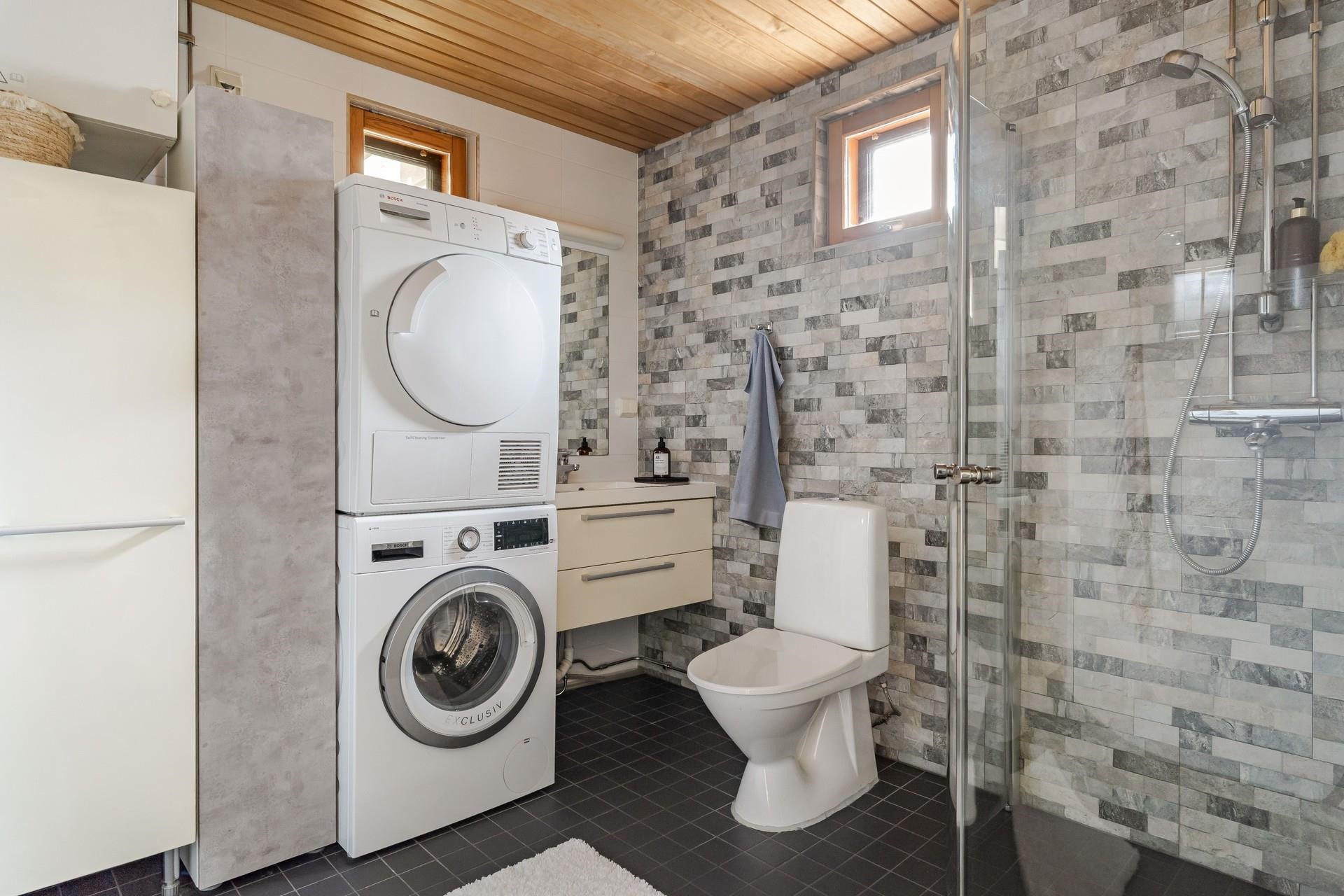 - Alakerran kylpyhuone saunalla, jossa sähkökiuas,suihku, allaskaappi, wc-istuin, peilikaappi, kiinteät valaisimet. Yläkerran kylpyhuone; suihku, suihkuseinät, allaskaappi, wc-istuin, peili, kiinteät valaisimet, kaapistot, pesukoneliitäntä.