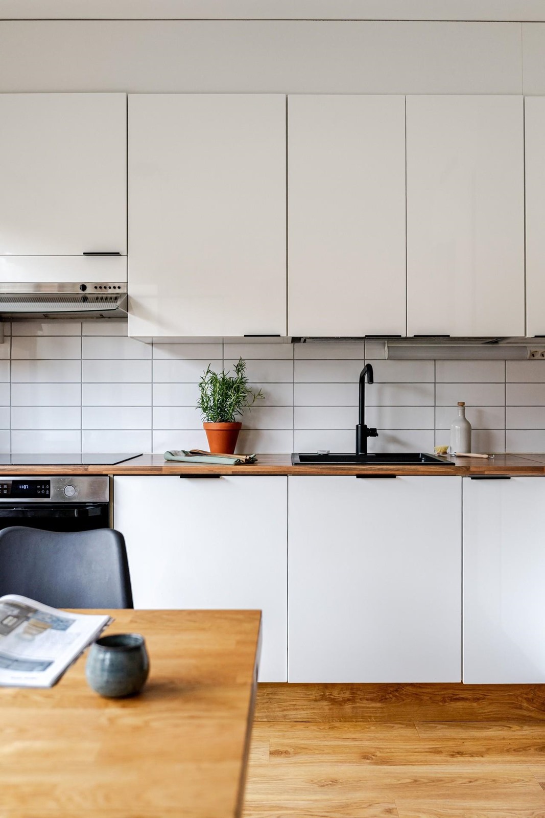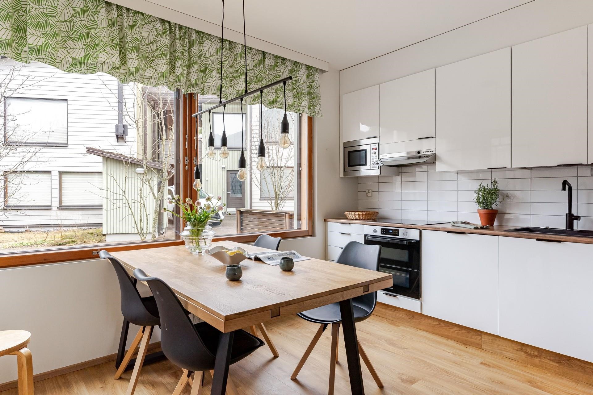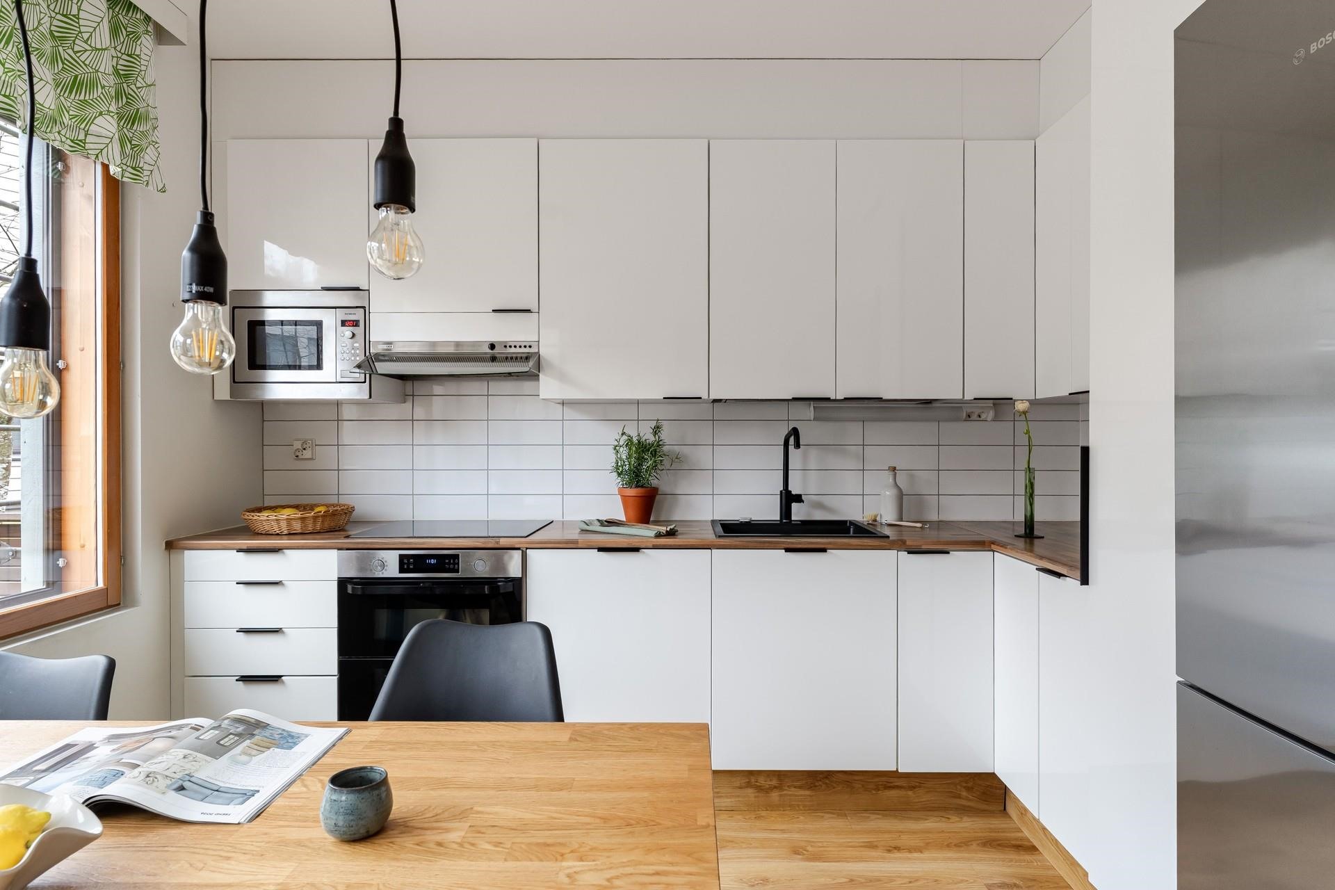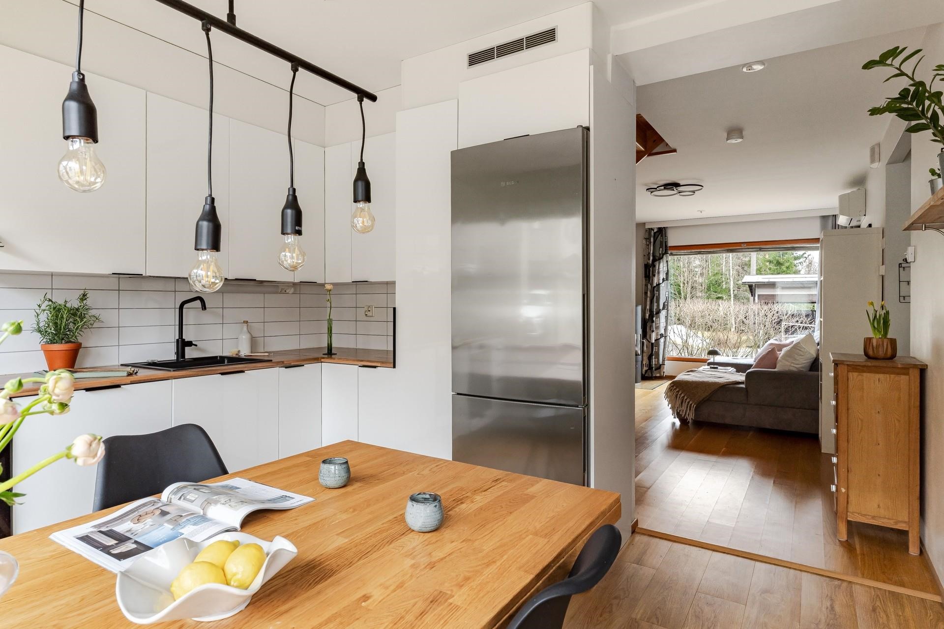 - Jääkaappipakastin; 70 cm leveä, erillisuuni, induktioliesi, liesituuletin, mikroaaltouuni integroitu, astianpesukone, kaapistot, kiinteät valaisimet.