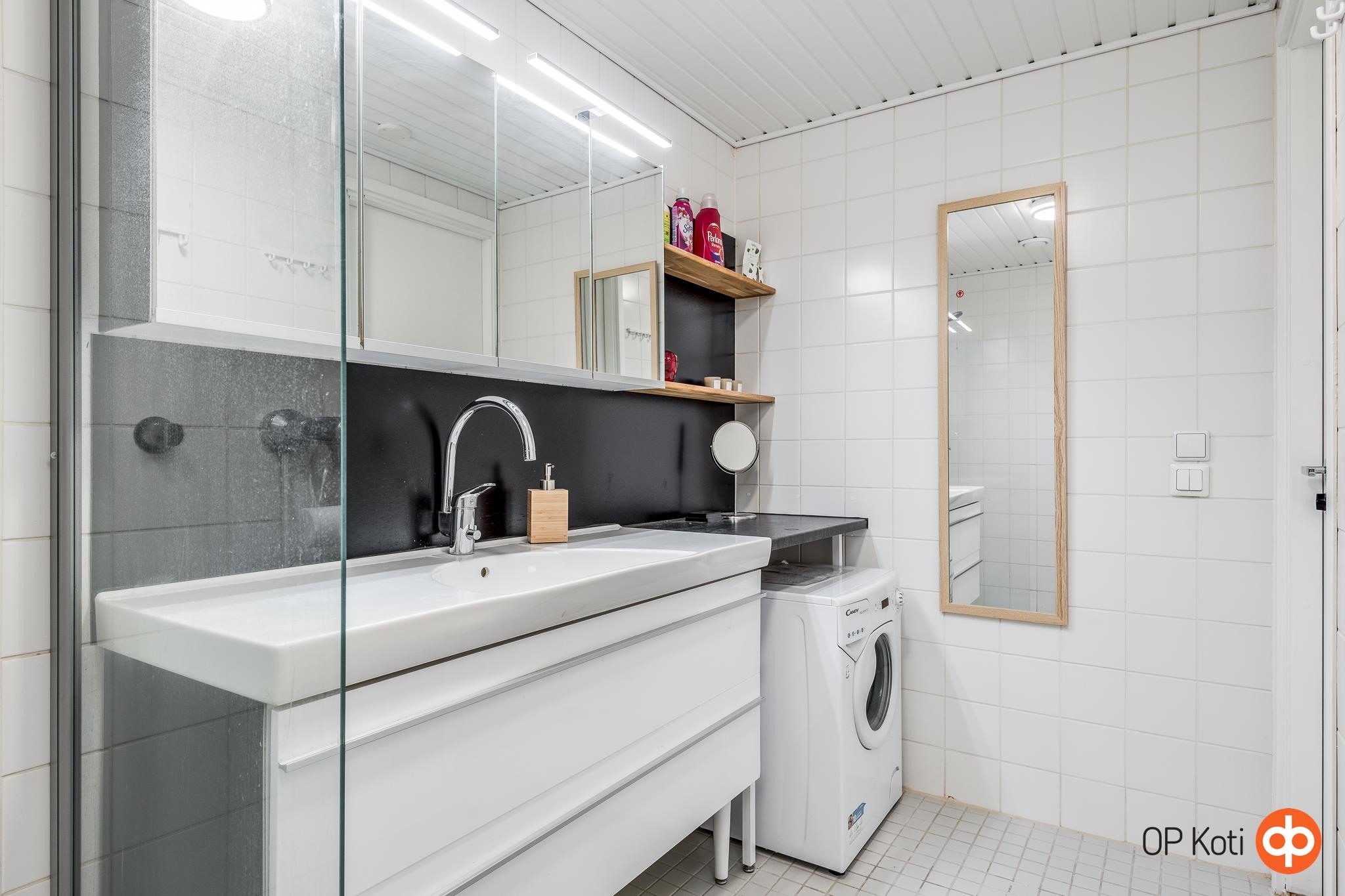 - Sauna, sähkökiuas, kylpyhuone, erillinen wc, suihku, suihkuseinä, peilikaappi, allaskaappi, pesukoneliitäntä, lattialämmitys, kiinteät valaisimet. Kylpyhuoneen ja wc:n kalusteet uusittu vuonna 2022