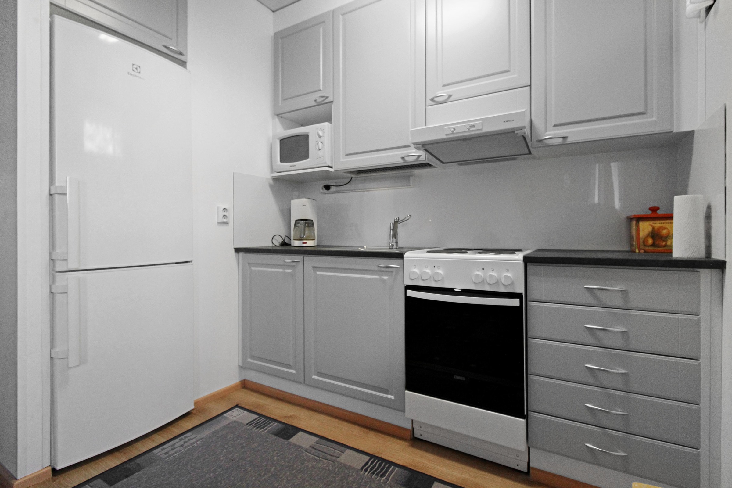 - Jääkaappipakastin, lattialiesi, sähköliesi, liesituuletin, kaapistot, kiinteät valaisimet. Keittiö remontoitu
