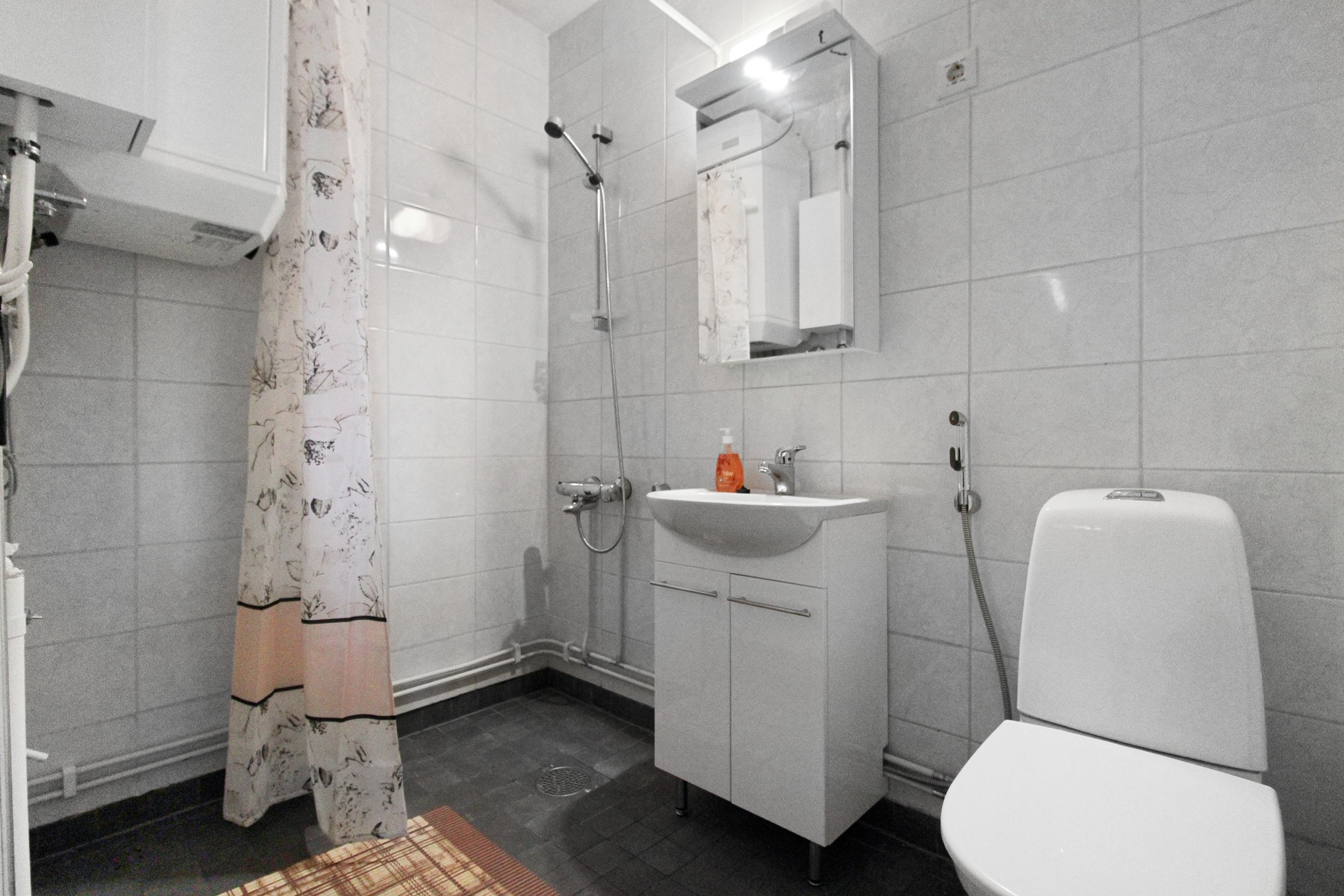 - Kylpyhuone, suihku, peilikaappi, allaskaappi, pesukoneliitäntä, lattialämmitys, kiinteät valaisimet. Kylpyhuone remontoitu