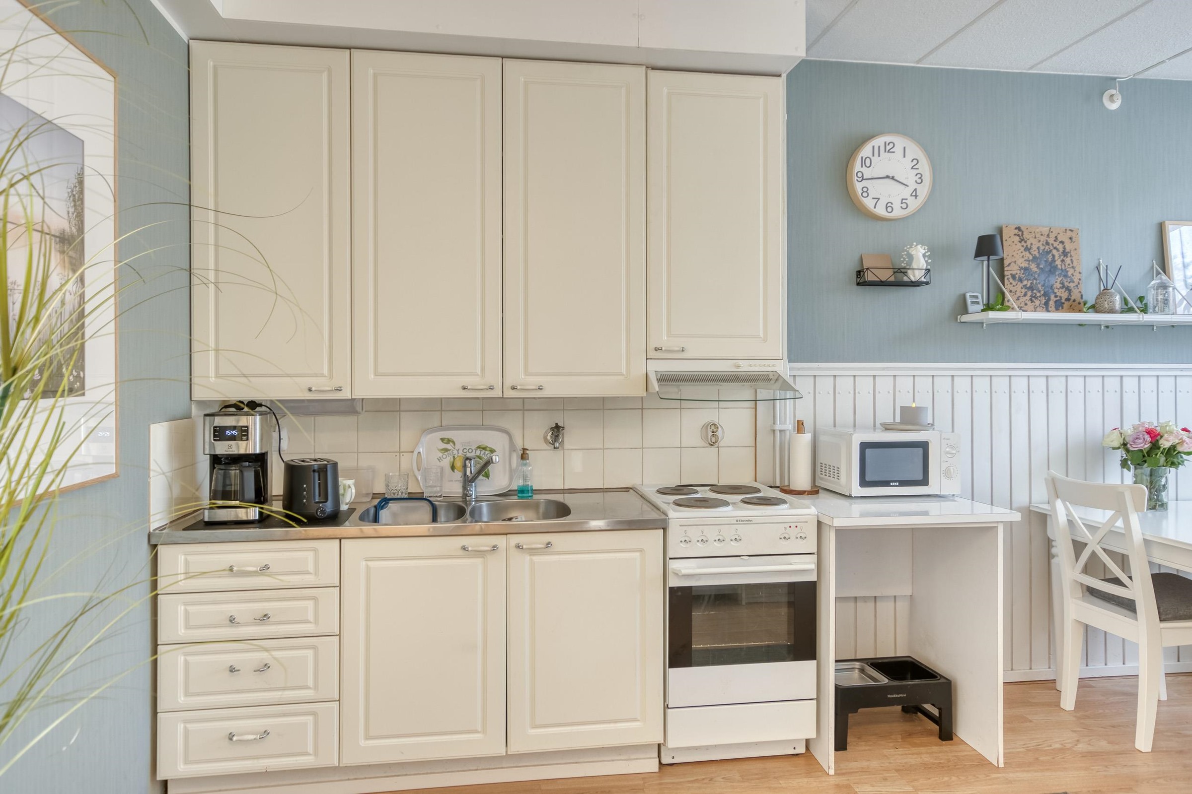 - Jääkaappi, sähköliesi, liesituuletin, kaapistot.