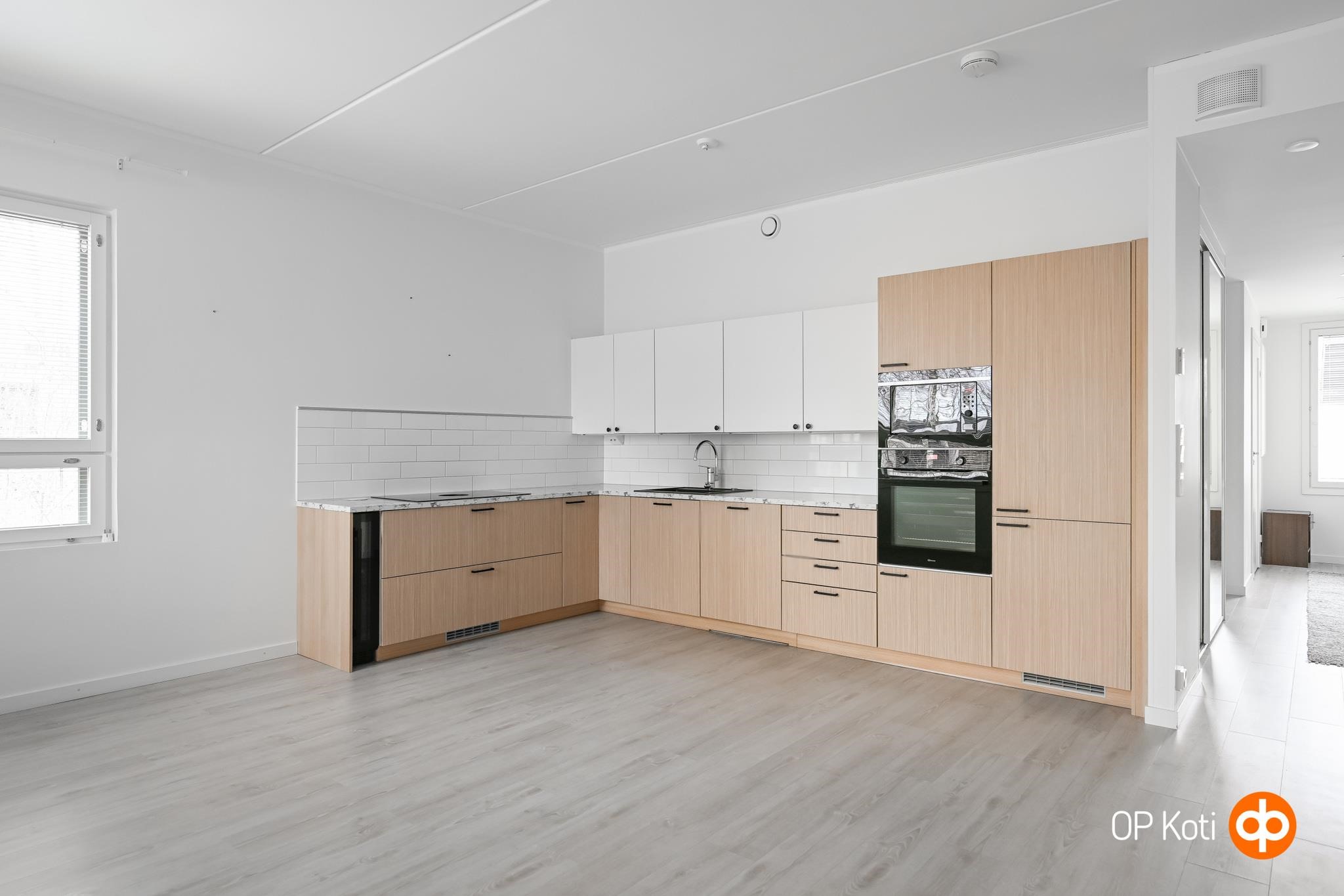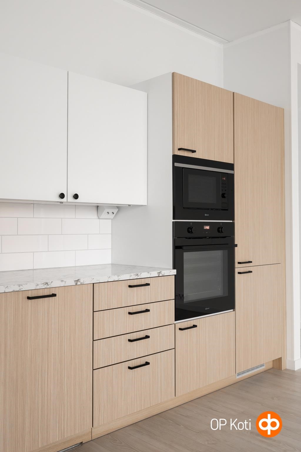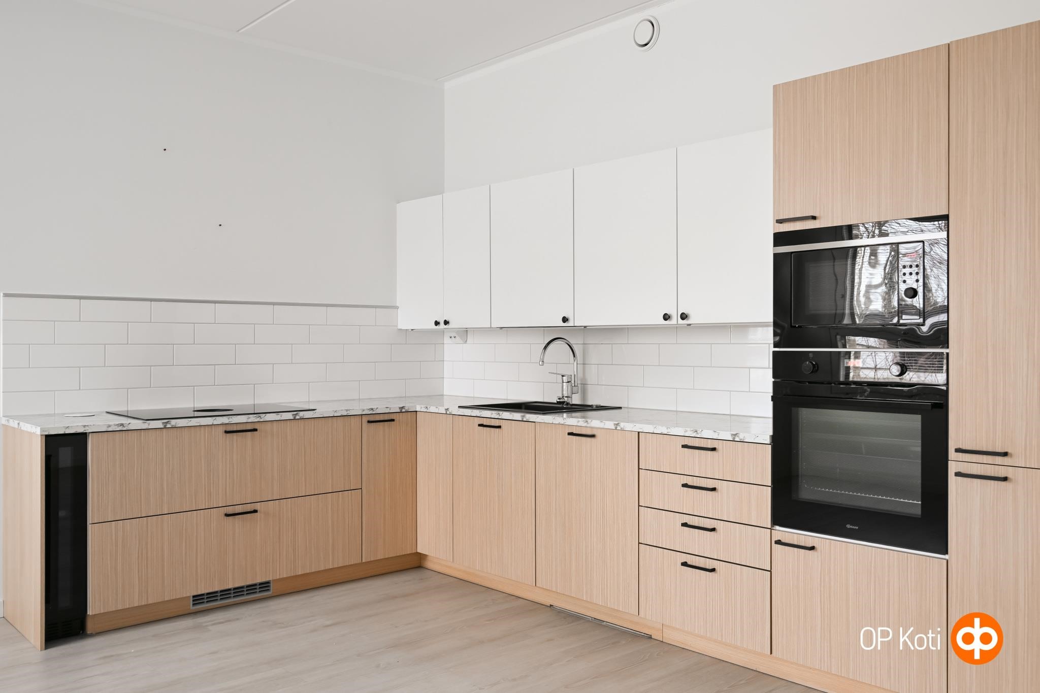 - Jääkaappipakastin integroitu, lattialiesi, induktioliesi, liesituuletin, mikroaaltouuni, astianpesukone, kaapistot, kiinteät valaisimet.