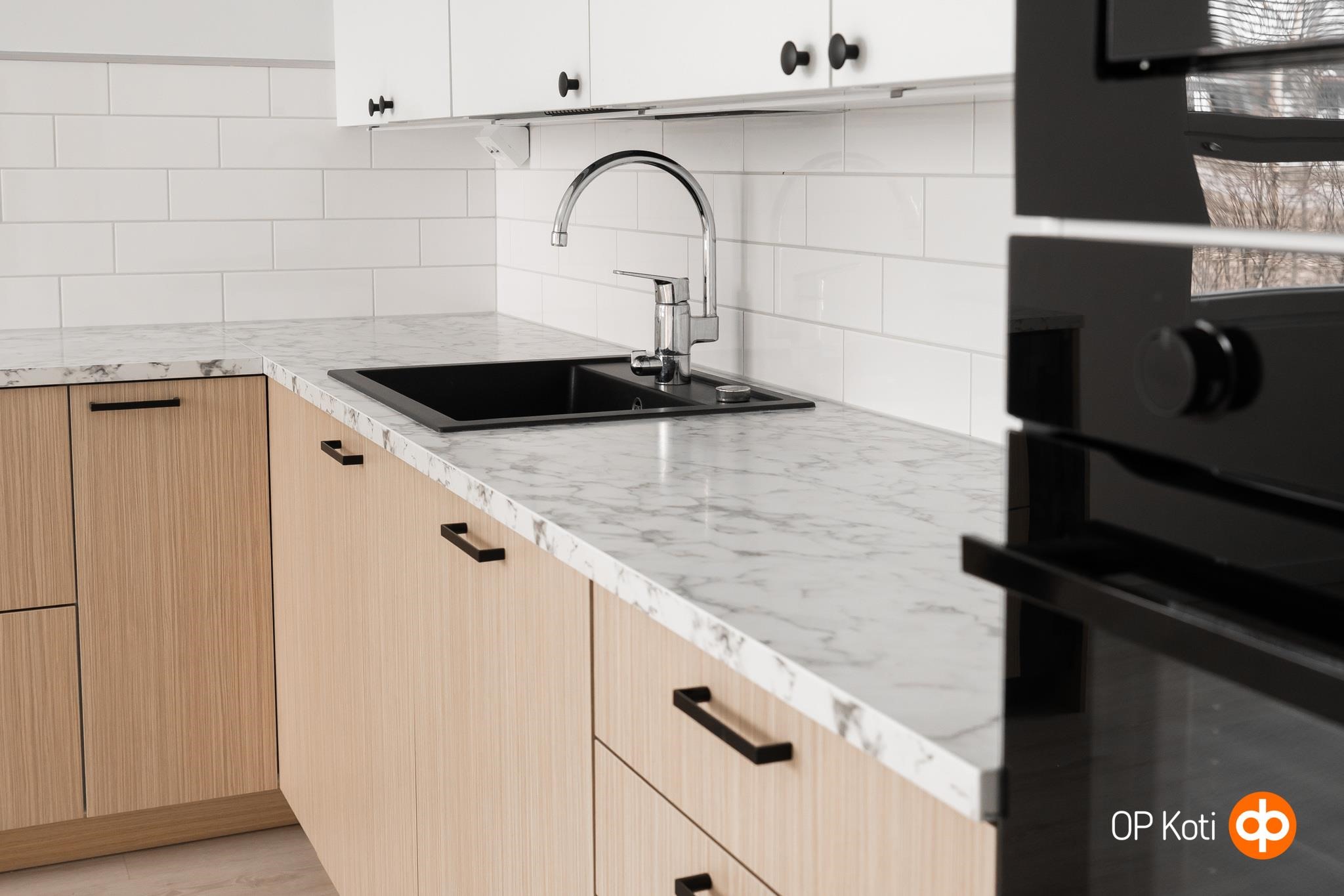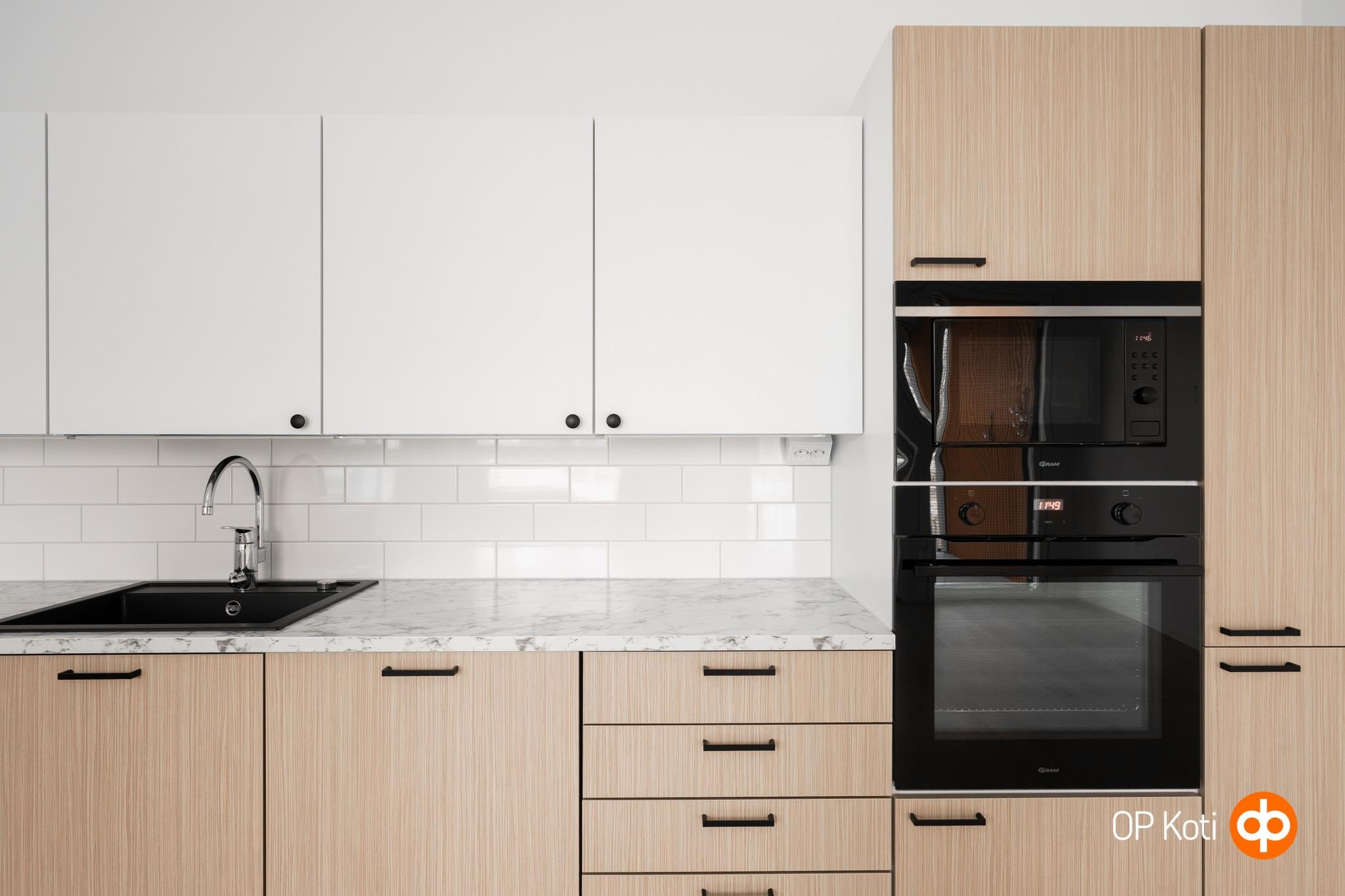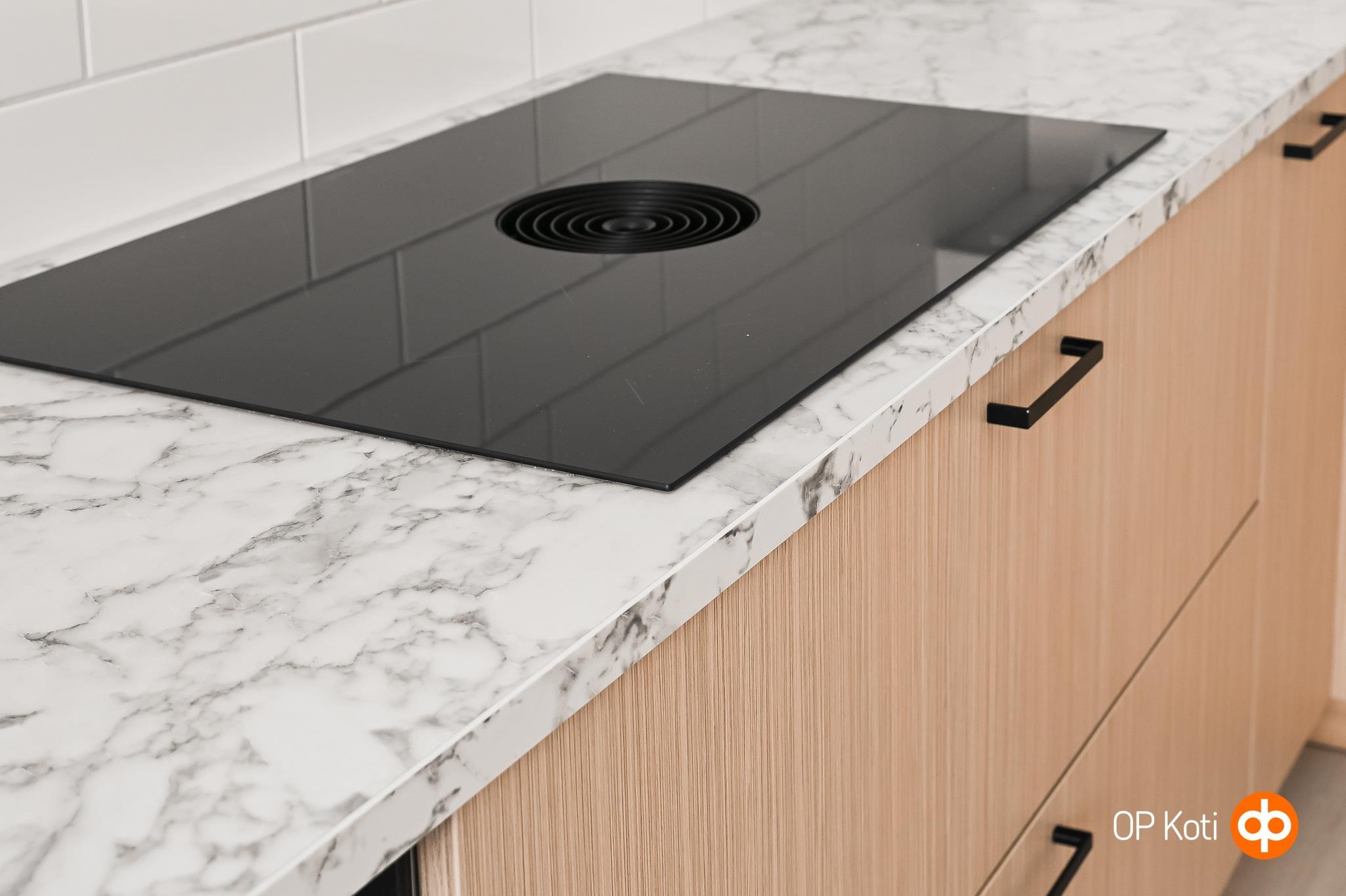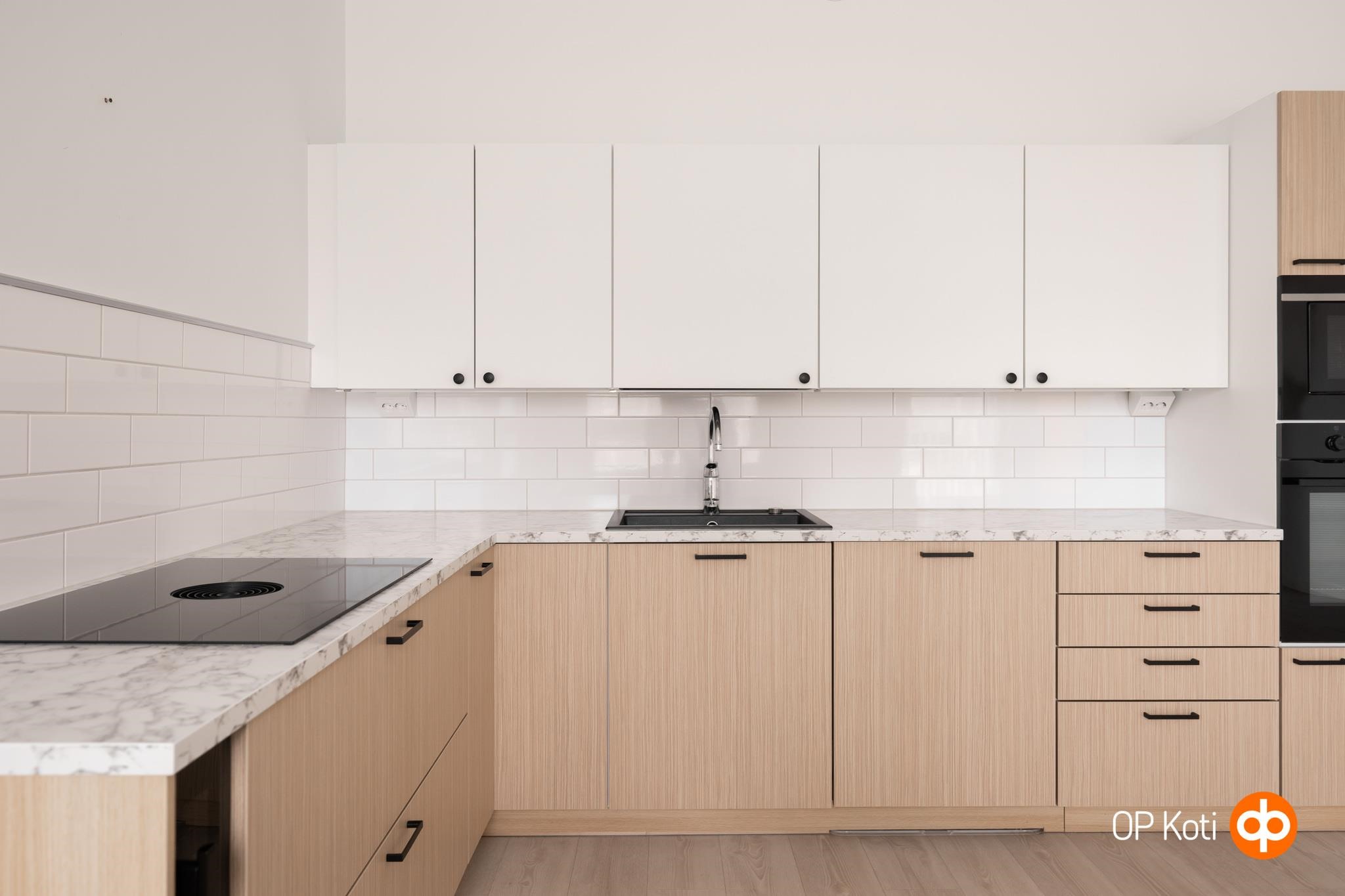 - Jääkaappipakastin integroitu, lattialiesi, induktioliesi, liesituuletin, mikroaaltouuni, astianpesukone, kaapistot, kiinteät valaisimet.
