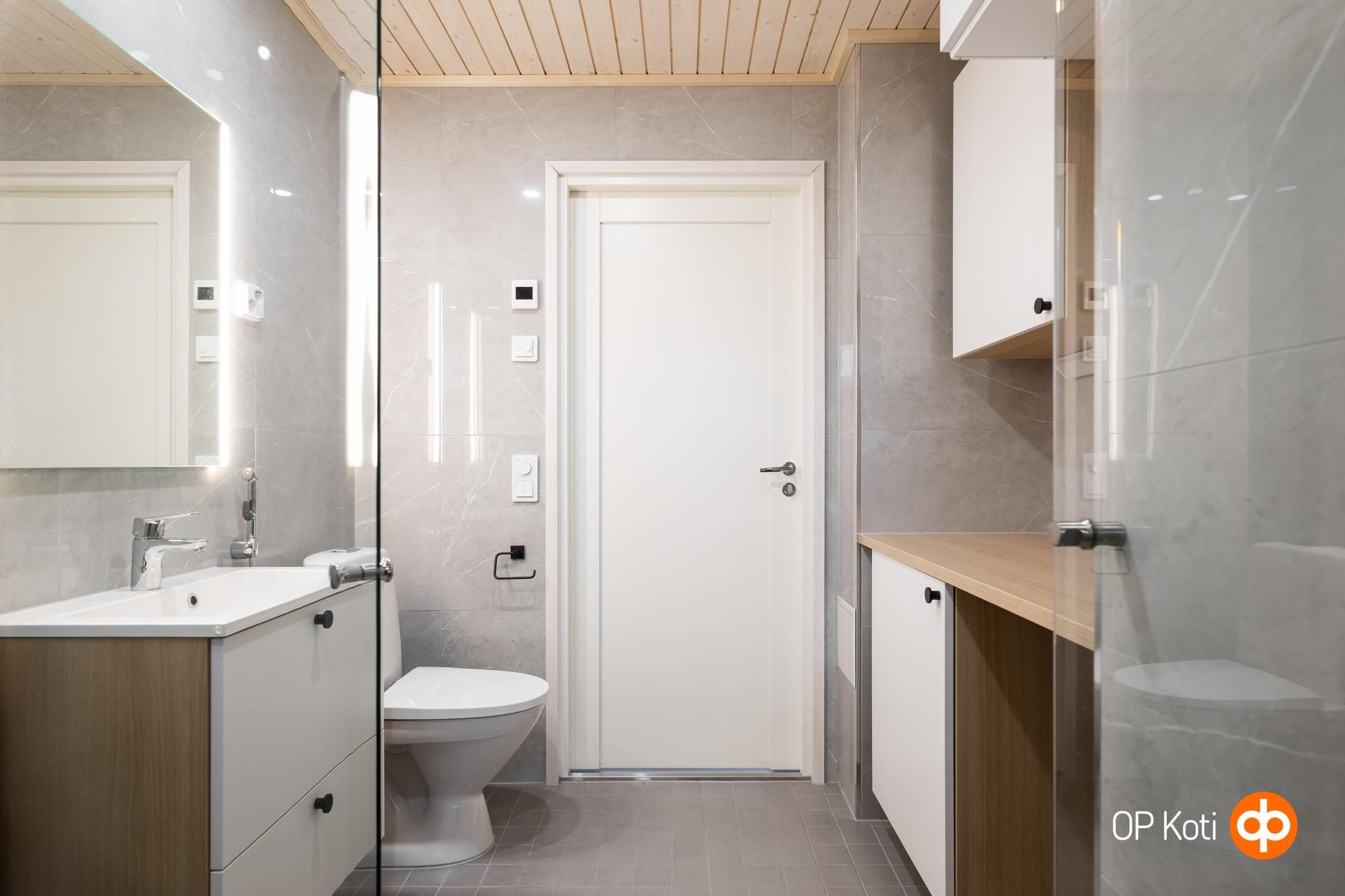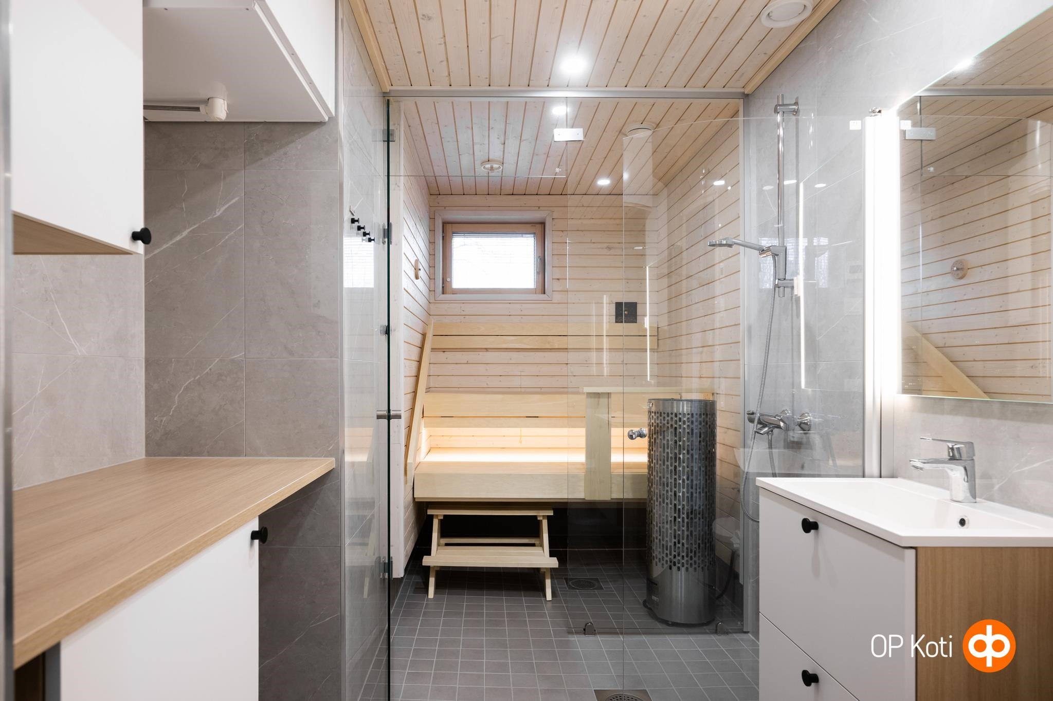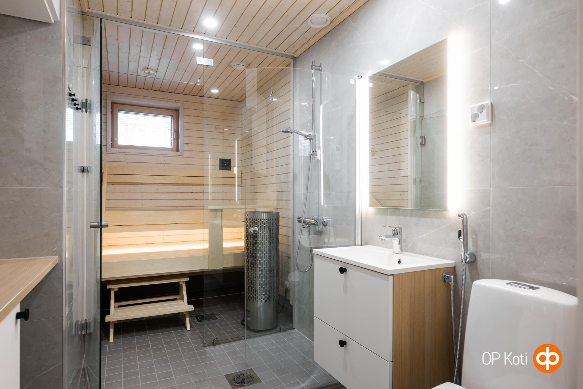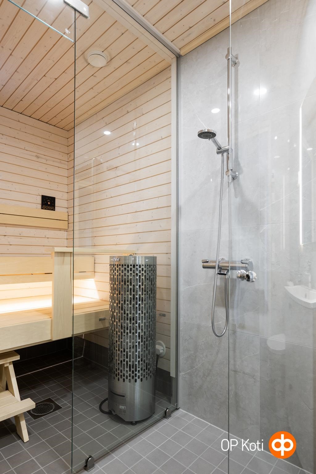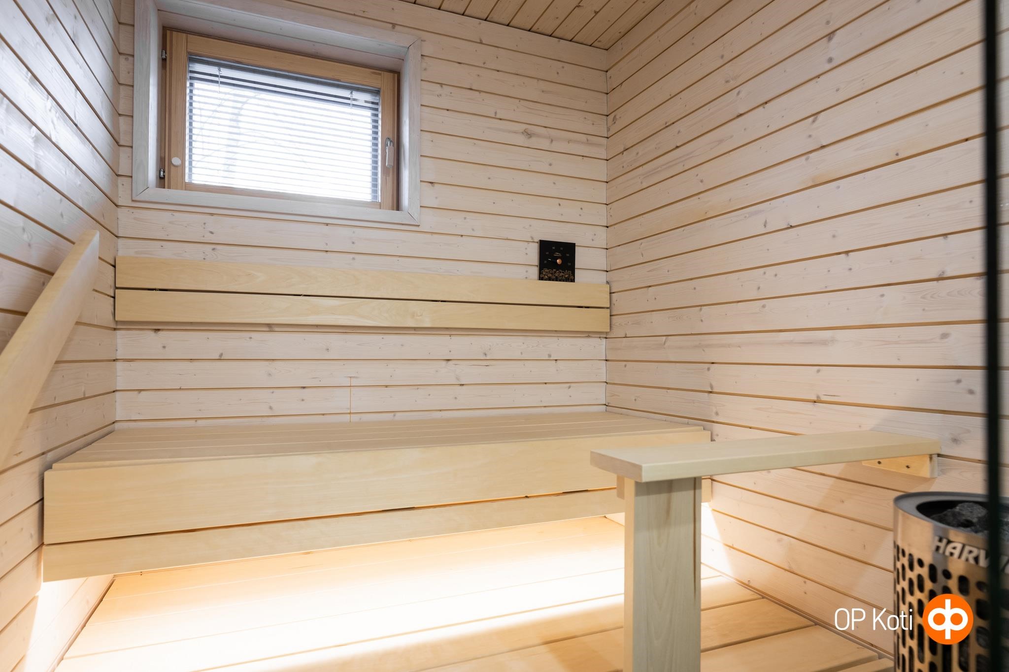 - Sauna, sähkökiuas, kylpyhuone, suihku, suihkuseinä, peilit, allaskaappi, pesukoneliitäntä, lattialämmitys, kiinteät valaisimet.