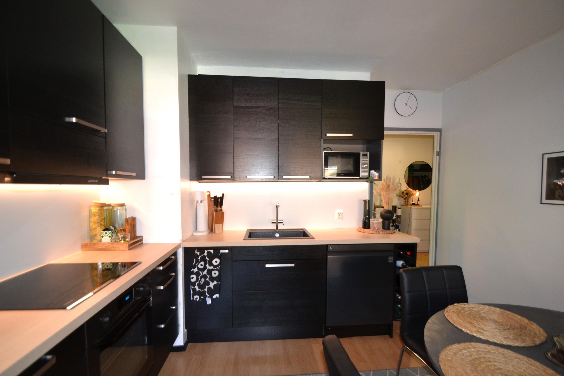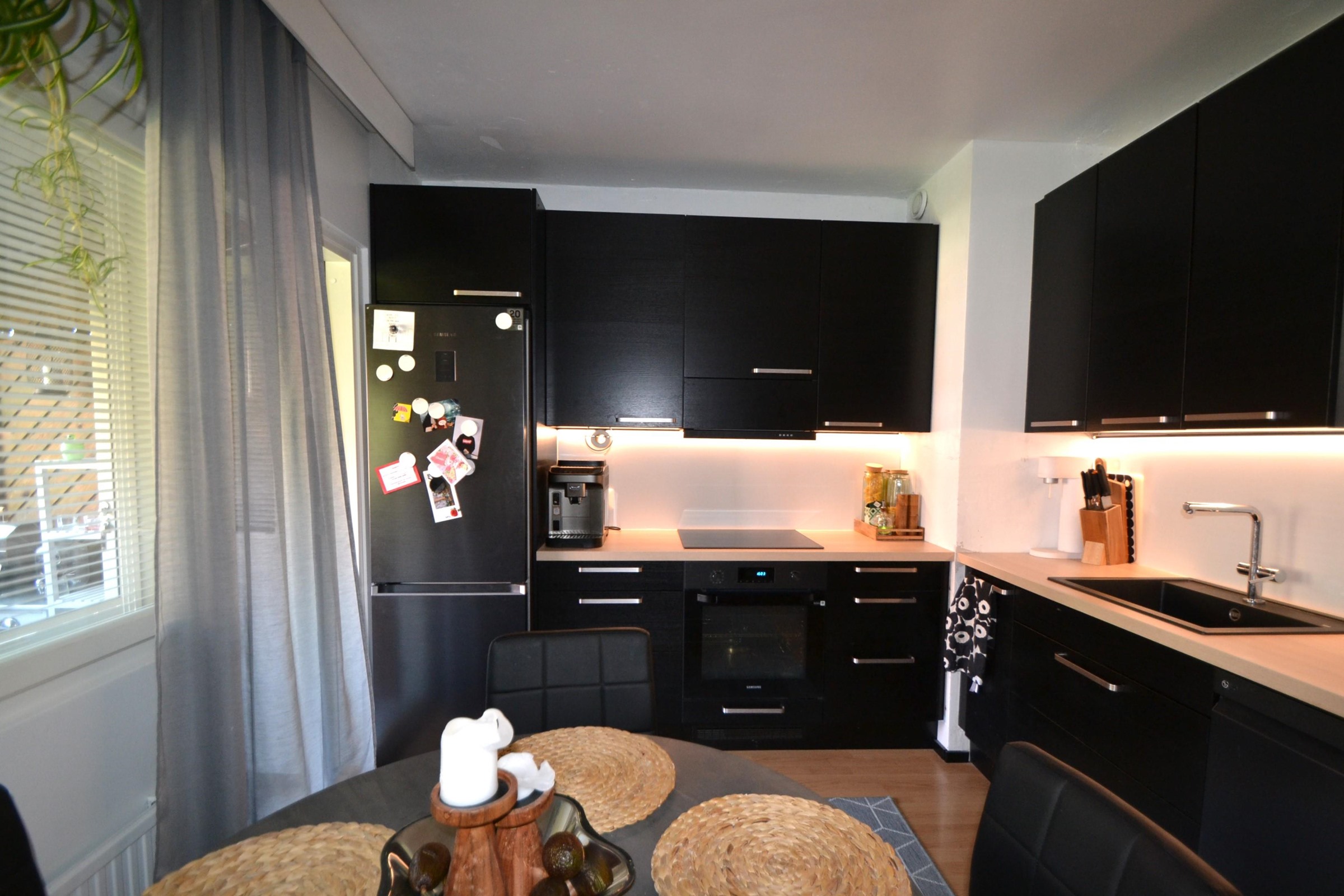 - Jääkaappipakastin, erillisuuni, induktioliesi, liesituuletin, astianpesukone, kaapistot.
