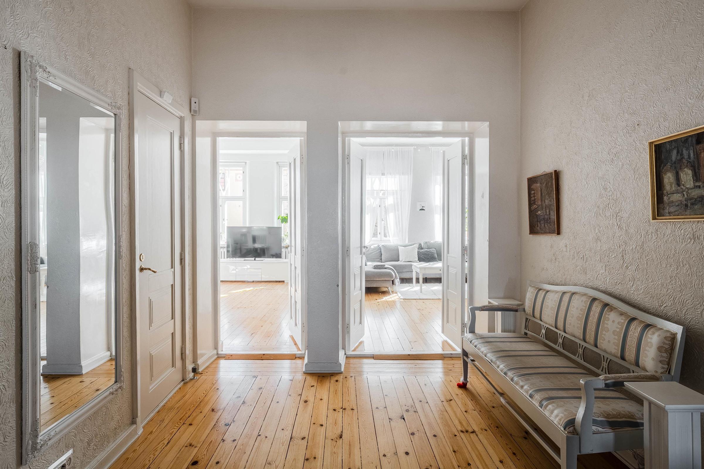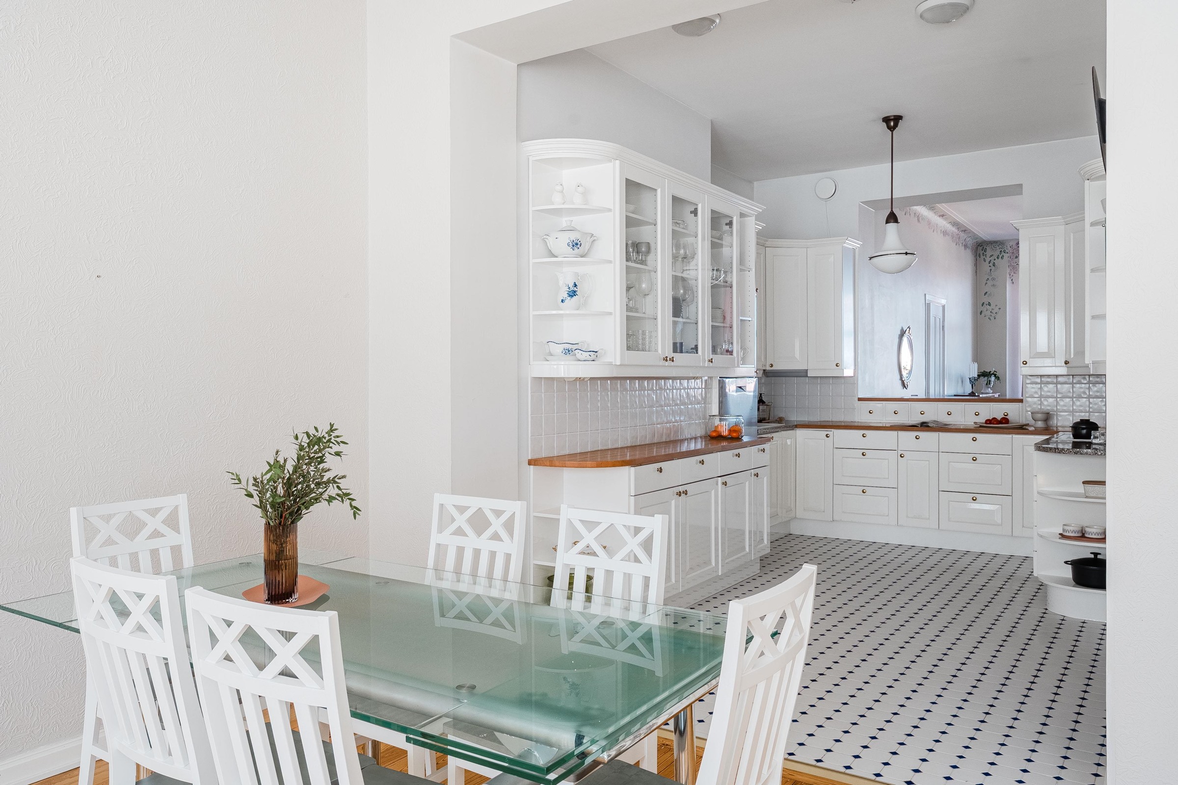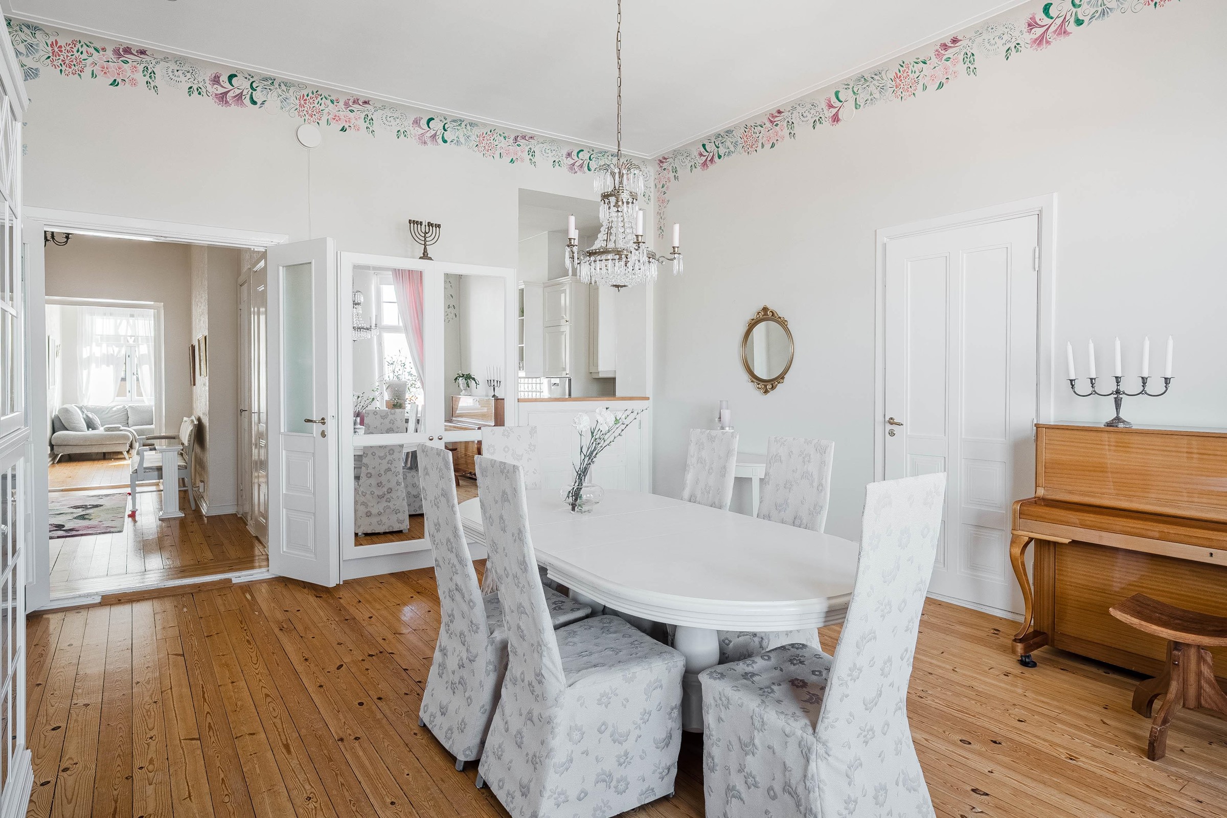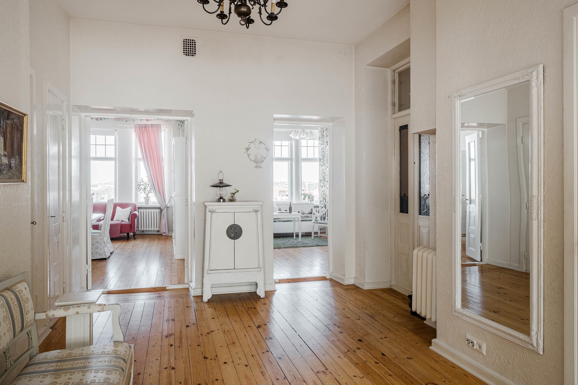 Asunnon henkeä on vaalittu tarkoin tehdyillä, aikaa kunnioittavilla remonteilla. Alkuperäiset piirteet, korkeat huoneet, suuret ikkunat ja kauniit yksityiskohdat ovat säilyneet ja nivoutuvat saumattomasti nykyaikaiseen asumismukavuuteen. Jokainen tila huokuu arvokkuutta, historiaa ja harkittua estetiikkaa.