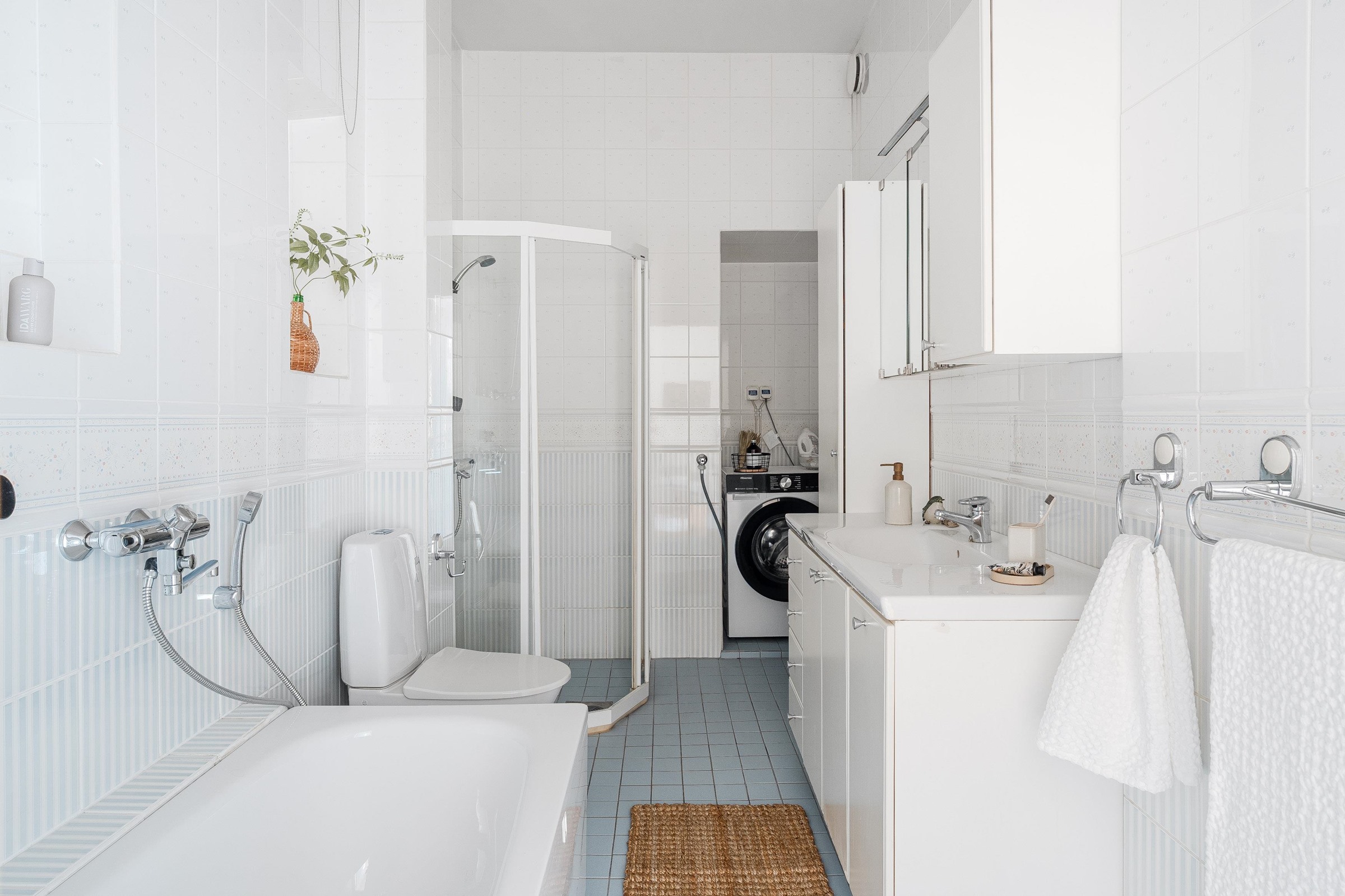 - Kylpyhuone, erillinen wc, suihku, suihkukaappi, amme, peilikaappi, kaapit, allaskaappi, pesukoneliitäntä, lattialämmitys, kiinteät valaisimet. Kuivauspatteri