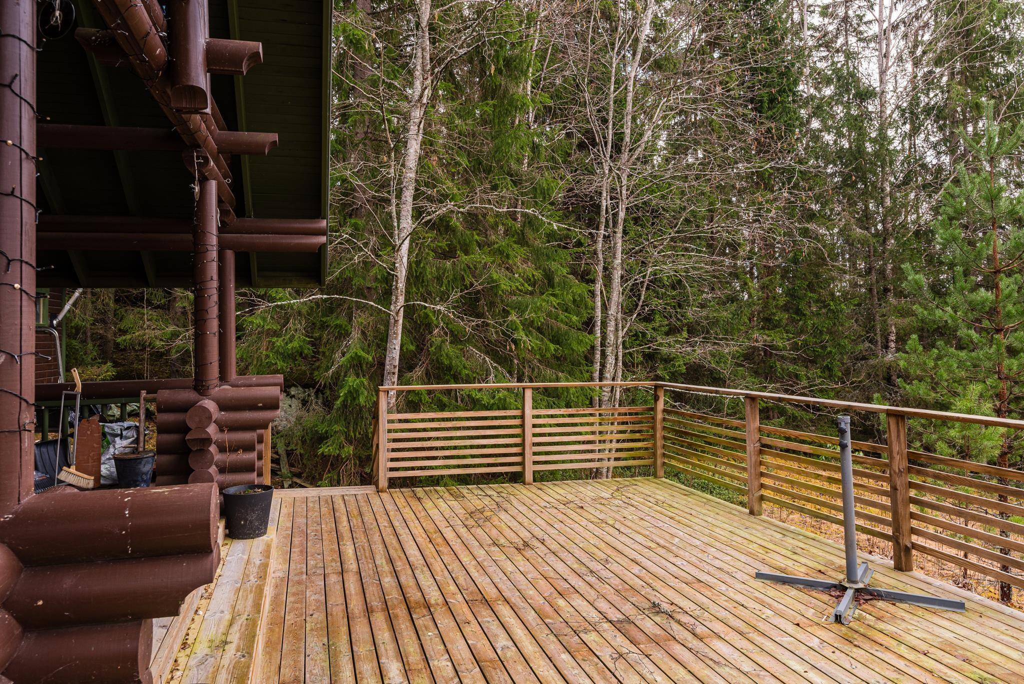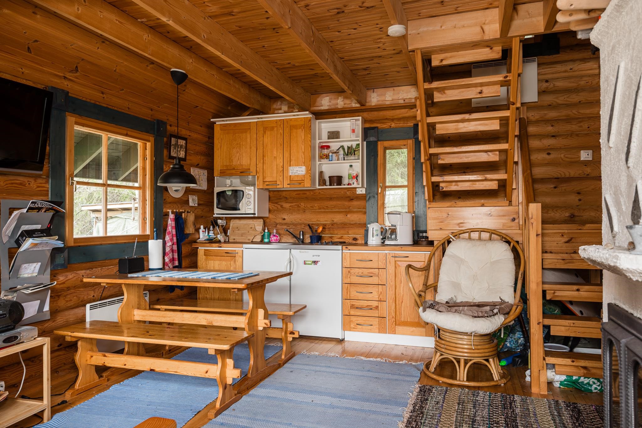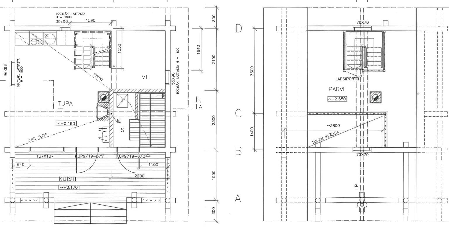 Olohuone: lautalattia. Sauna: laattalattia, paneeliseinät. parvi: lautalattia.