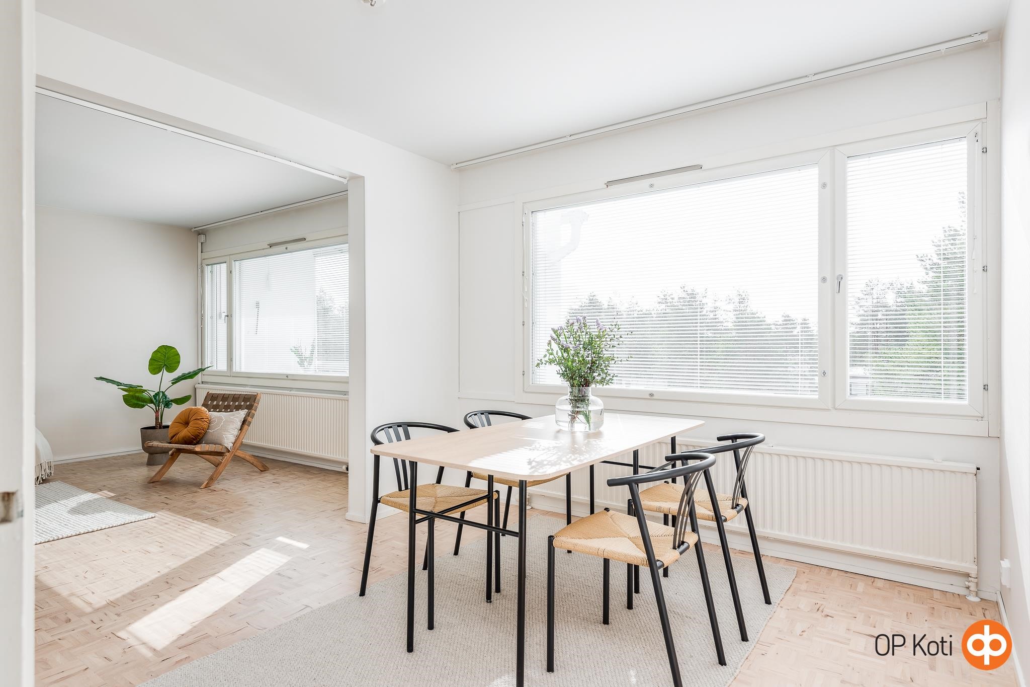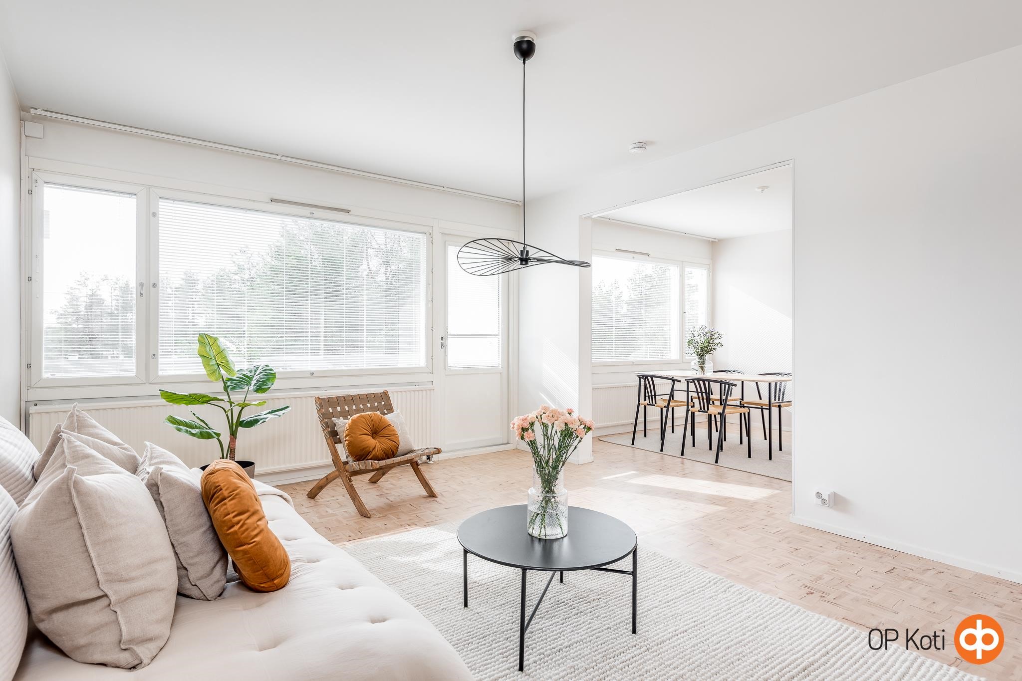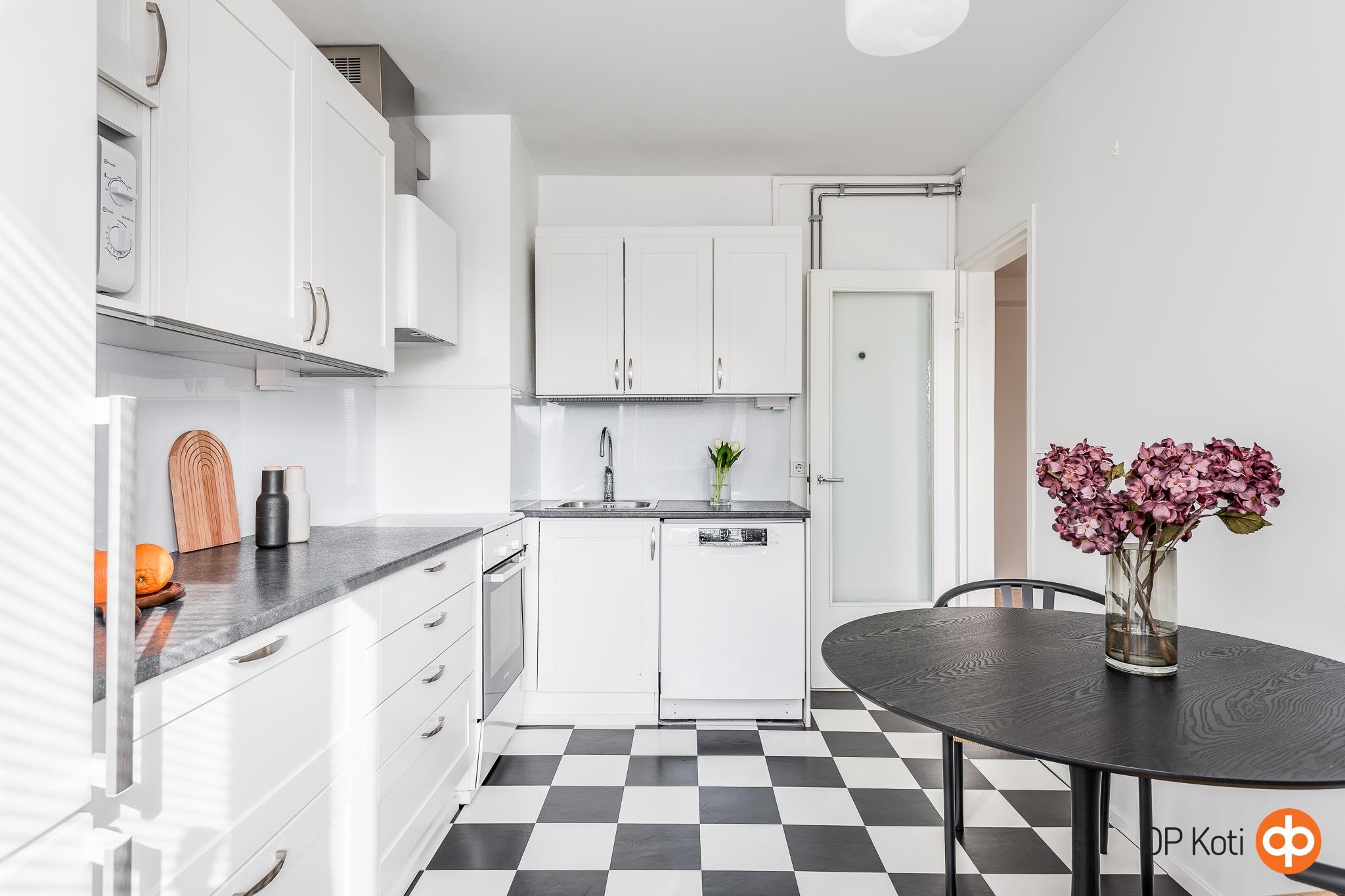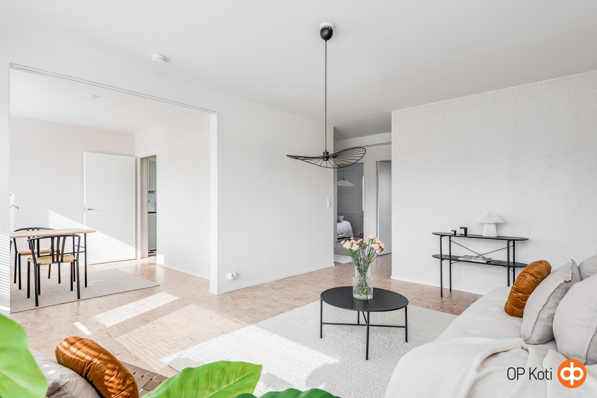 Asunnon selkeä ja tehokas pohjaratkaisu kattaa kolme makuuhuonetta, joista yksi sopii erinomaisesti myös ruokailutilaksi. Tilava olohuone yhdistyy saumattomasti muihin tiloihin ja tekee kodista avaran. Keittiössä on laadukkaat kodinkoneet, kuten induktioliesi, astianpesukone ja jääkaappipakastin, ja säilytystilaa löytyy runsaasti kaapistoista. Remontoitu kylpyhuone on varustettu lattialämmityksellä, ja erillinen wc tuo arkeen sujuvuutta. Kellarikomerot tarjoavat lisää säilytysratkaisuja, ja mahdollisuus kahteen varastotilaan helpottaa arjen järjestystä.