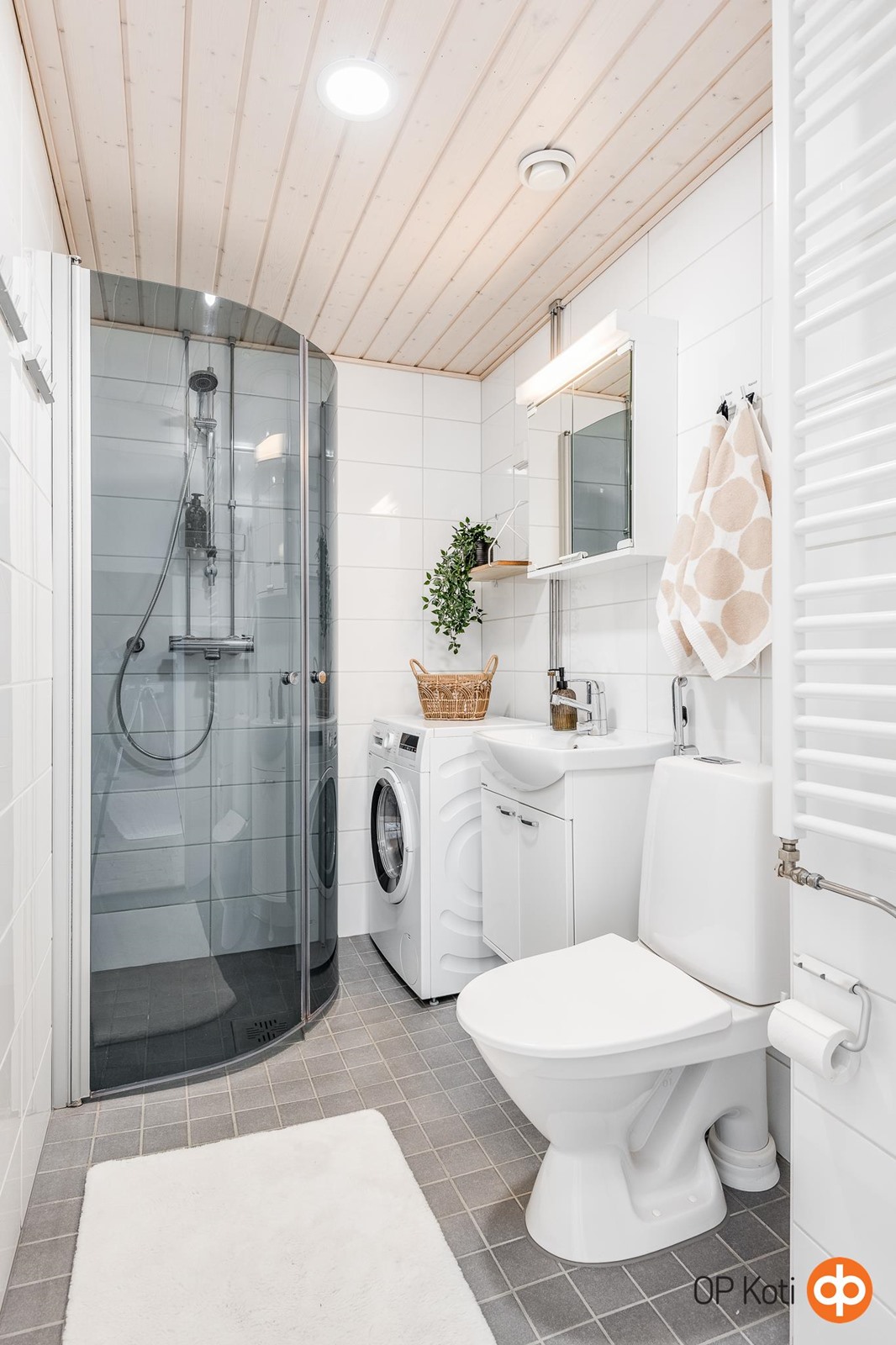 - Kylpyhuone, erillinen wc, suihku, suihkuseinä, peilit, peilikaappi, kaapit, allaskaappi, pesukoneliitäntä, lattialämmitys, kiinteät valaisimet. pesuhuone ja erillinen wc remontoitu linjasaneerauksen yhteydessä v. 2018.