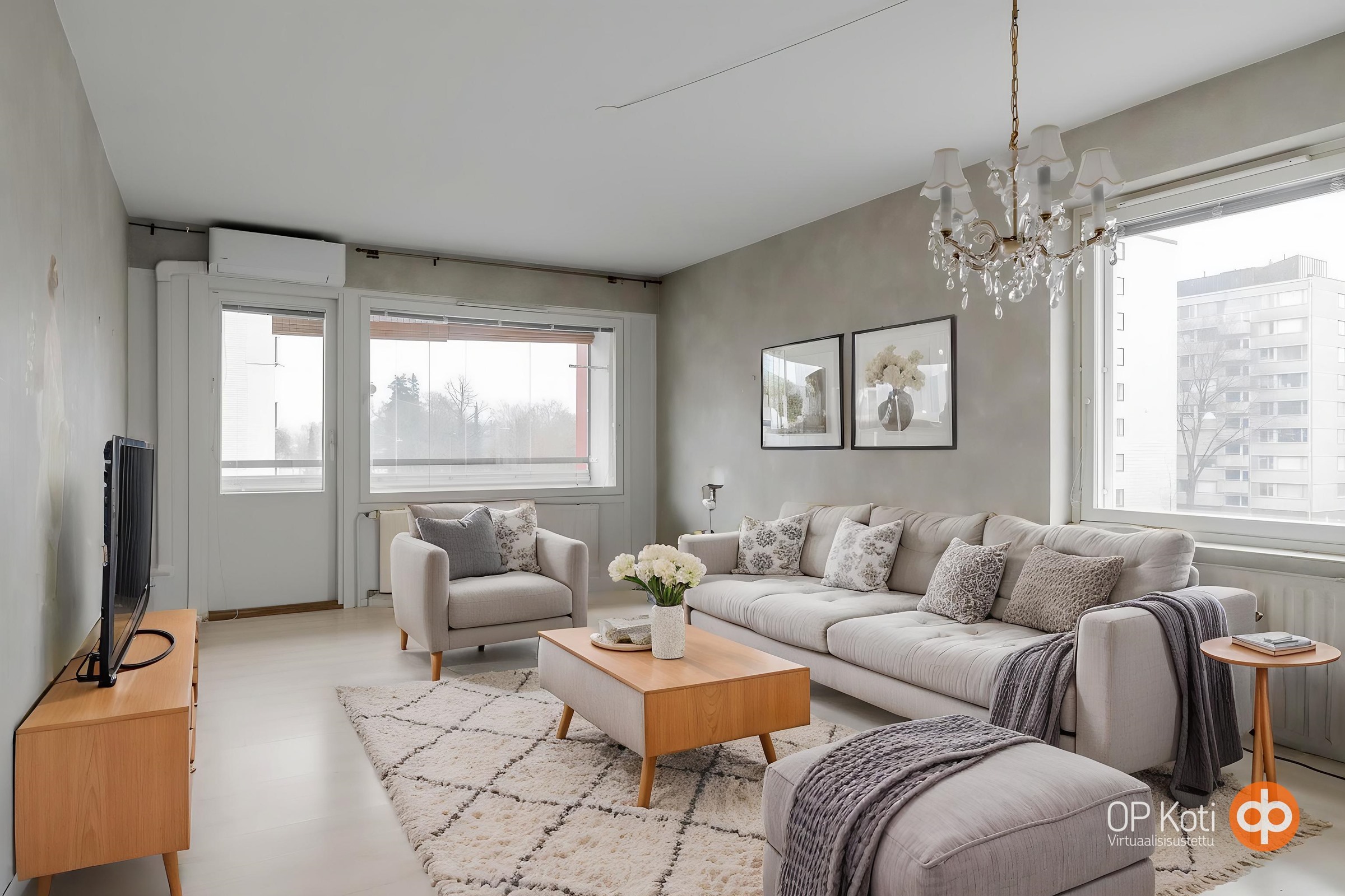 Pohjaratkaisu on selkeä ja käytännöllinen: kaksi makuuhuonetta, olohuone, keittiö sekä kylpyhuone/WC muodostavat toimivan kokonaisuuden. Asunnon erityispiirteenä ovat kaksi vierekkäistä parveketta samaan ilmansuuntaan, jotka tuovat mukavasti lisätilaa ja mahdollisuuksia oleskeluun. Vuonna 2022 asennettu ilmalämpöpumppu lisää asumismukavuutta erityisesti kesäaikaan.