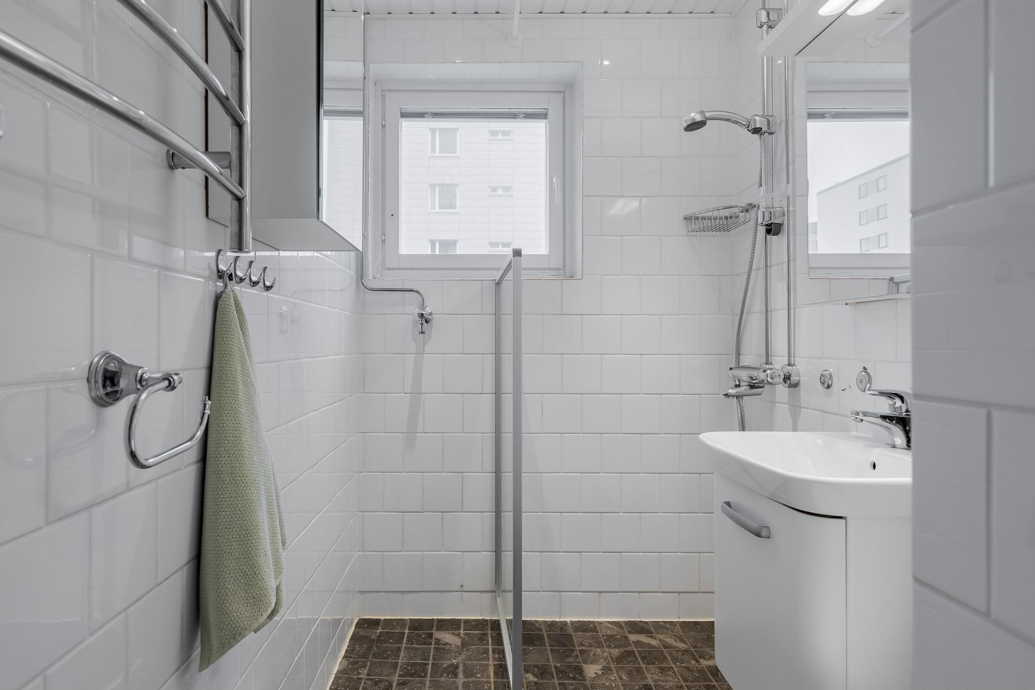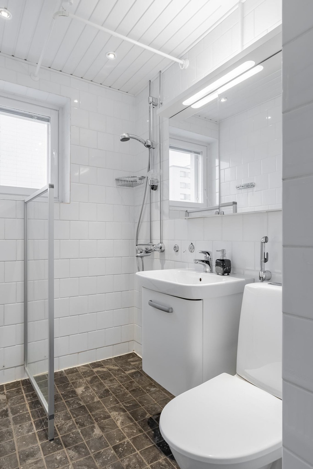 - Kylpyhuone, suihku, suihkuseinä, peilikaappi 2 kpl:tta, allaskaappi, pesukoneliitäntä, kiinteät valaisimet, pyyhekuivain ja ikkuna.