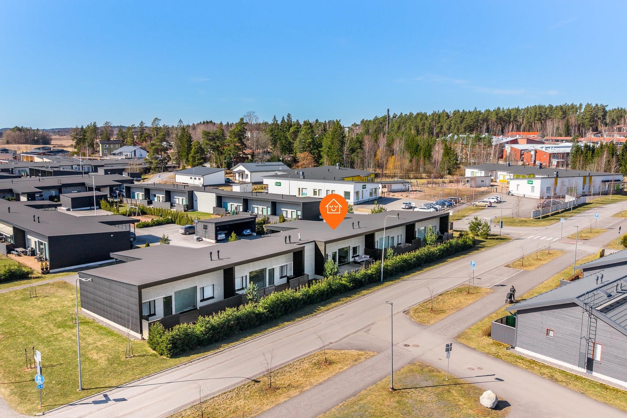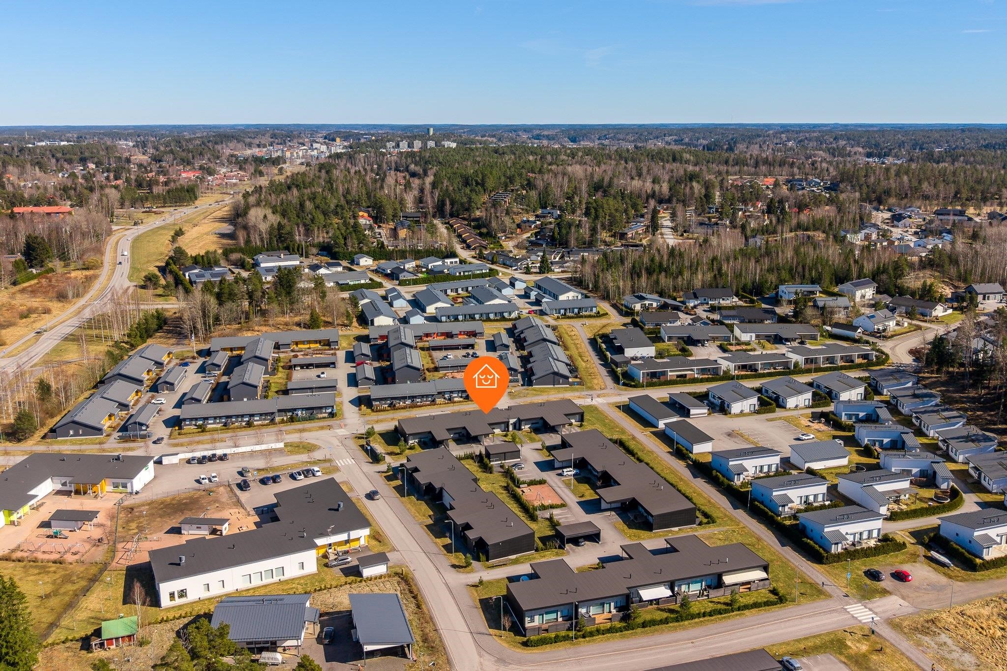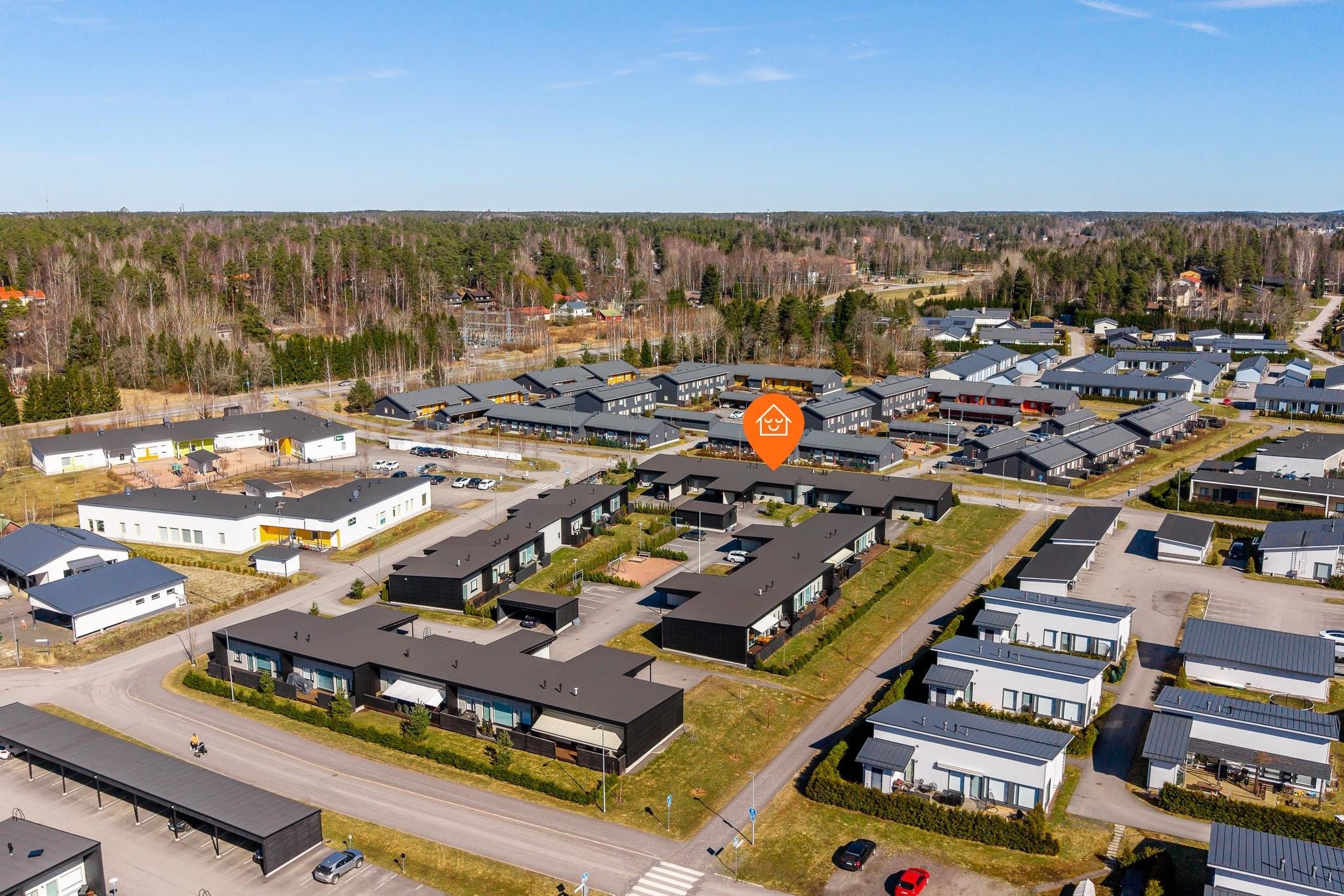 Sijainti on erityisen lapsiystävällinen ja toimiva. Päiväkoti löytyy aivan vierestä ja koulu on lyhyen matkan päässä, mikä tekee arjen sujumisesta vaivatonta. Lisäksi Prisma sekä Kaarinan kattavat palvelut, kuten kaupat, ravintolat ja muut arjen tärkeät kohteet, ovat kaikki kävelyetäisyydellä. Alue tarjoaa myös hyvät liikenneyhteydet niin Turun suuntaan kuin muualle Kaarinaan.