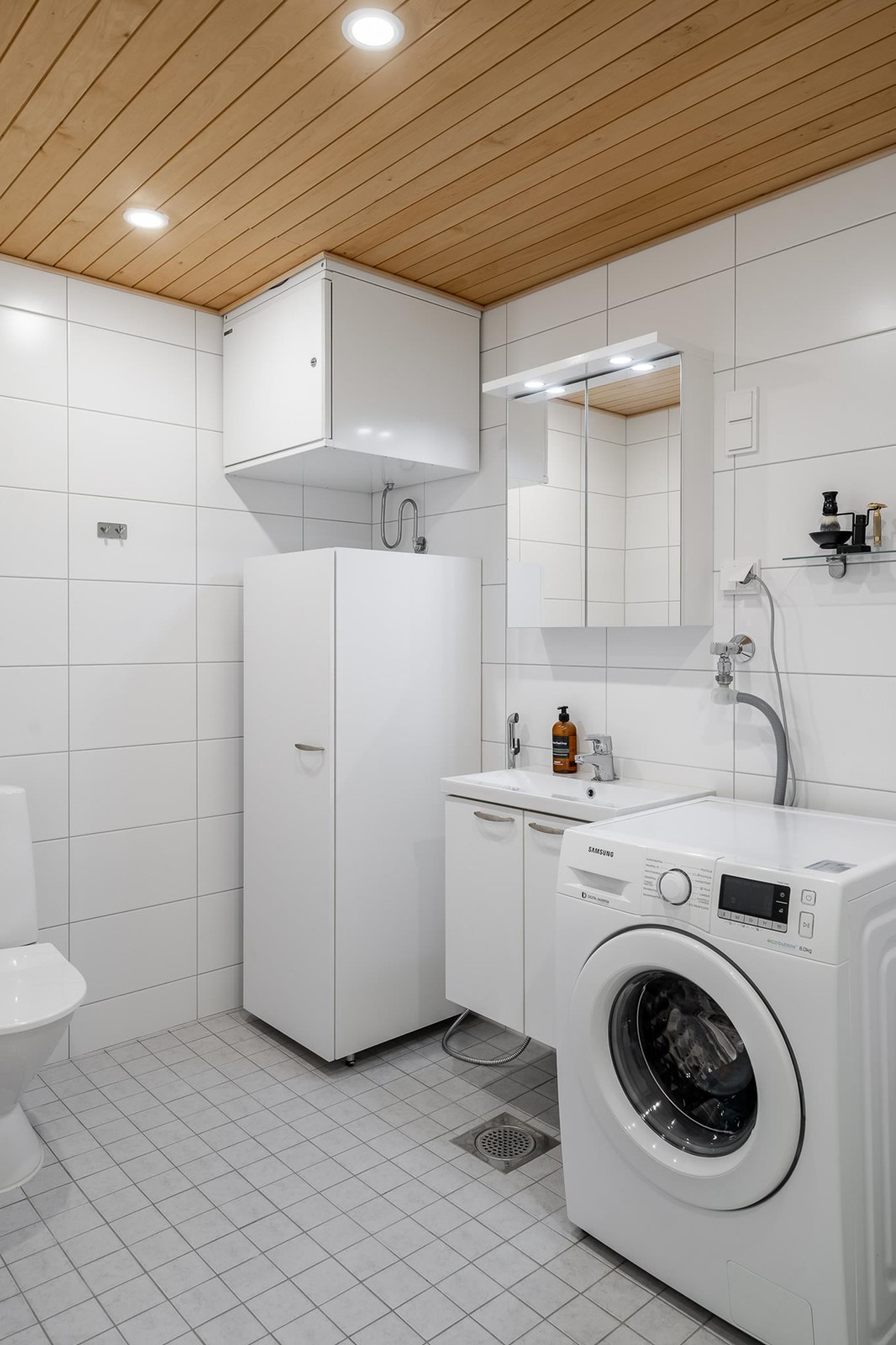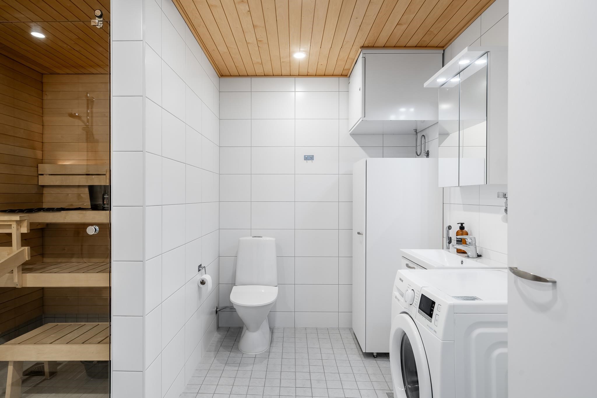- Sauna, sähkökiuas, erillinen wc peilikaappi löytyy, suihku, peilikaappi, kaapit, pesukoneliitäntä, lattialämmitys, kiinteät valaisimet.