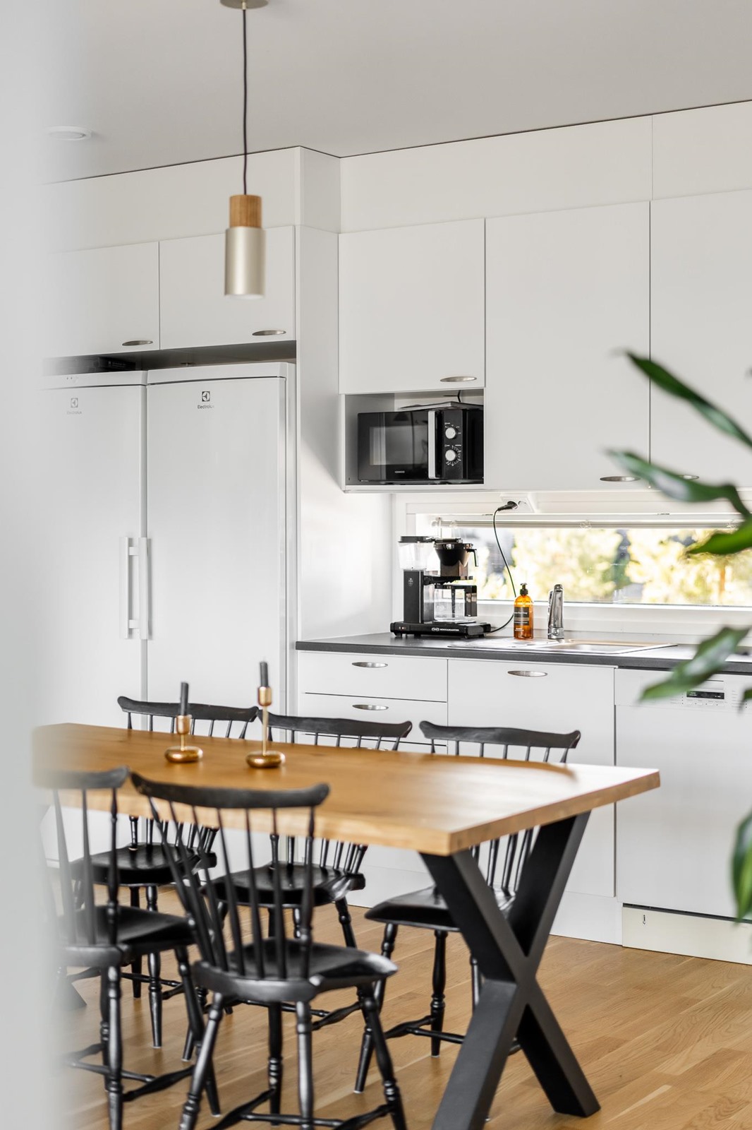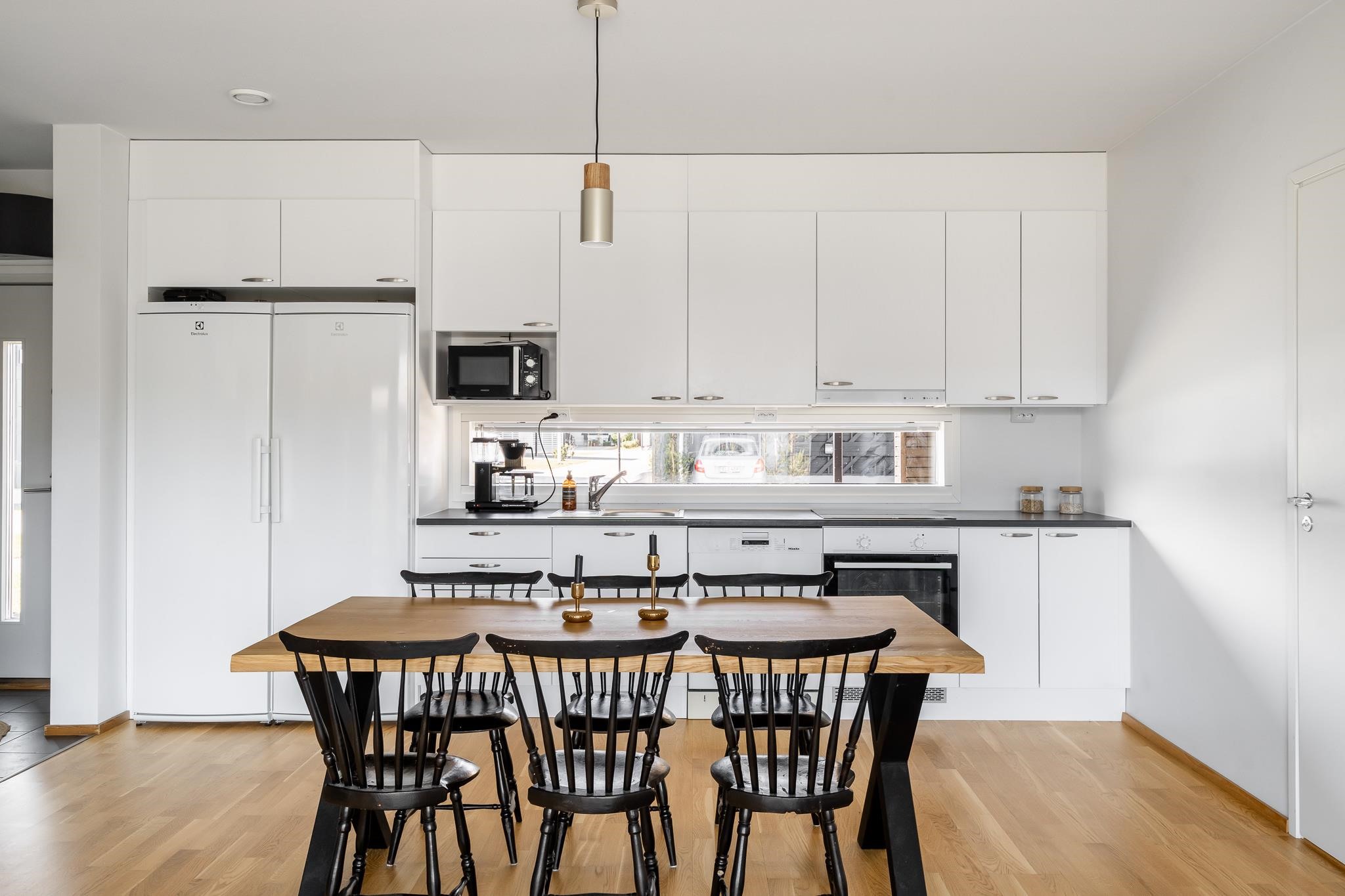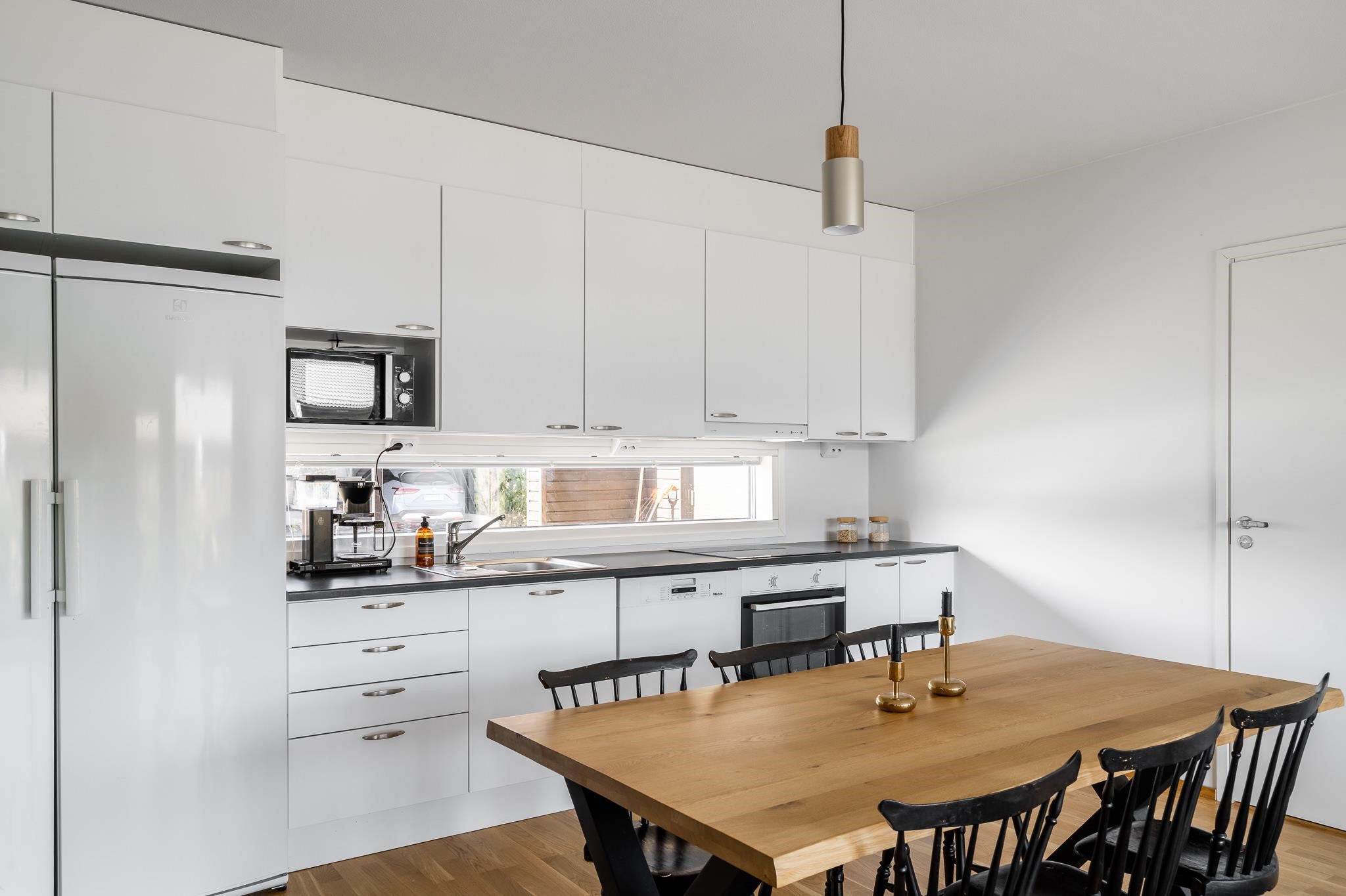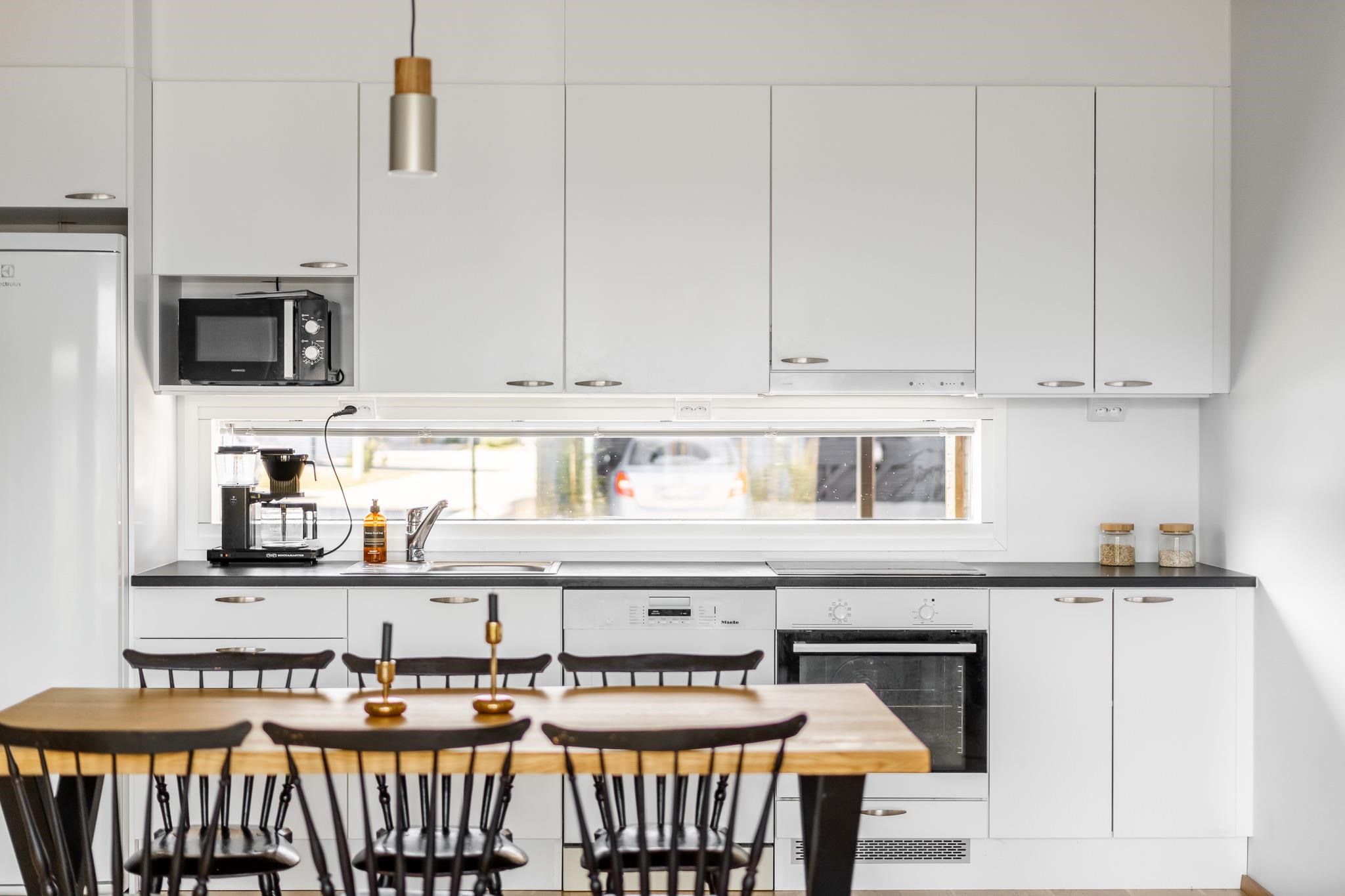 - Jääkaappi, pakastekaappi, erillisuuni, keraaminen liesi, liesituuletin, astianpesukone, kaapistot, kiinteät valaisimet.