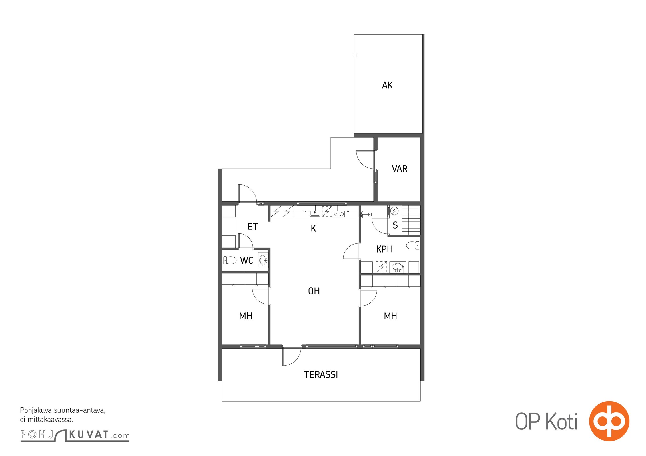 - 3h + avokeittiö + kph + s + erillinen wc + varasto (YJ: 3h + kt + s)