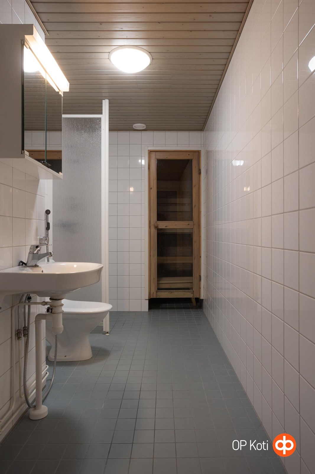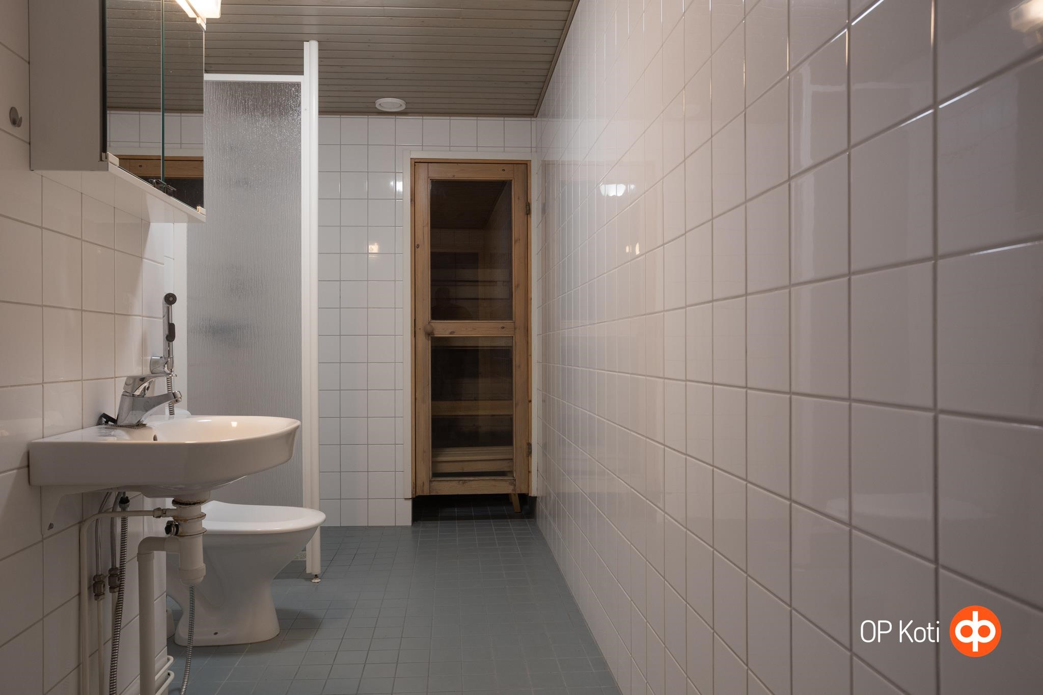 - Sauna, sähkökiuas, kylpyhuone, suihku, suihkuseinä, peilikaappi, pesukoneliitäntä, lattialämmitys, kiinteät valaisimet.