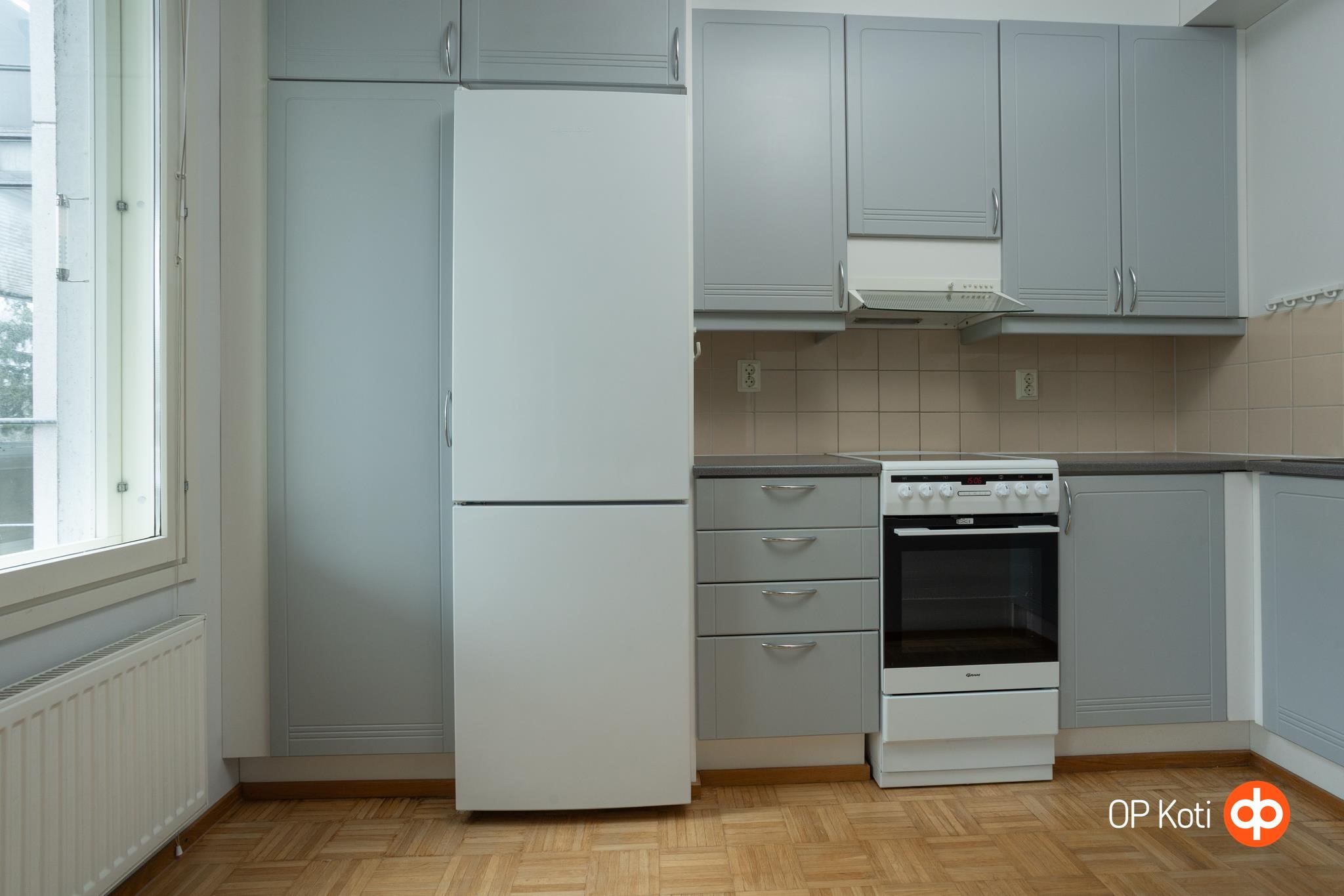 - Jääkaappipakastin, keraaminen liesi, liesituuletin, kaapistot, kiinteät valaisimet.