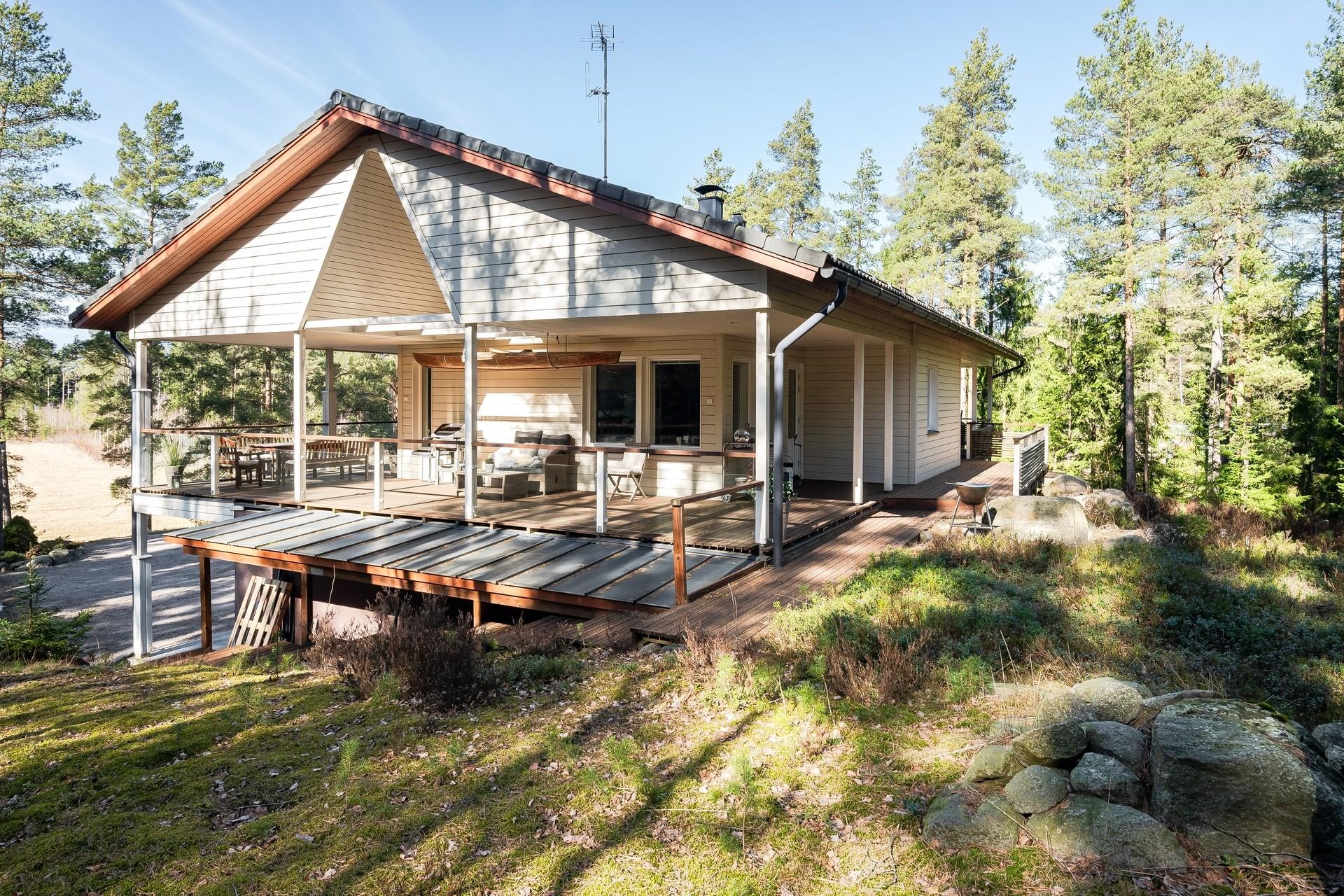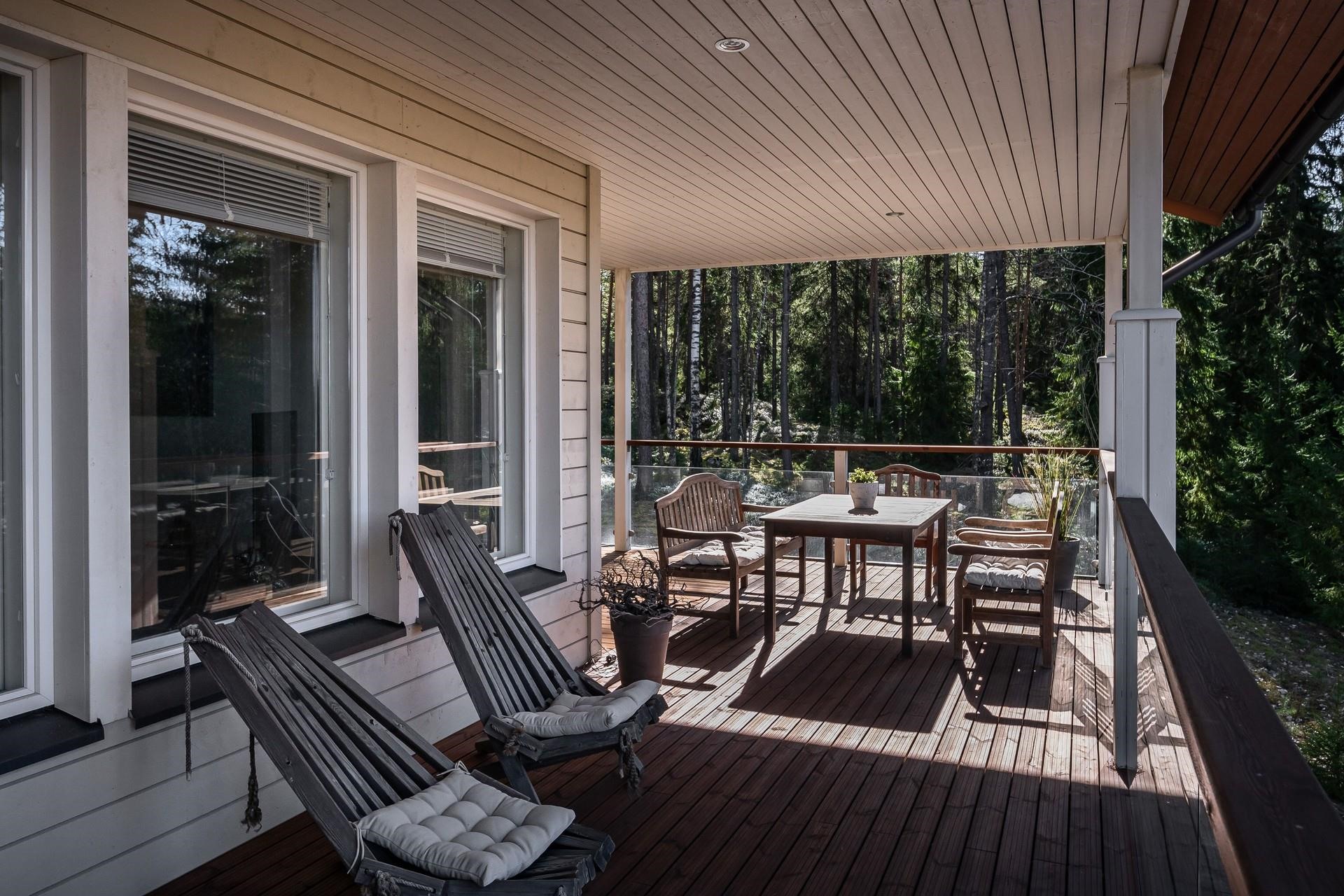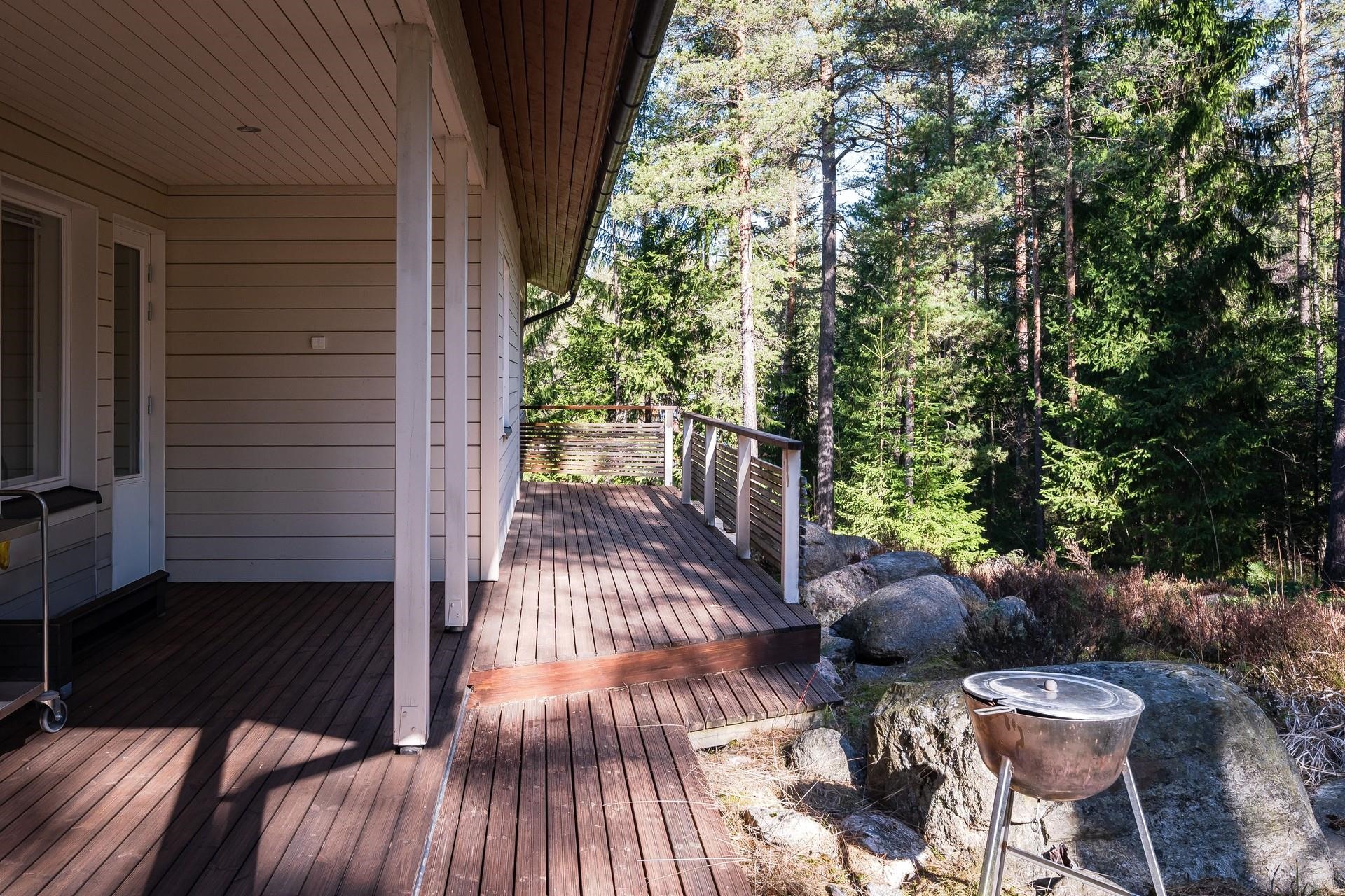 Terassi kattaa talon ympäri melkein 3/4. Lähes aina halutessaan voi paistatella auringossa. Vahdontieltä noin 800 metriä, eli kohtuullisen isoa tietä, kuitenkin hyvin rauhallisessa ja suojaisessa paikassa. Syksyllä pääsee marjastamaan omalle takapihalle.