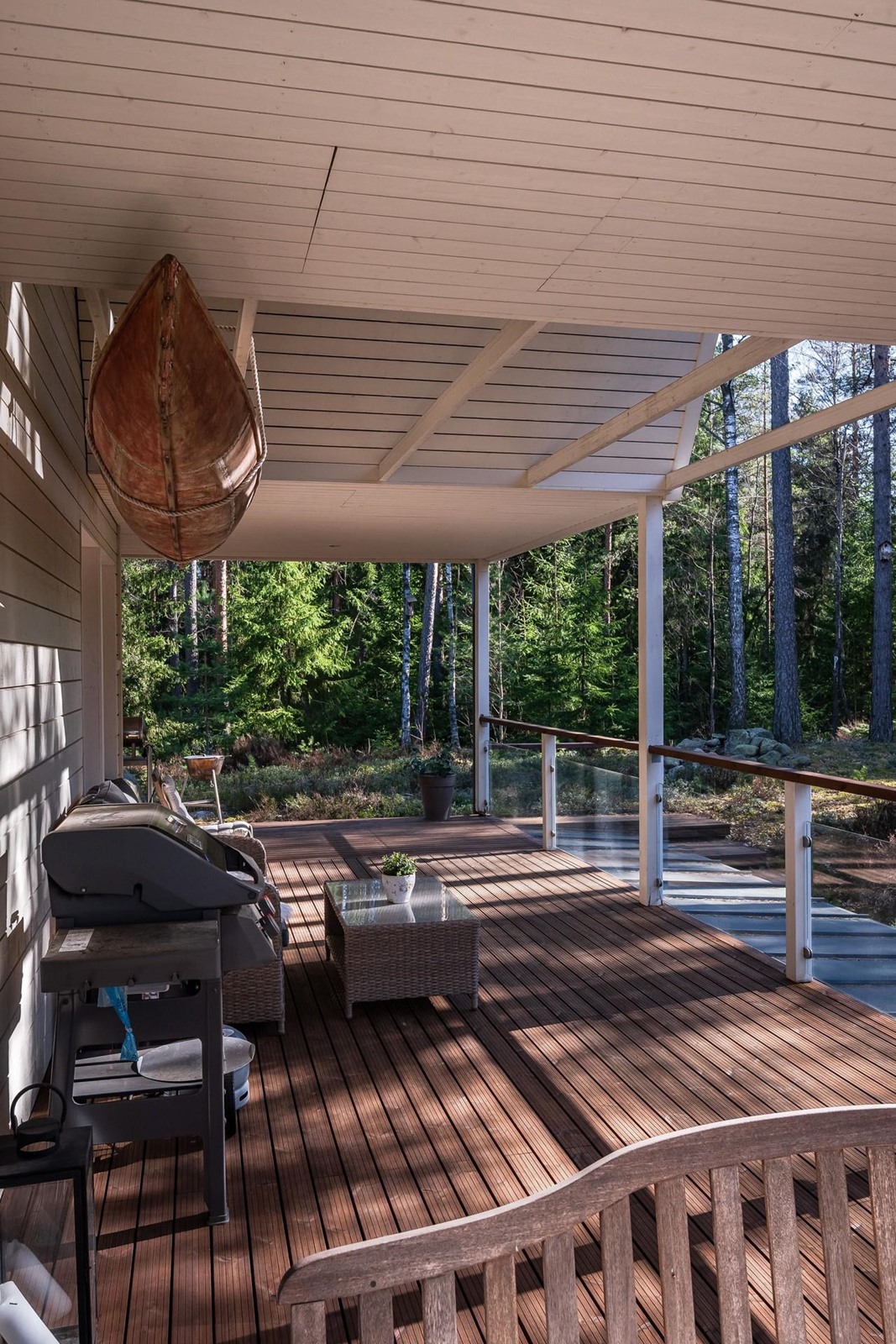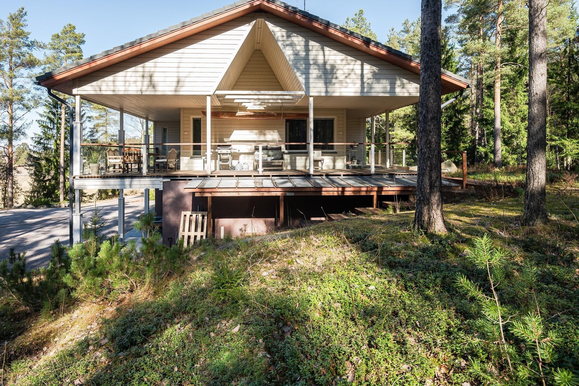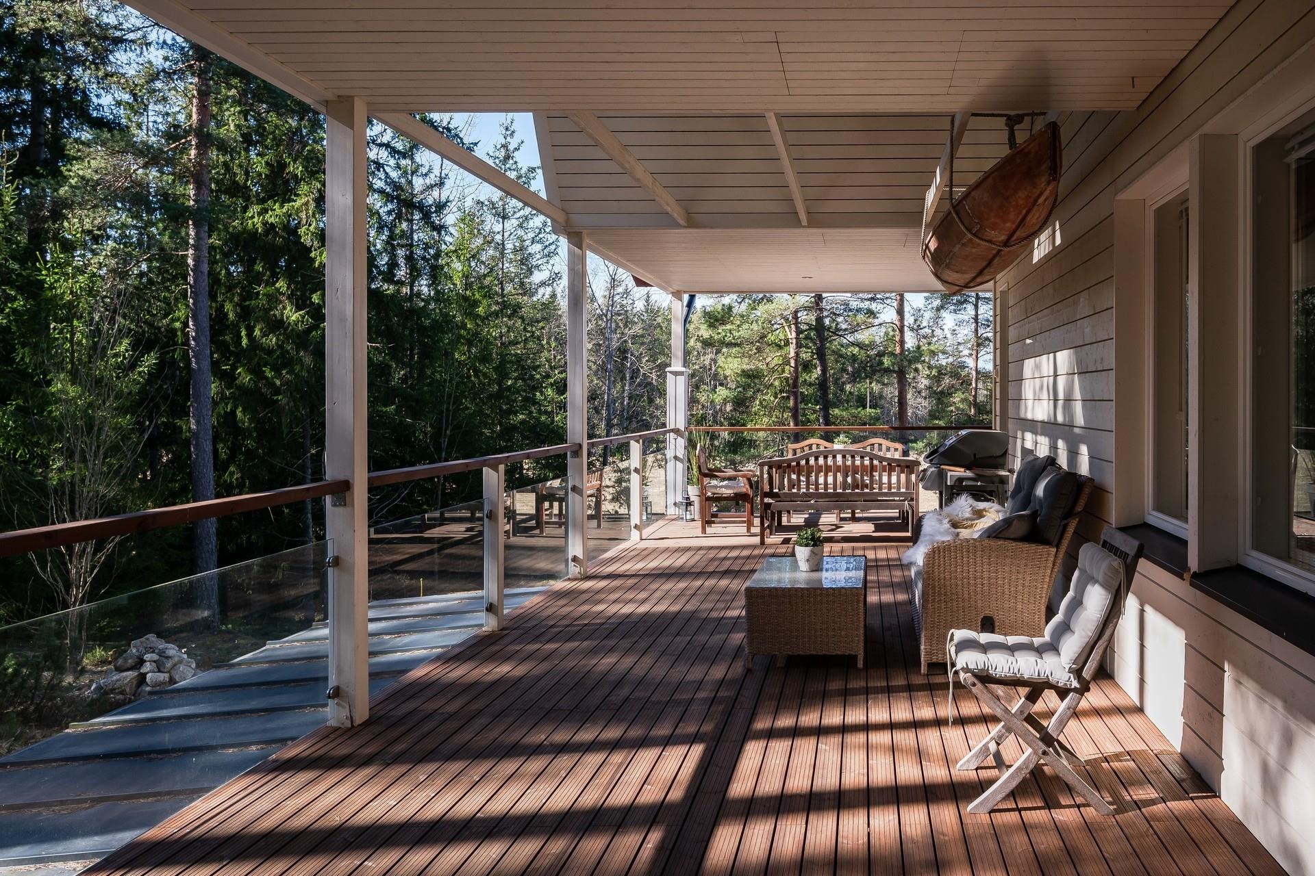 Terassi kattaa talon ympäri melkein 3/4. Lähes aina halutessaan voi paistatella auringossa. Vahdontieltä noin 800 metriä, eli kohtuullisen isoa tietä, kuitenkin hyvin rauhallisessa ja suojaisessa paikassa. Syksyllä pääsee marjastamaan omalle takapihalle.