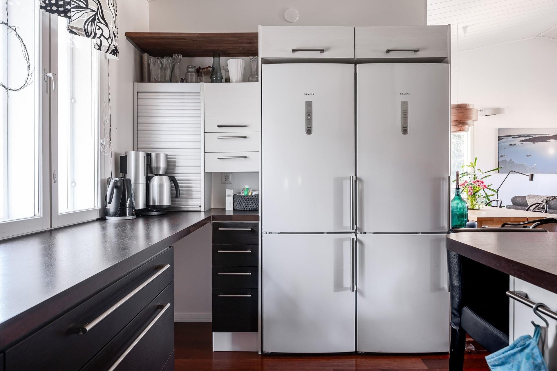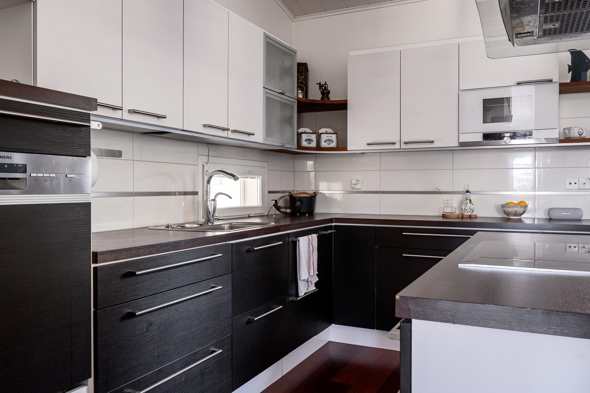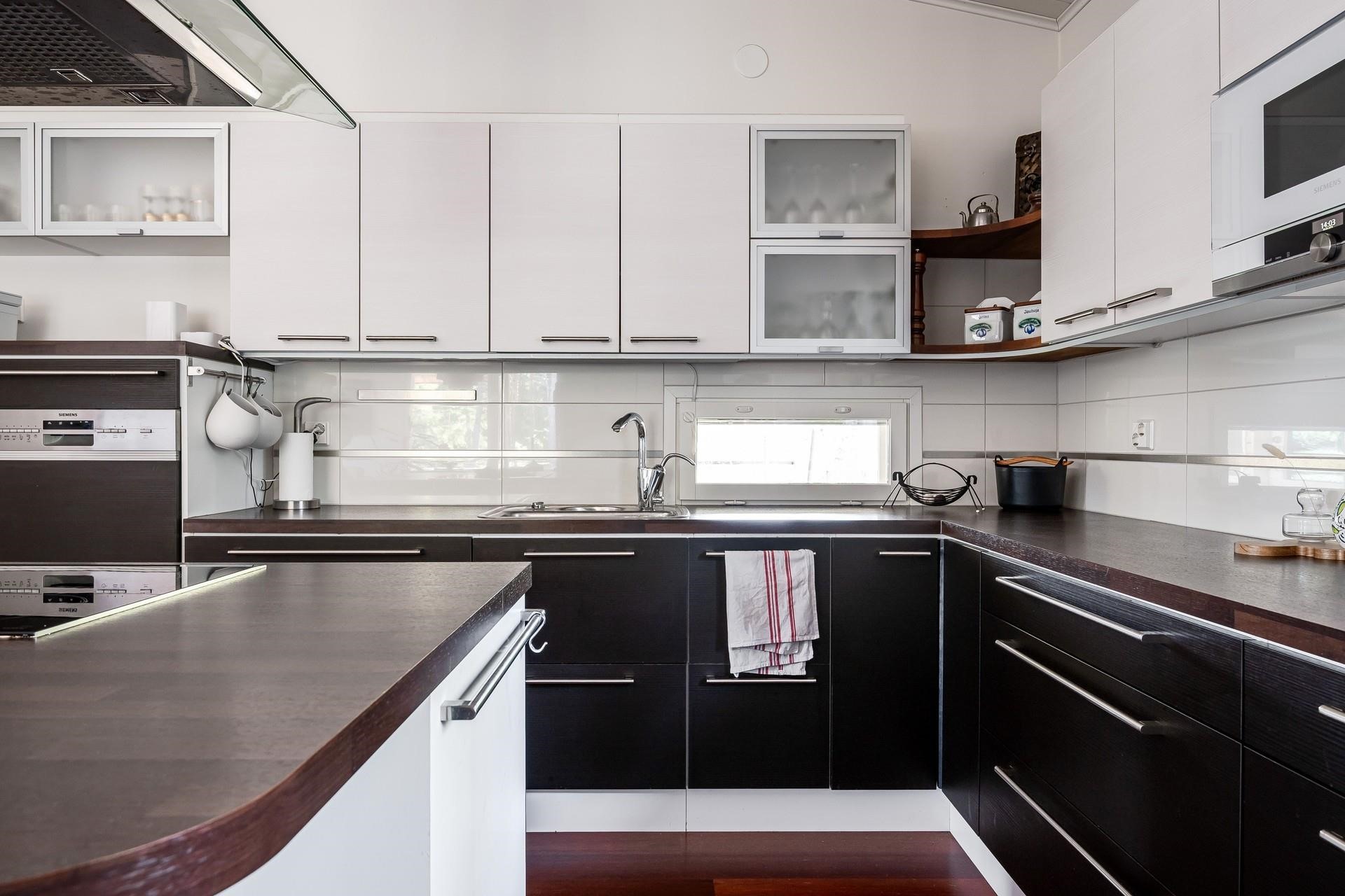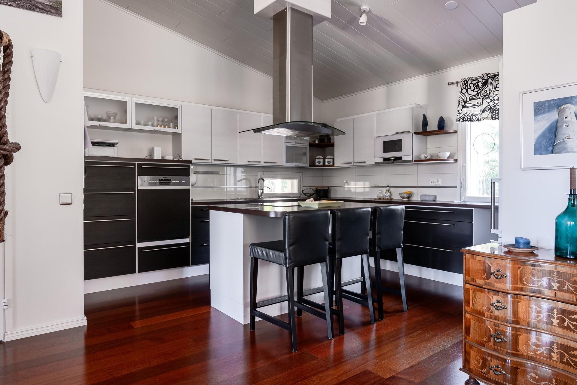 - Jääkaappipakastin 2kpl, erillisuuni, liesitaso, induktioliesi, liesituuletin, mikroaaltouuni, astianpesukone, irralliset saarekkeet, kiinteät valaisimet, pöytätasojen materiaali laminaatti.