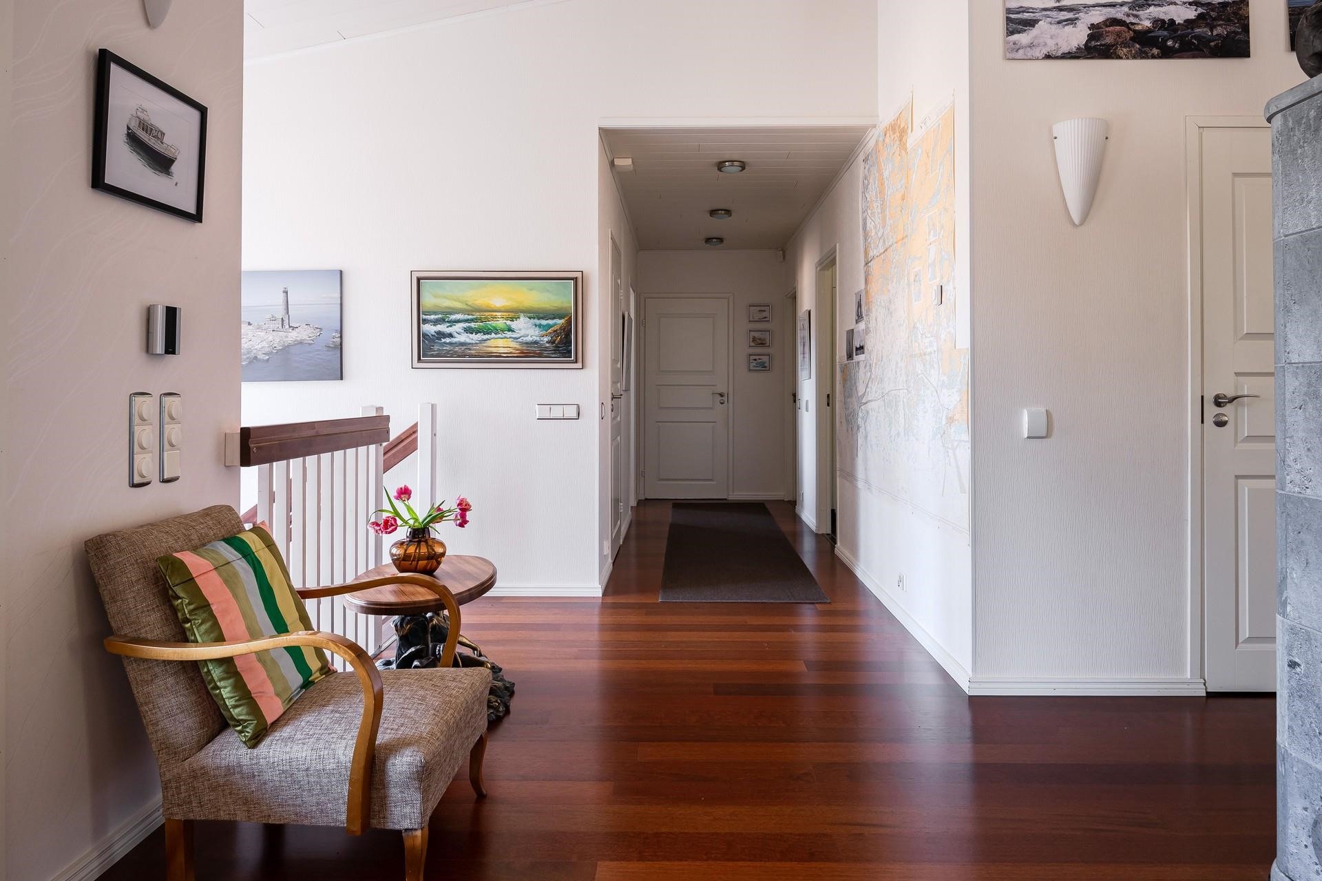 Keittiö: parkettilattia, seinät maalattu. Olohuone: parkettilattia, seinät tapetoitu. Makuuhuone 1: (yk) parkettilattia, seinät tapetoitu. Makuuhuone 2: (yk) parkettilattia, seinät tapetoitu. Makuuhuone 3: (ak) parkettilattia, seinät tapetoitu. Kodinhoitohuone: laattalattia, seinät maalattu. Sauna: paneloitu. Kylpyhuone: kokonaan laatoitettu. Eteinen: /th laattalattia, seinät lasikuitutapettia. Askarteluhuone, kerhohuone: /mediahuone parkettilattia, seinät maalattu. Wc: laatoitettu. makuuhuone 4: (ak) parkettilattia, seinät tapetoitu. työhuone: (ak) parkettilattia, seinät tapetoitu. apukeittiö/varasto: parkettilattia. vaatehuone, molemmissa kerroksissa: parkettilattia.