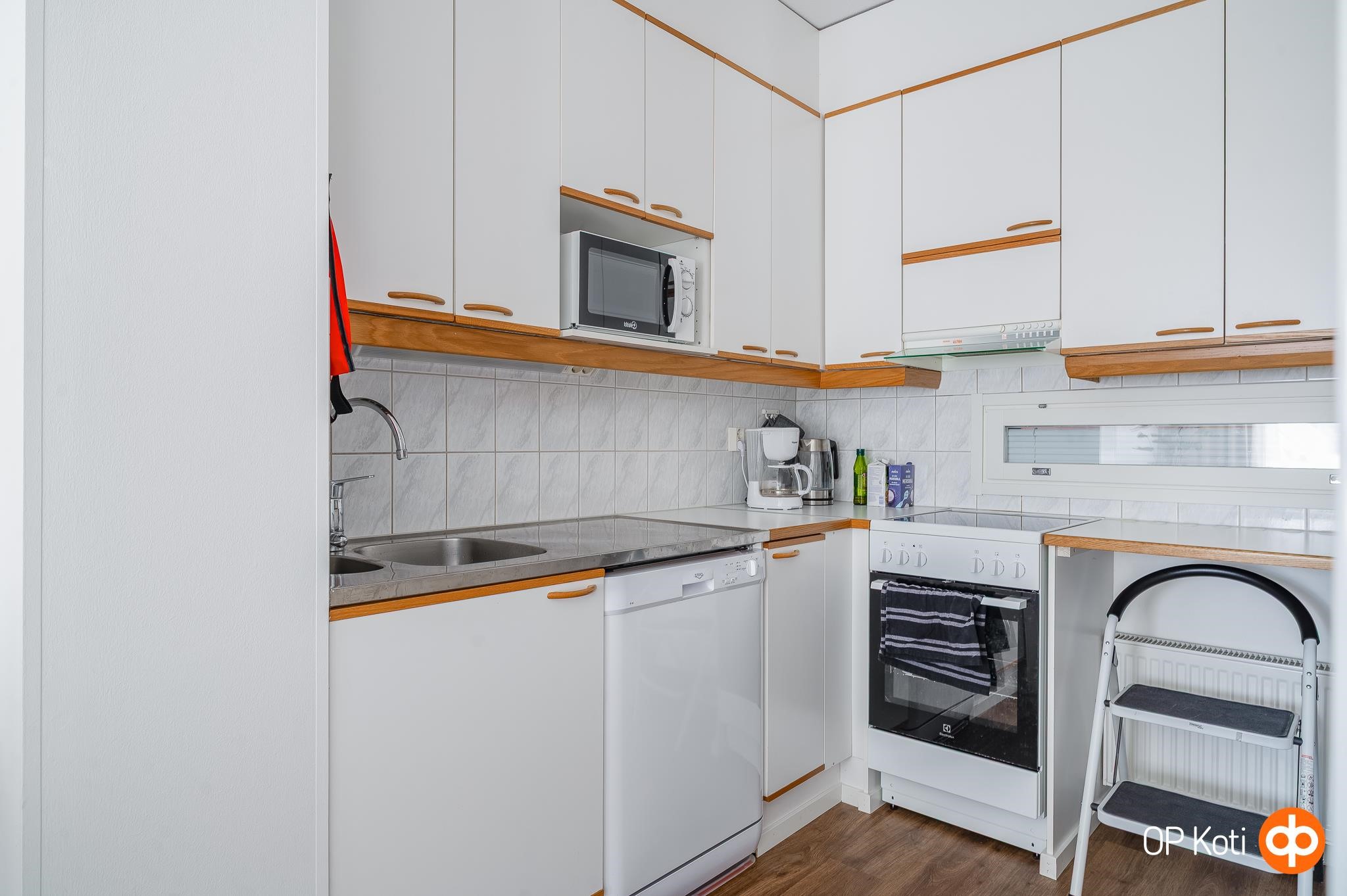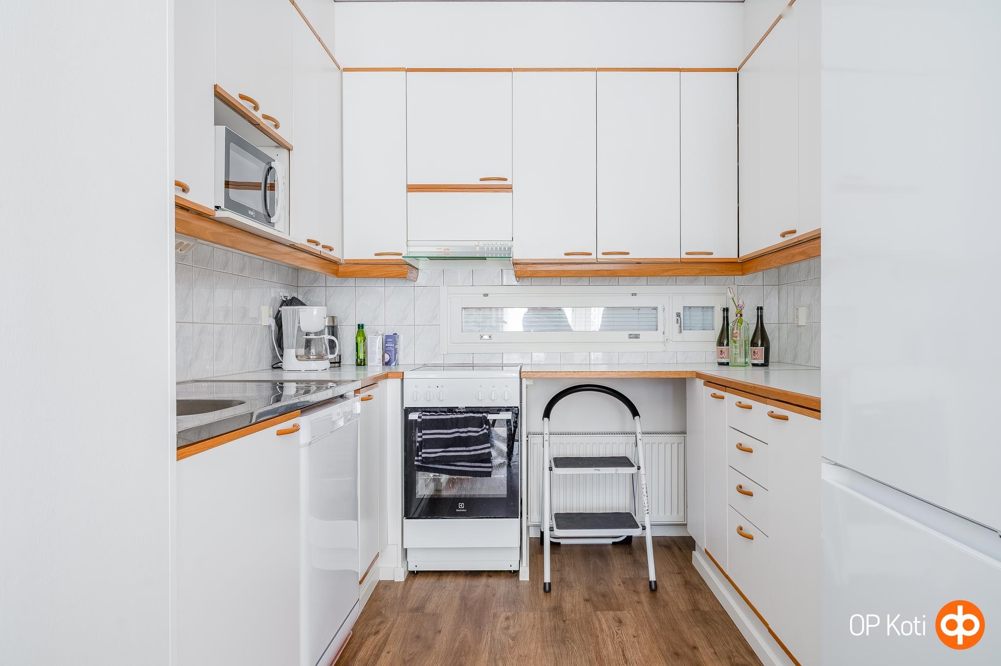 - Jääkaappi, lattialiesi, keraaminen liesi, liesikupu, astianpesukone, kaapistot, kiinteät valaisimet.