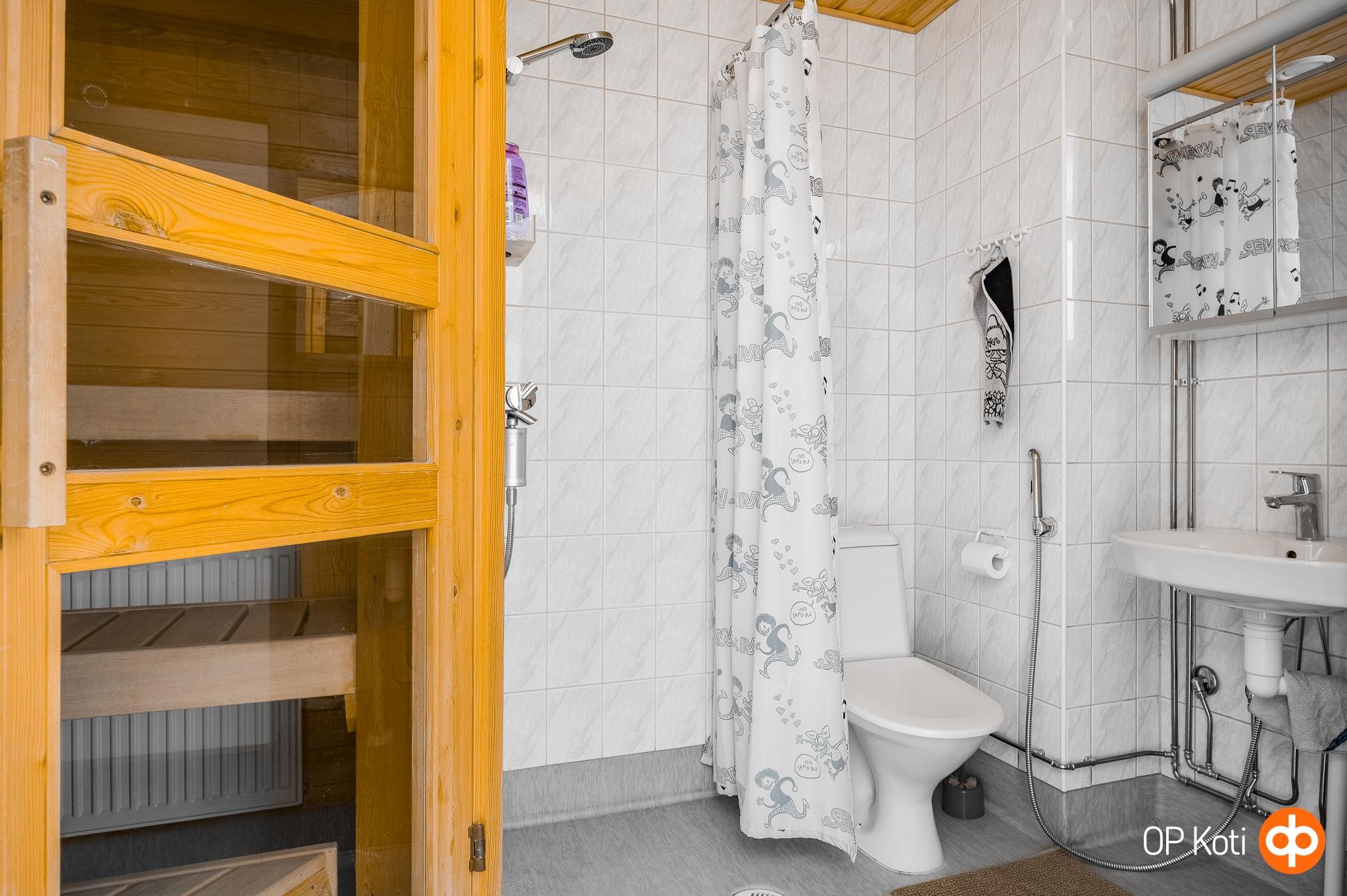 - Sauna, sähkökiuas, kylpyhuone, suihku, peilikaappi, pesukoneliitäntä, lattialämmitys, kiinteät valaisimet.