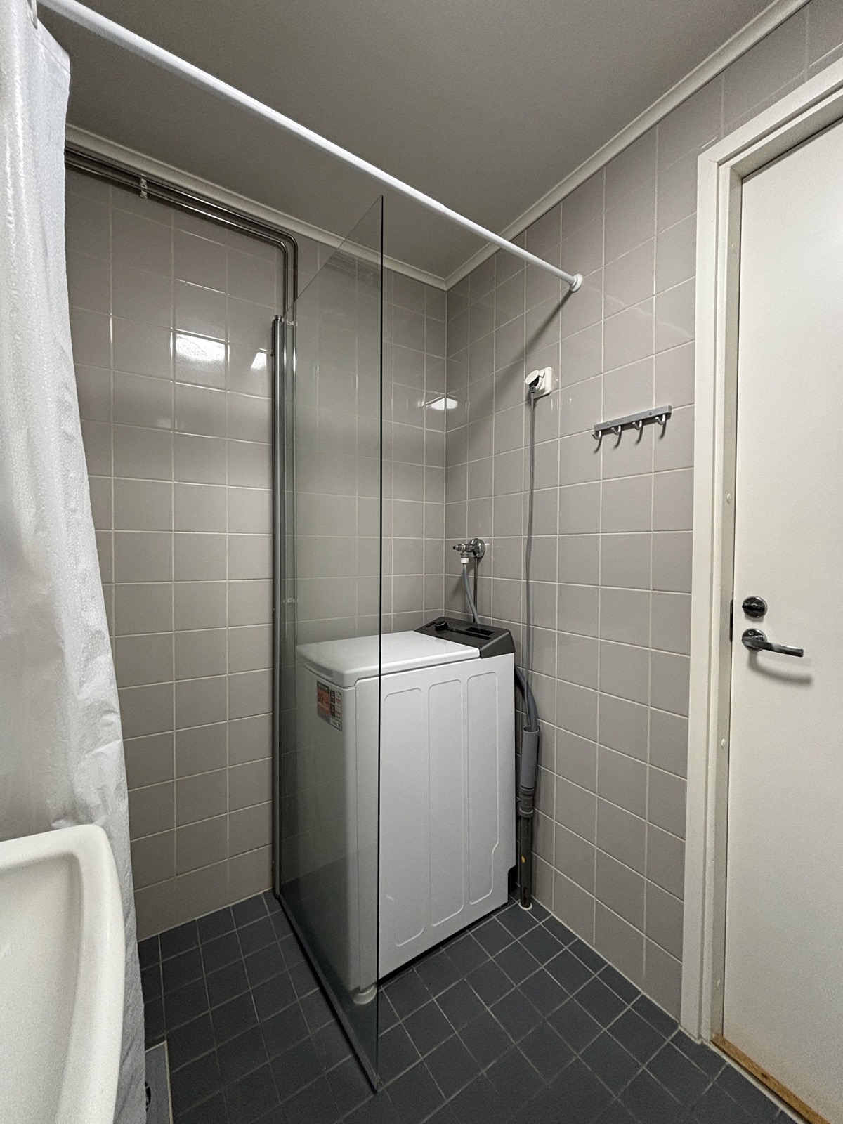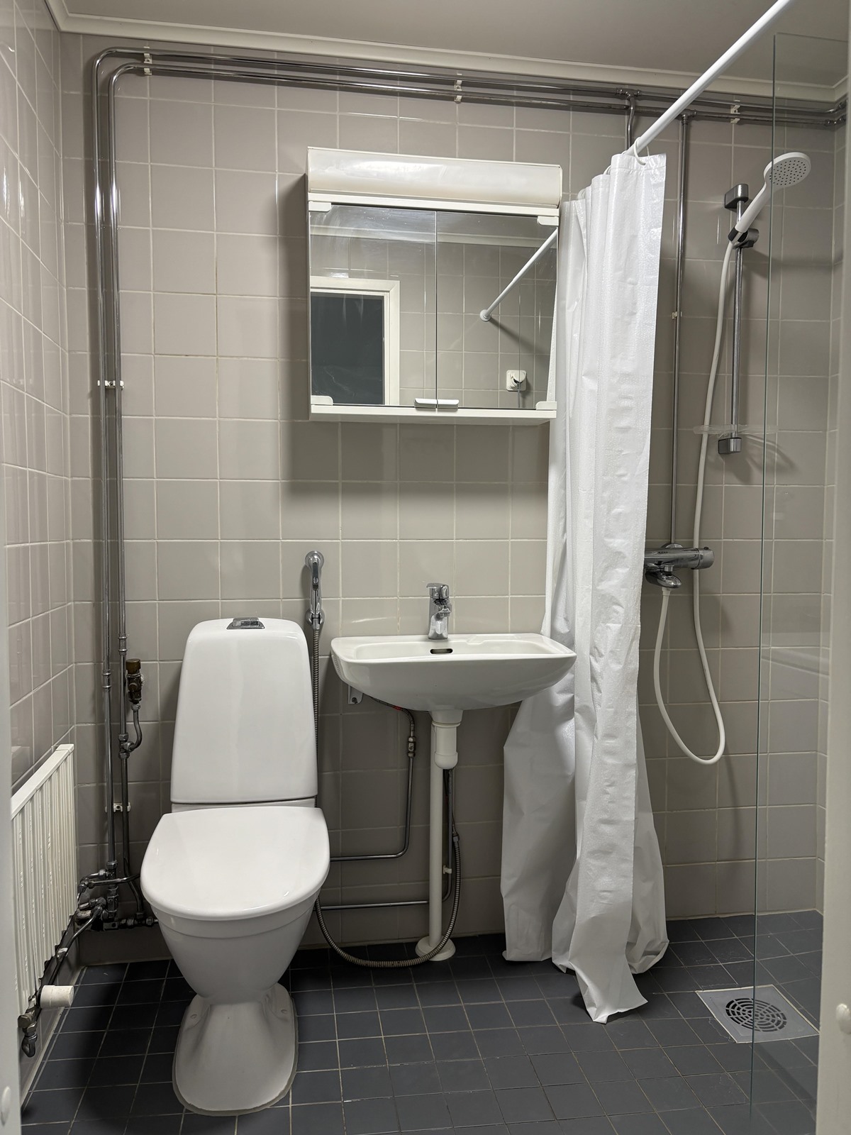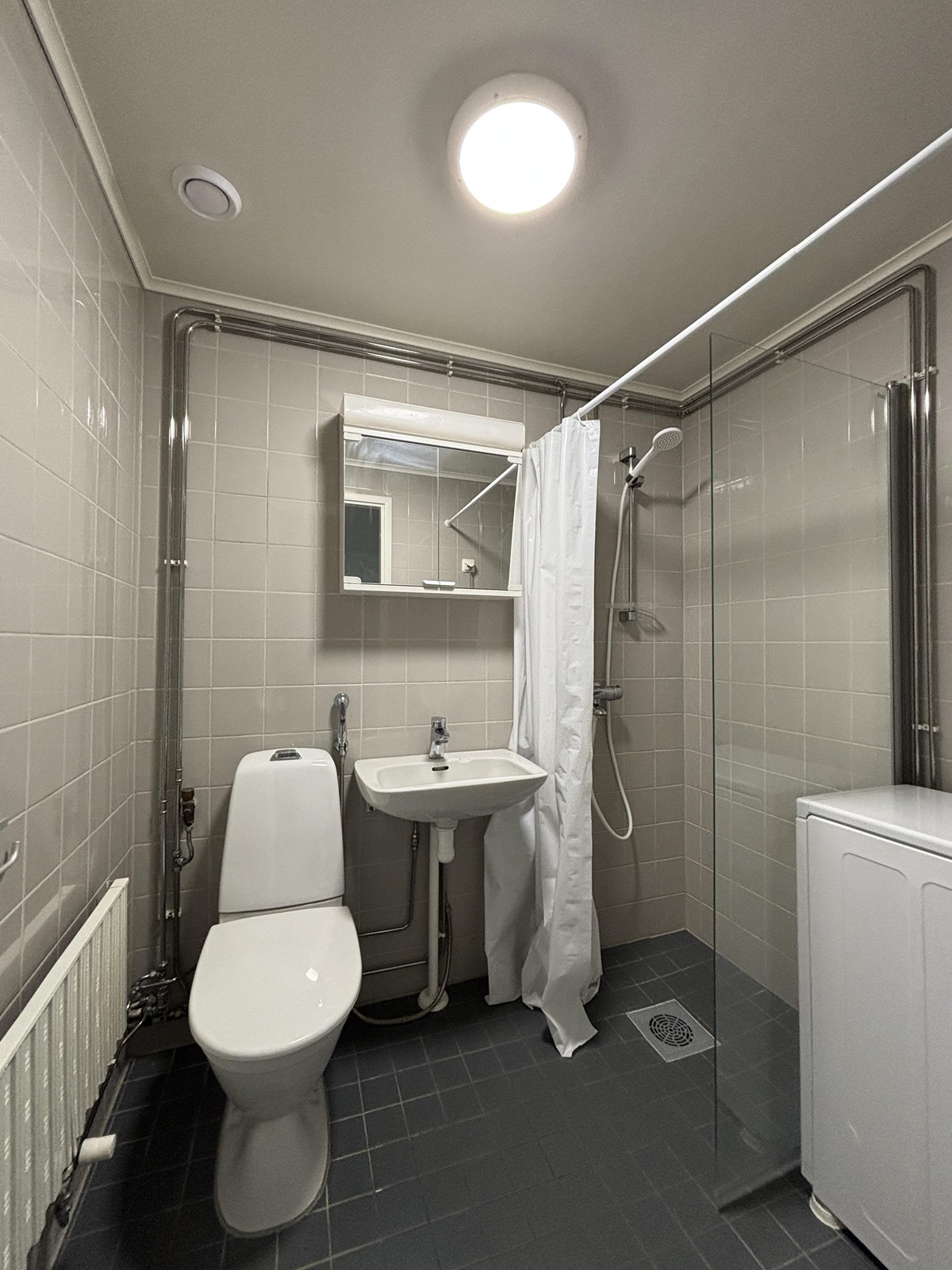 - Suihku suihkuverhotanko, suihkuseinä, peilikaappi, pesukoneliitäntä, lattialämmitys, kiinteät valaisimet.