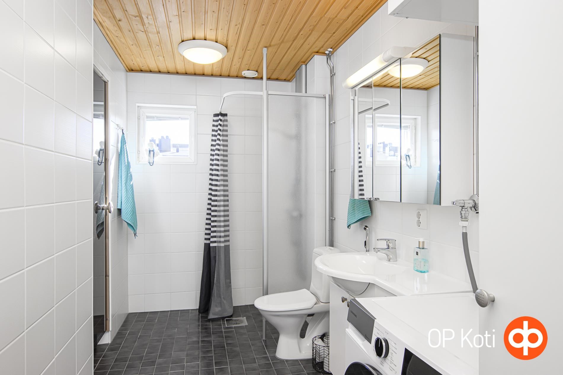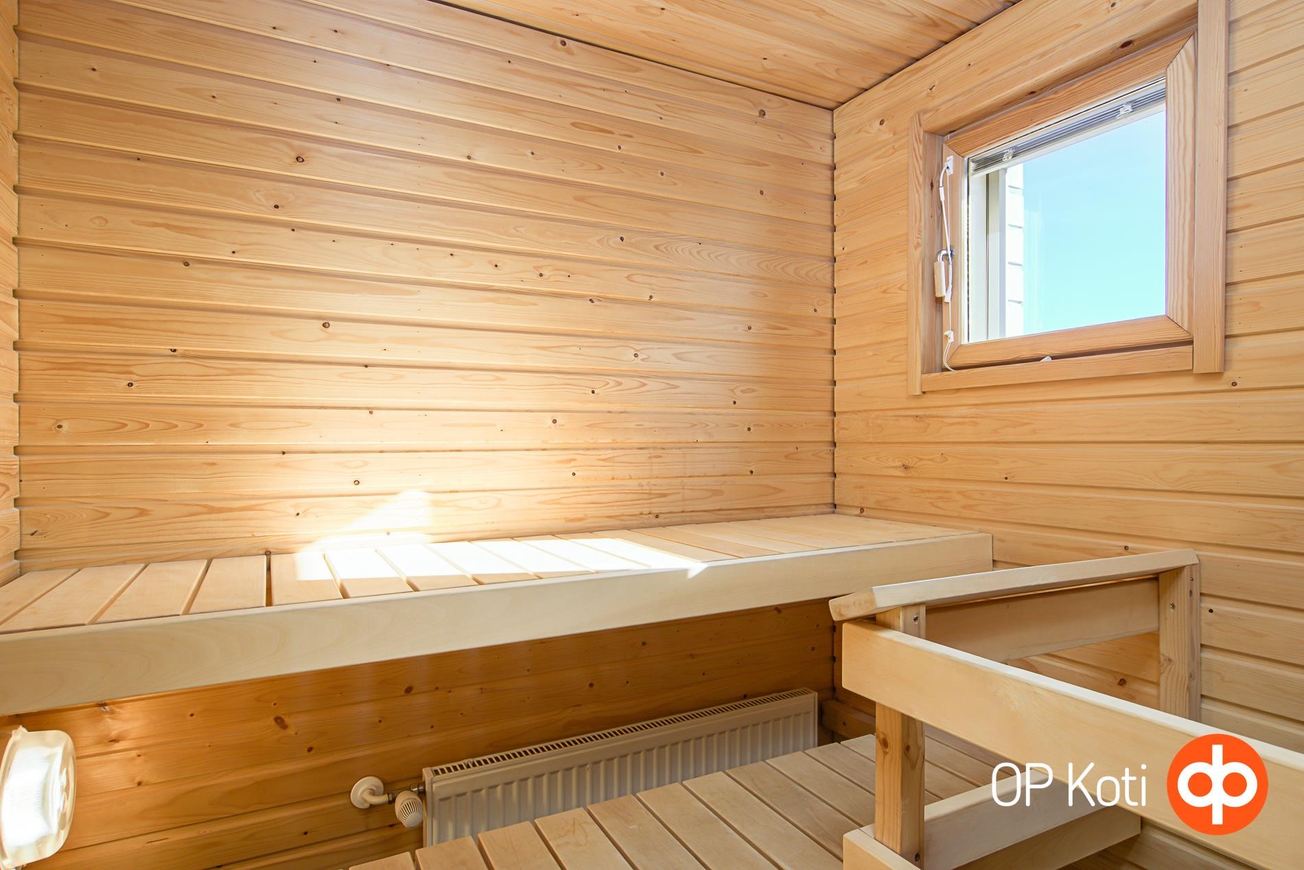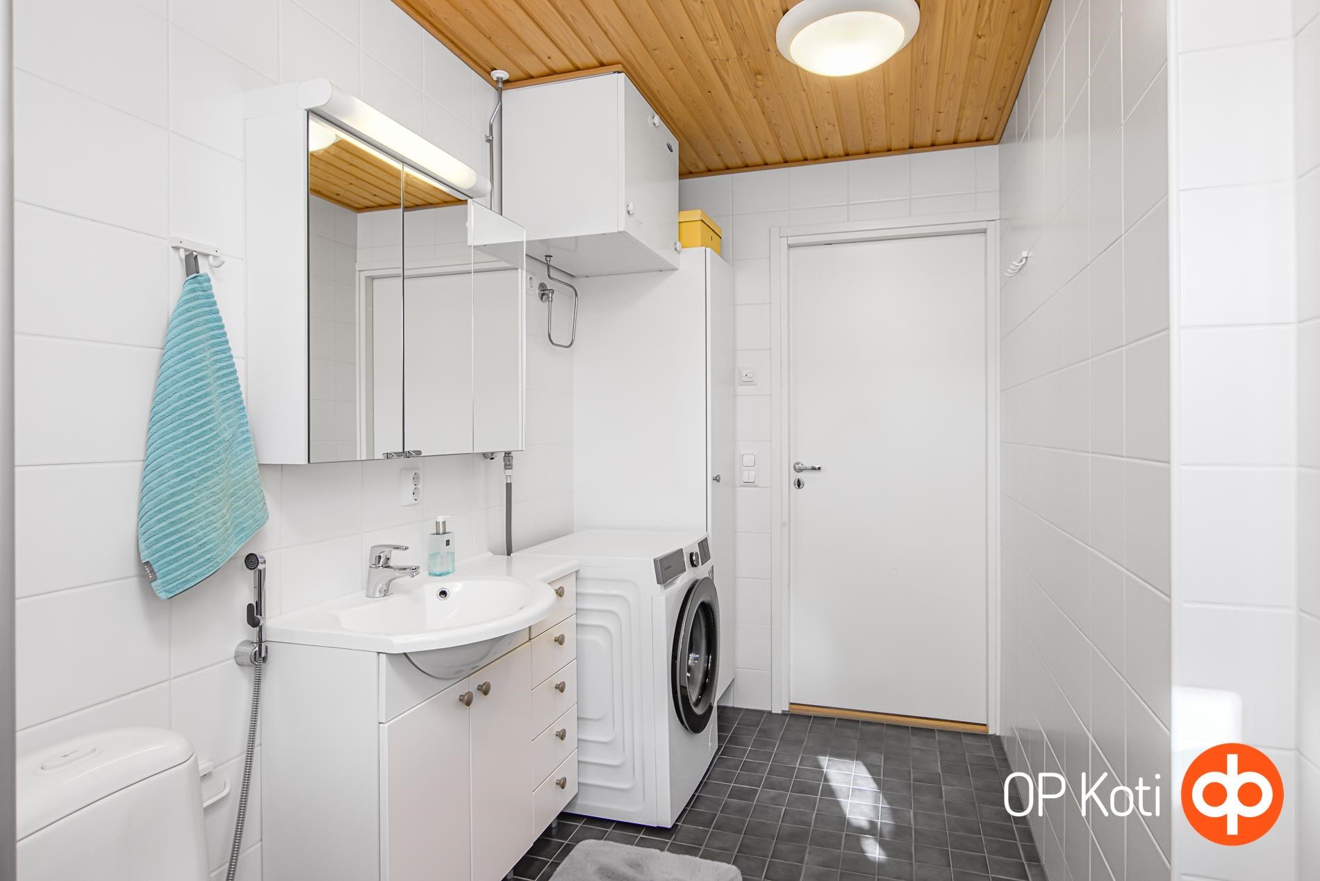 - Sauna, sähkökiuas, kylpyhuone, suihku, suihkuseinä, peilikaappi, allaskaappi, pesukoneliitäntä, lattialämmitys, kiinteät valaisimet.