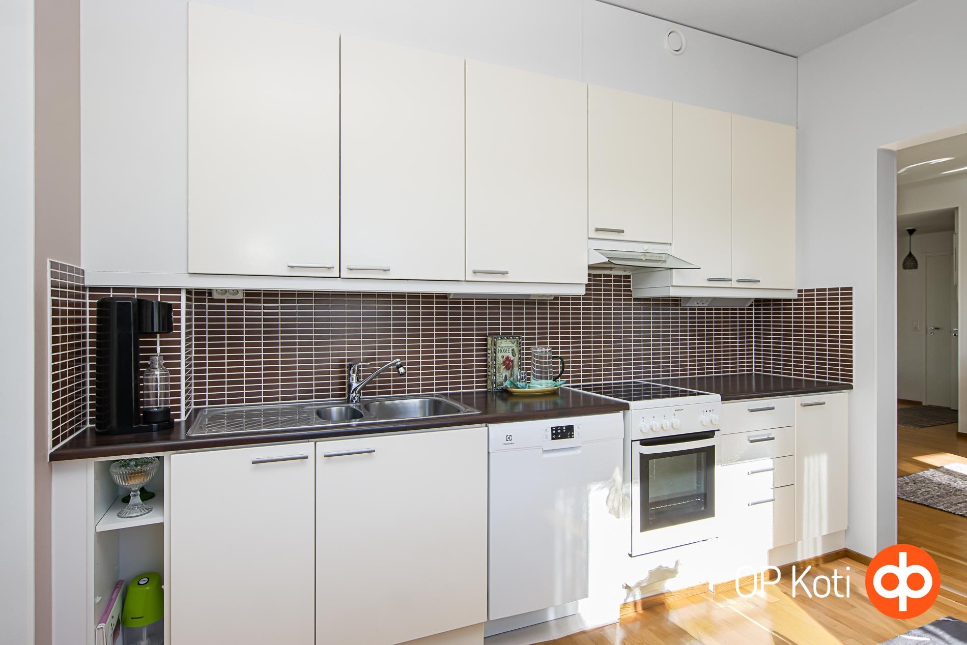 - Jääkaappi, pakastekaappi, erillisuuni, keraaminen liesi, liesituuletin, astianpesukone, kaapistot, kiinteät valaisimet.