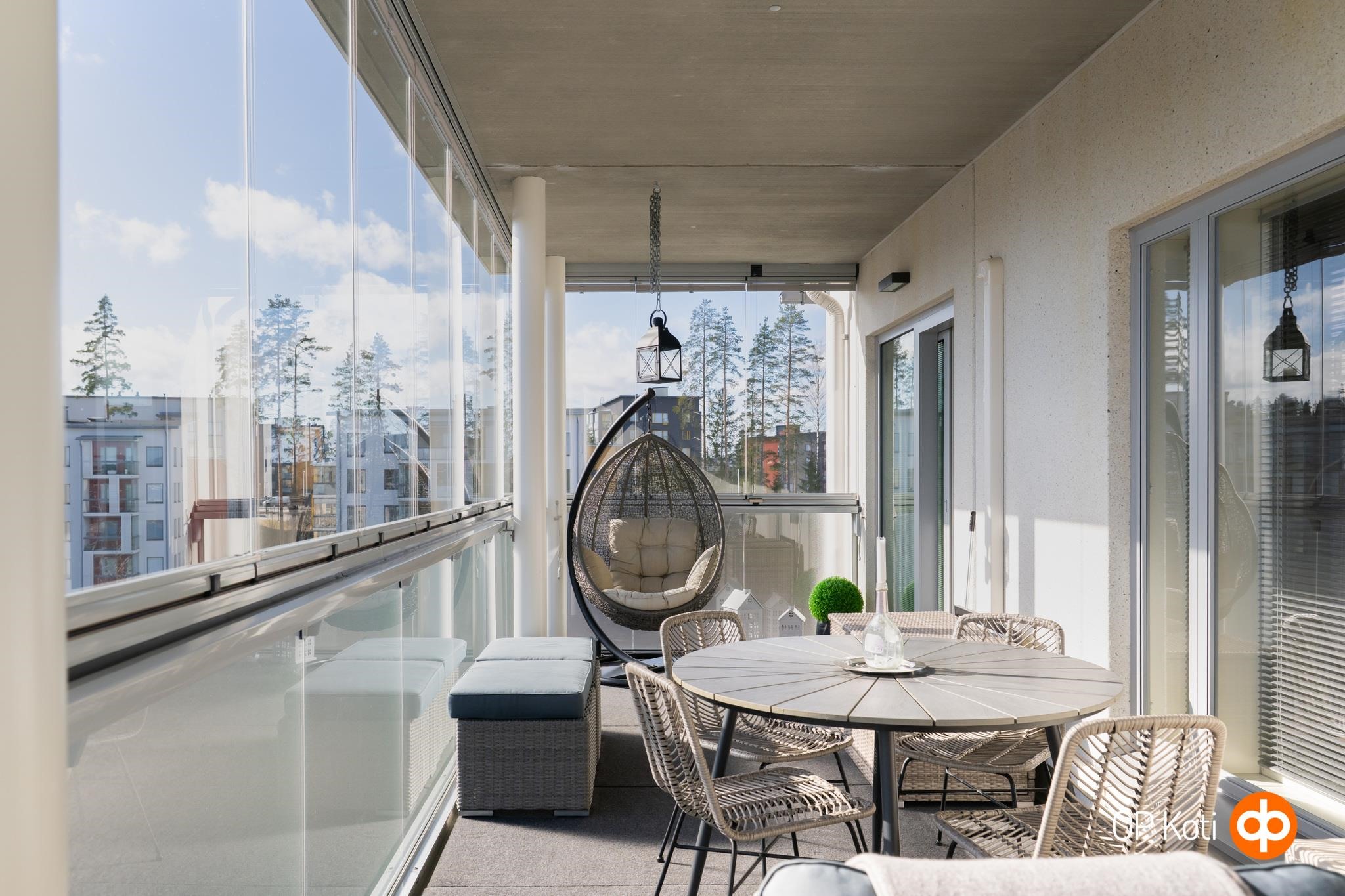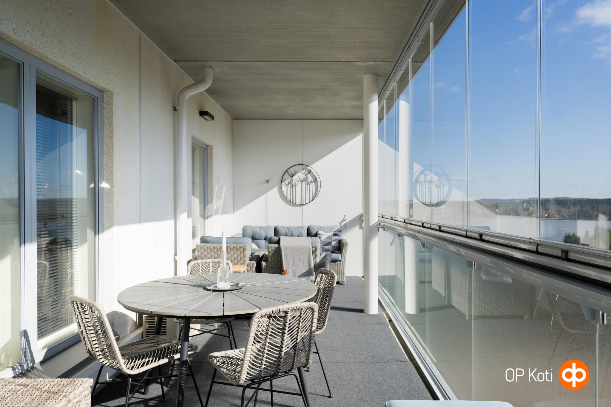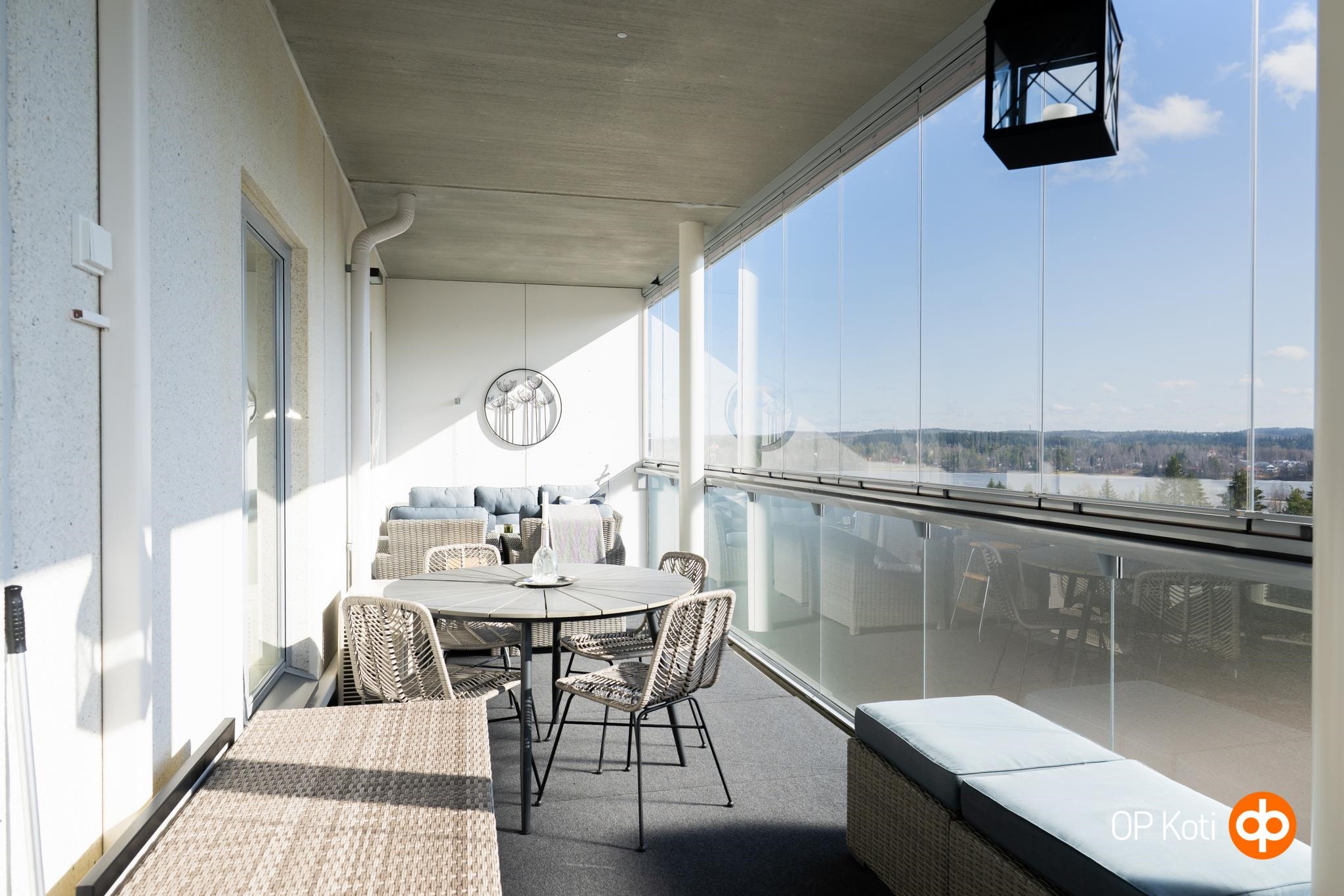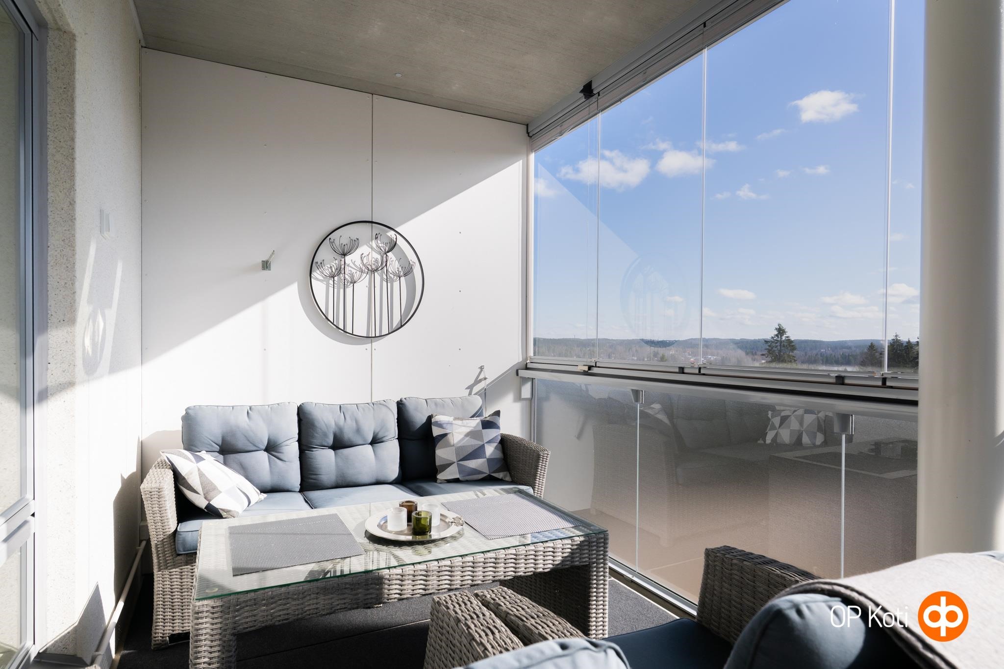 - Iso n. 21 m²:n lasitettu parveke, josta kauaskantoiset vehreät näkymät, sekä näkymät Palokkajärvelle.
