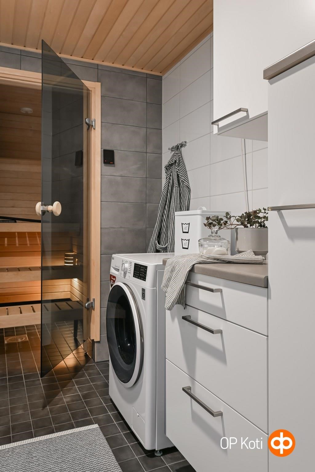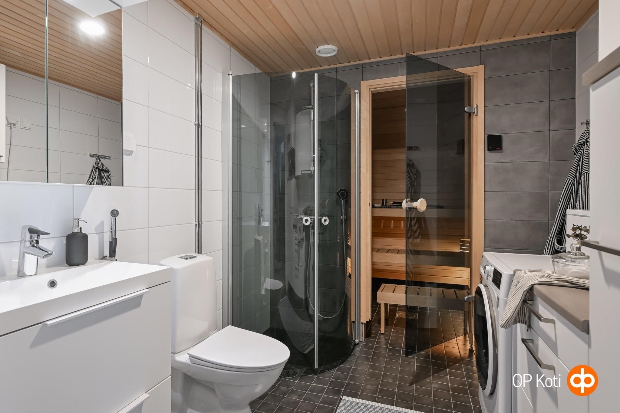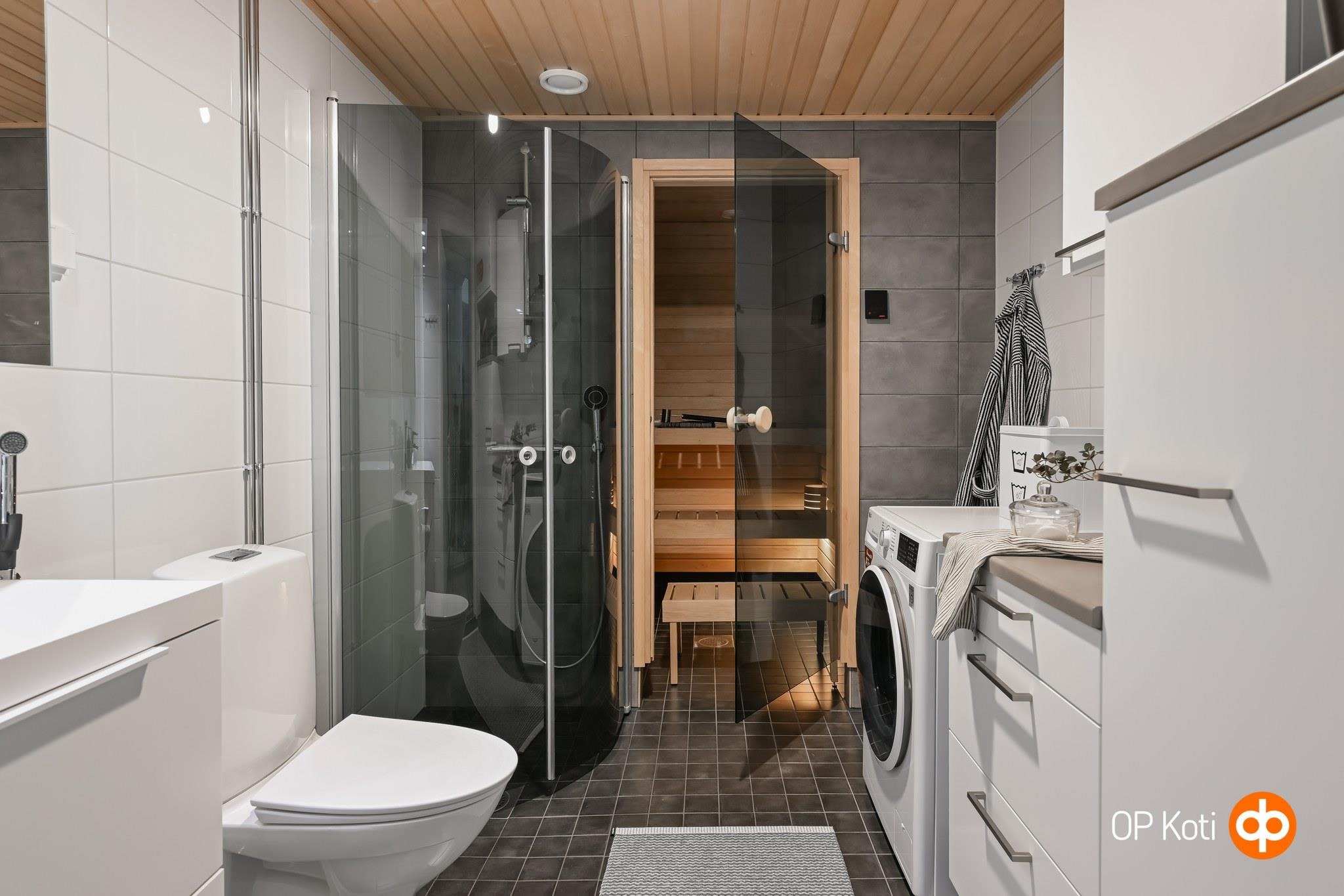 - Sauna, sähkökiuas Harvia höyrykiuas, kylpyhuone, erillinen wc, suihku, suihkuseinä Kääntyvät suihkuseinät (2 kpl), peilikaappi, kaapit, allaskaappi, pesukoneliitäntä, lattialämmitys, kiinteät valaisimet. Harvian höyrykiuas erillisellä ohjauskeskuksella.