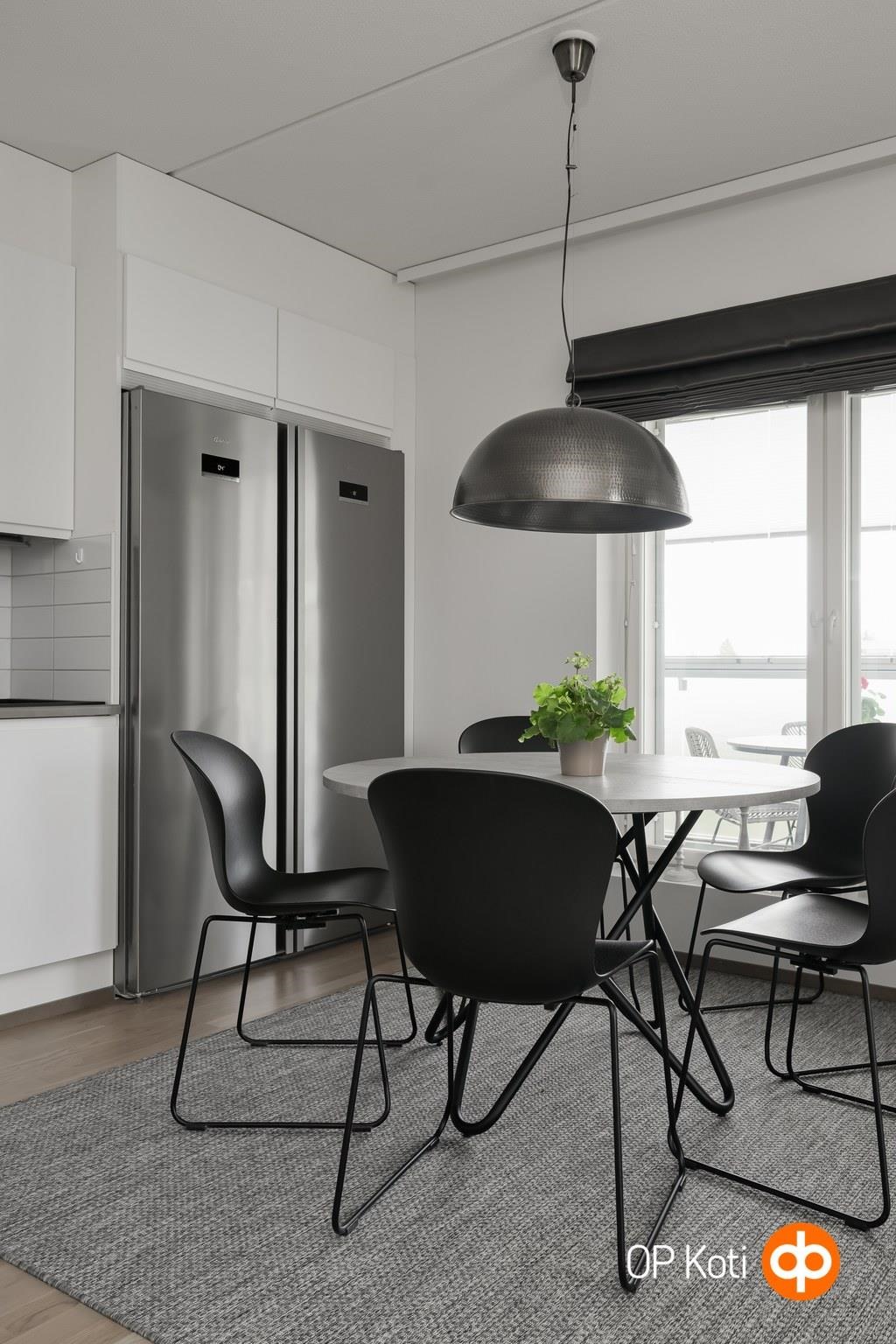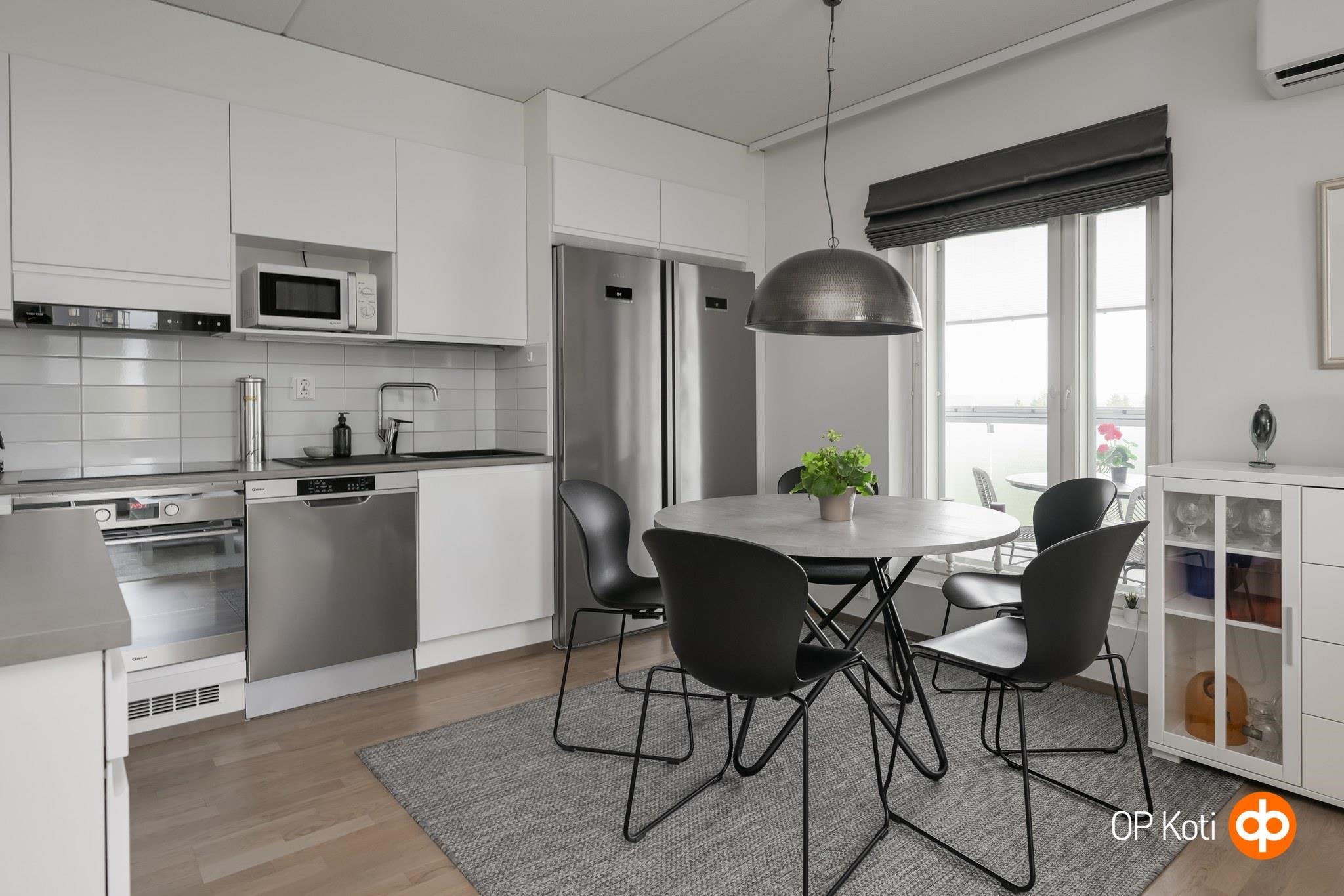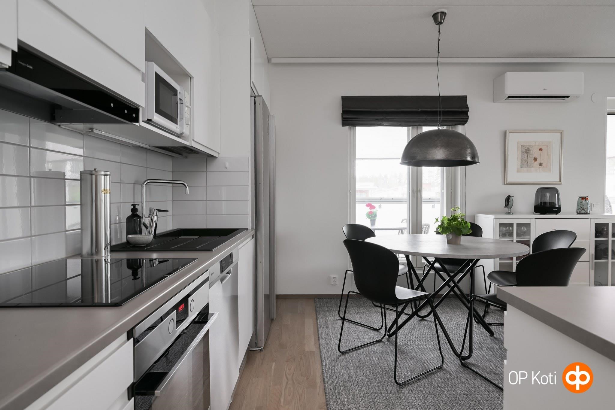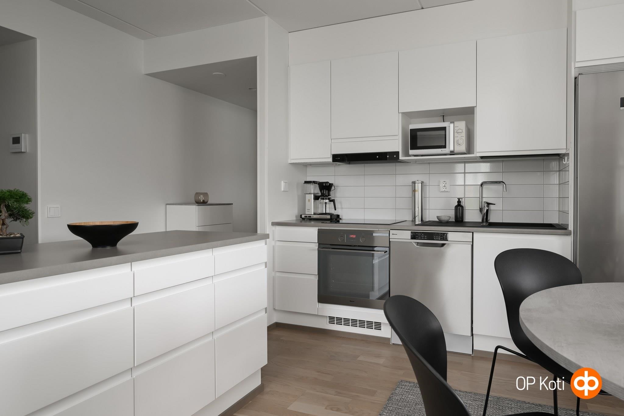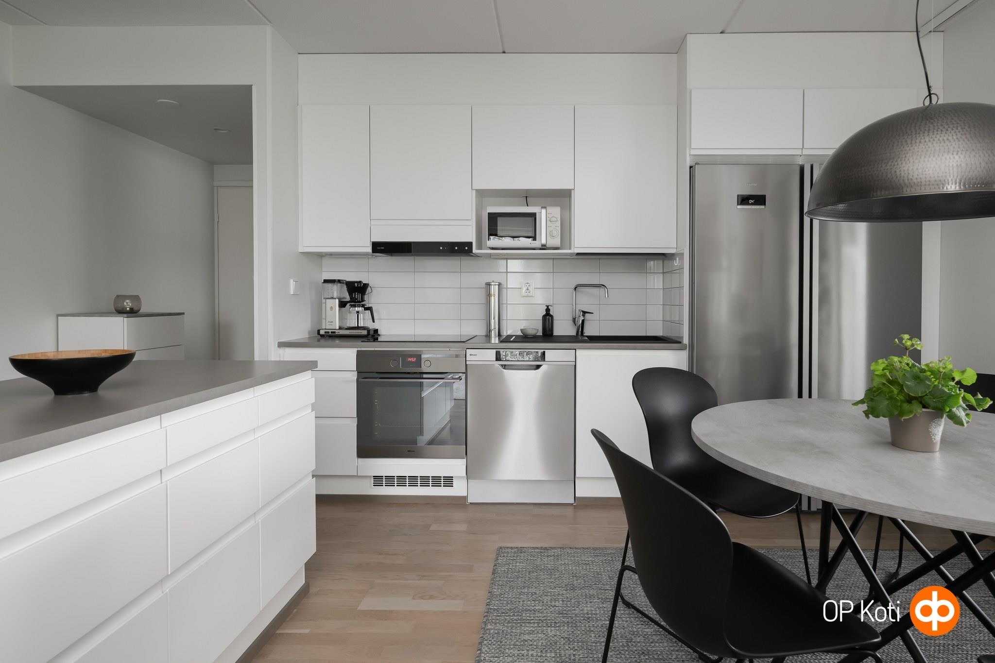 - Jääkaappi RST-pintainen, Gram, jääkaappipakastin RST-pintainen, Gram, erillisuuni RST-Kalusteuuni, Gram, liesitaso Induktioliesi Gram, liesikupu, astianpesukone, kaapistot, kiinteät valaisimet. Keittiön kalusteet tehdasvalmisteiset vakiokalusteet. Ovet ja laatikostojen etulevyt mikrolaminaattia / maalattua MDF-levyä. Kalusteiden rungot melamiinipintaista rakennuslevyä. Allastason alapuolella jätevaunukaappi. Työtasot taivereuna- laminaattia. Allastasot tectonite-komposiitti.