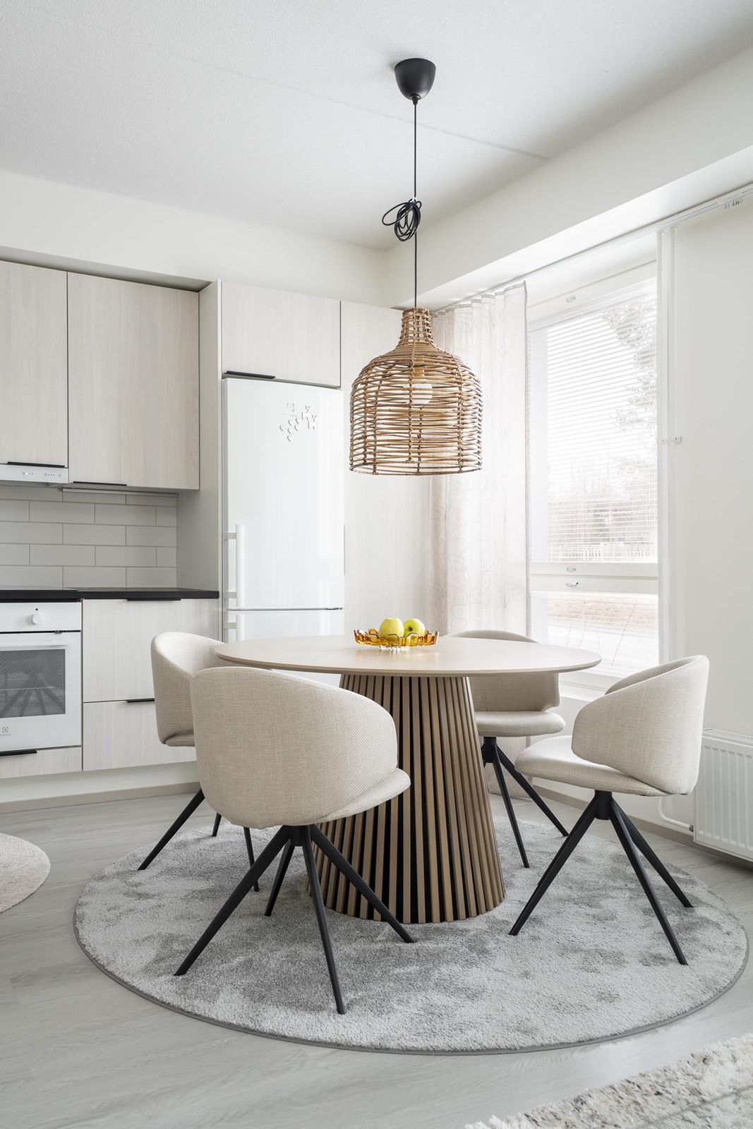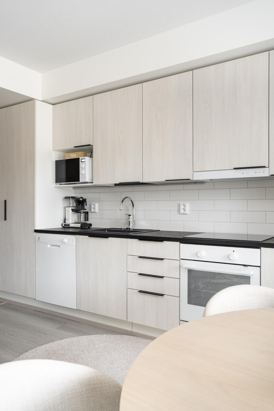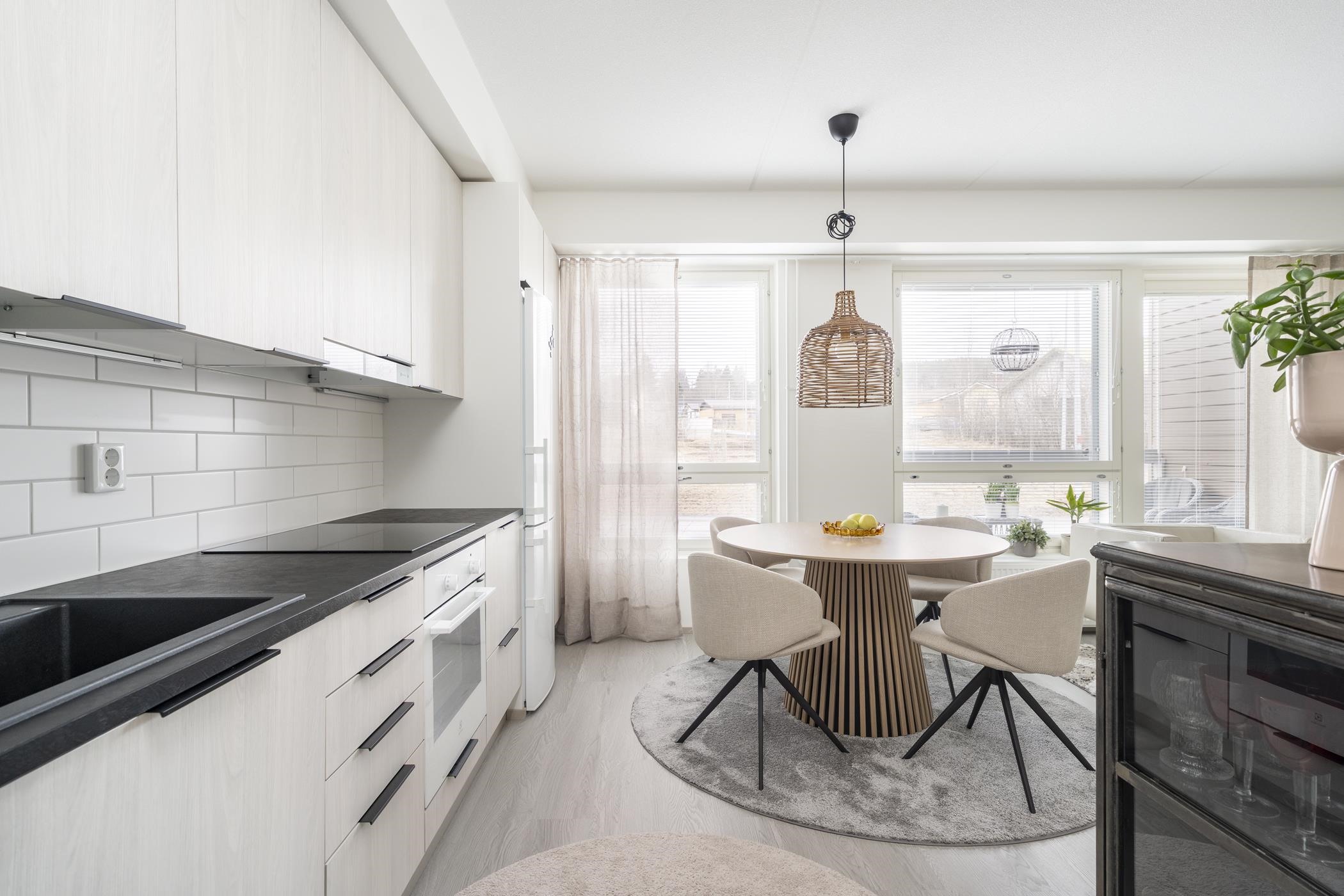 - Jääkaappipakastin, induktioliesitaso, liesituuletin, astianpesukone, kaapistot, kiinteät valaisimet, komposiittiallas.
