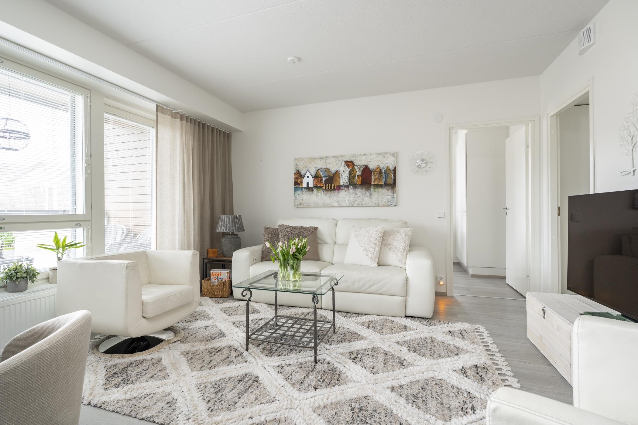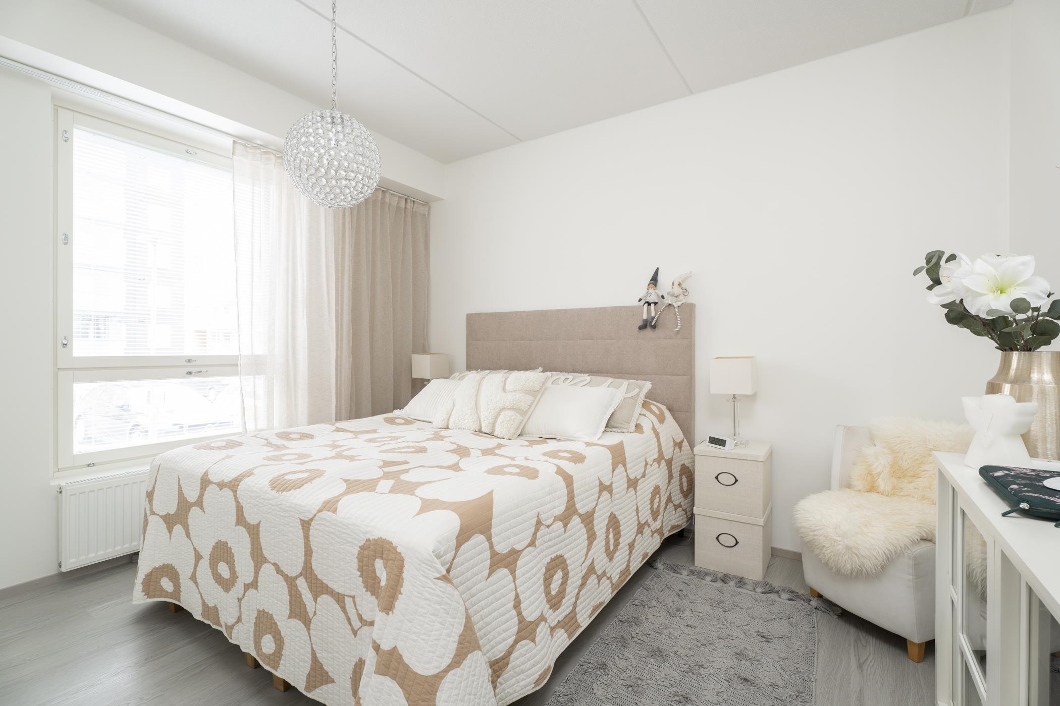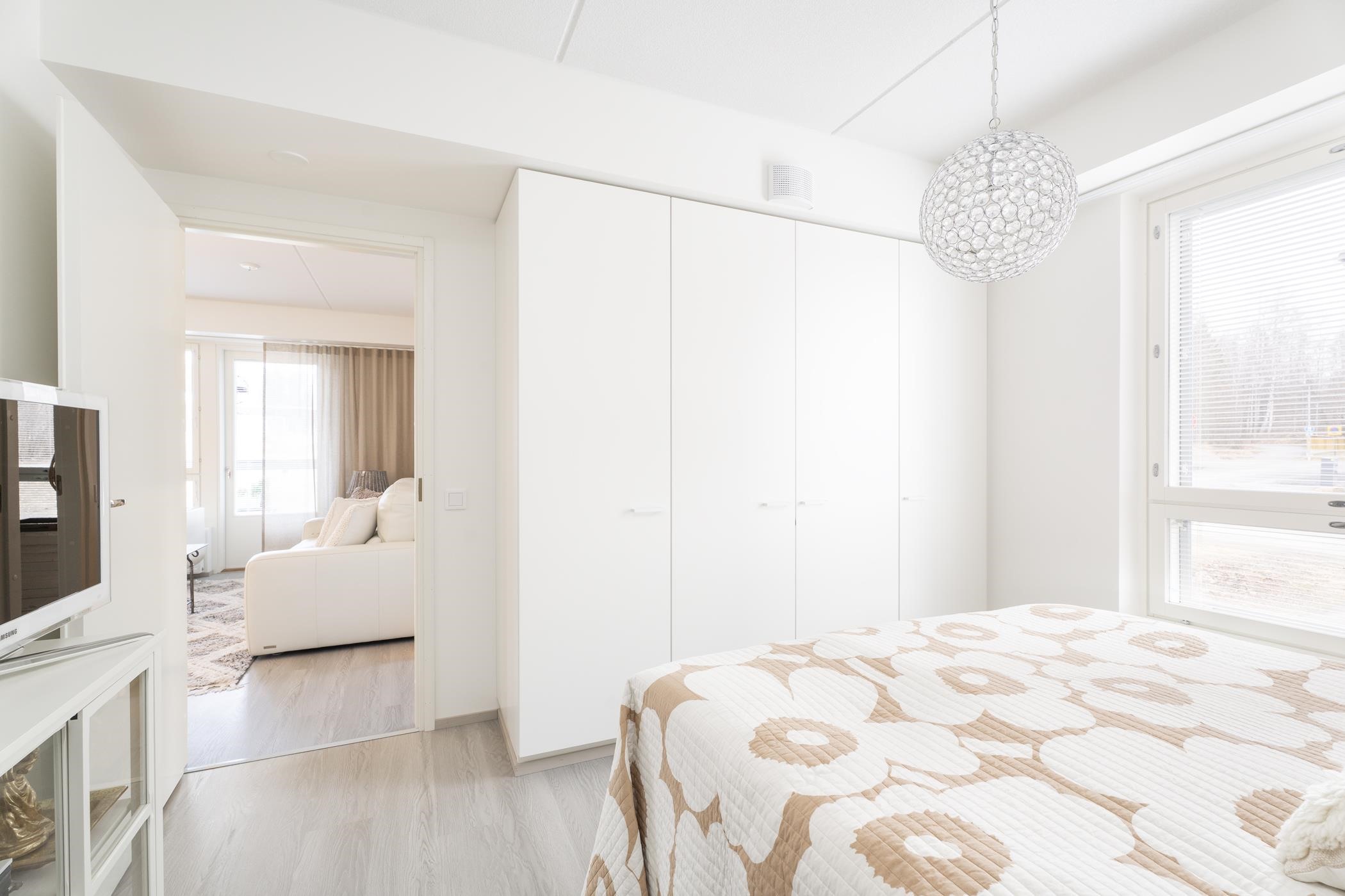Huoneistossa on toimivaksi todettu pohjaratkaisu: kaksi reilun kokoista makuuhuonetta sekä avara keittiön ja olohuoneen yhdistelmä, joka luo viihtyisän oleskelutilan. Arkea helpottaa erillinen wc sekä toinen wc-istuin kylpyhuoneessa. Lasitettu parveke tuo mukavasti lisätilaa. Modernit ja ajattomat materiaalivalinnat tekevät kodista helppohoitoisen ja tyylikkään. Säilytystilaa löytyy hyvin kaapistoista, ja lisäksi käytössä on taloyhtiön lämmin häkkivarasto.