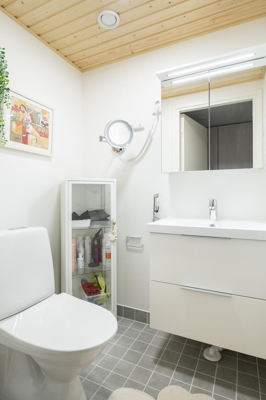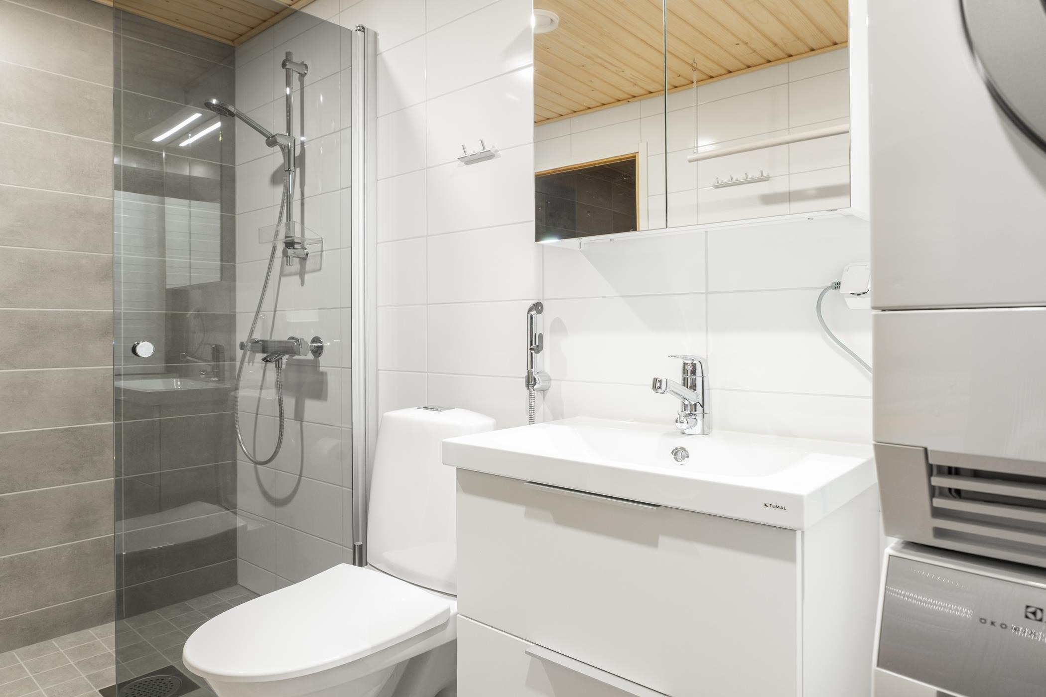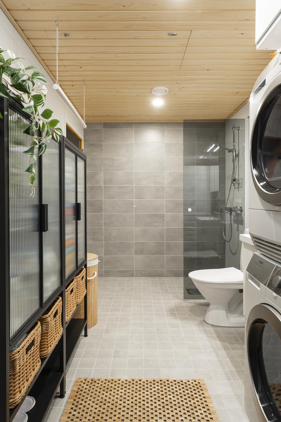 - Saunassa sähkökiuas Kylpyhuoneessa suihku, suihkuseinä, peilikaappi, allaskaappi laatikostot, pesukoneliitäntä, lattialämmitys, wc-istuin, kiinteät valaisimet. Erillinen wc: peilikaappi, allaskaappi laatikostot, kiinteät valaisimet.