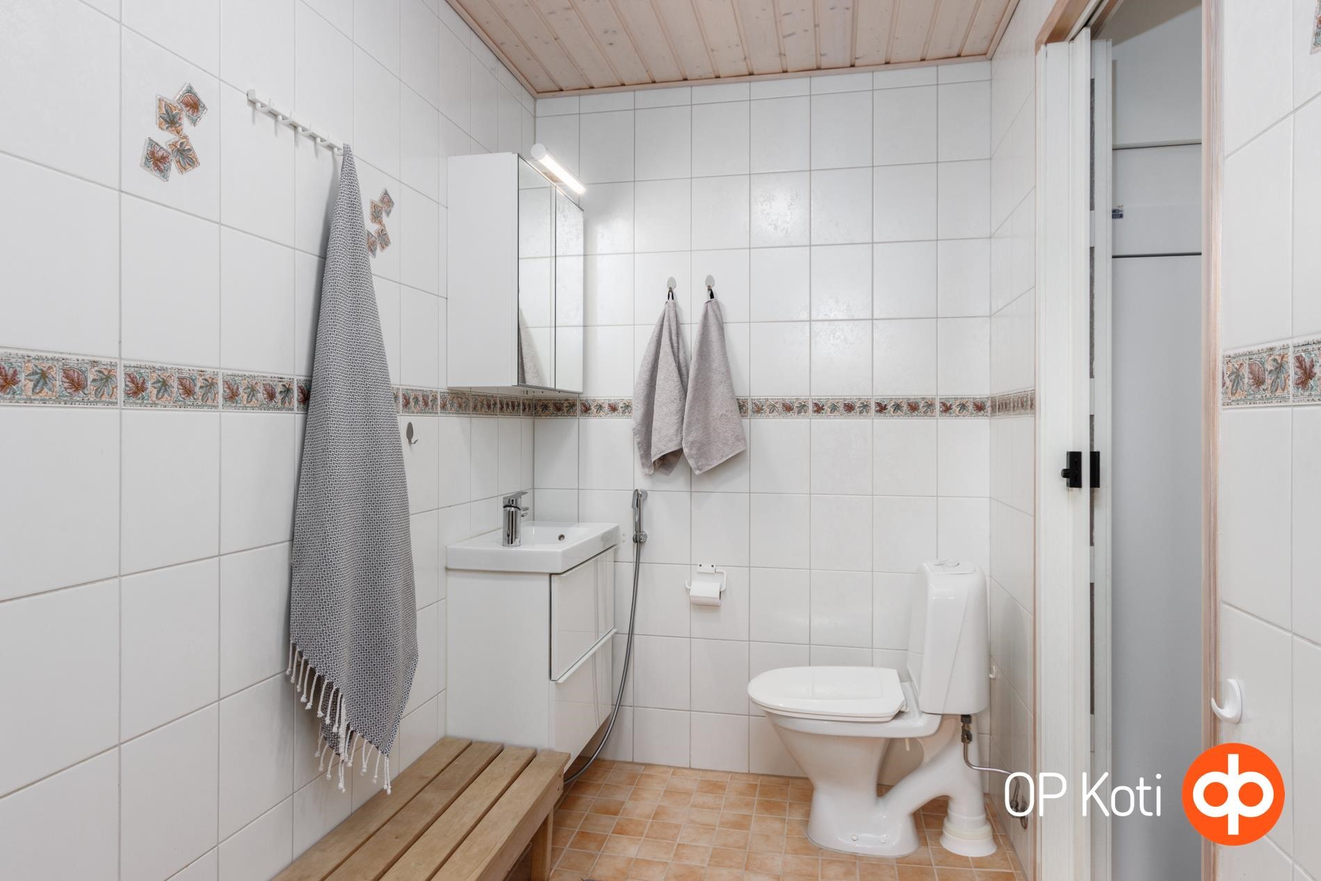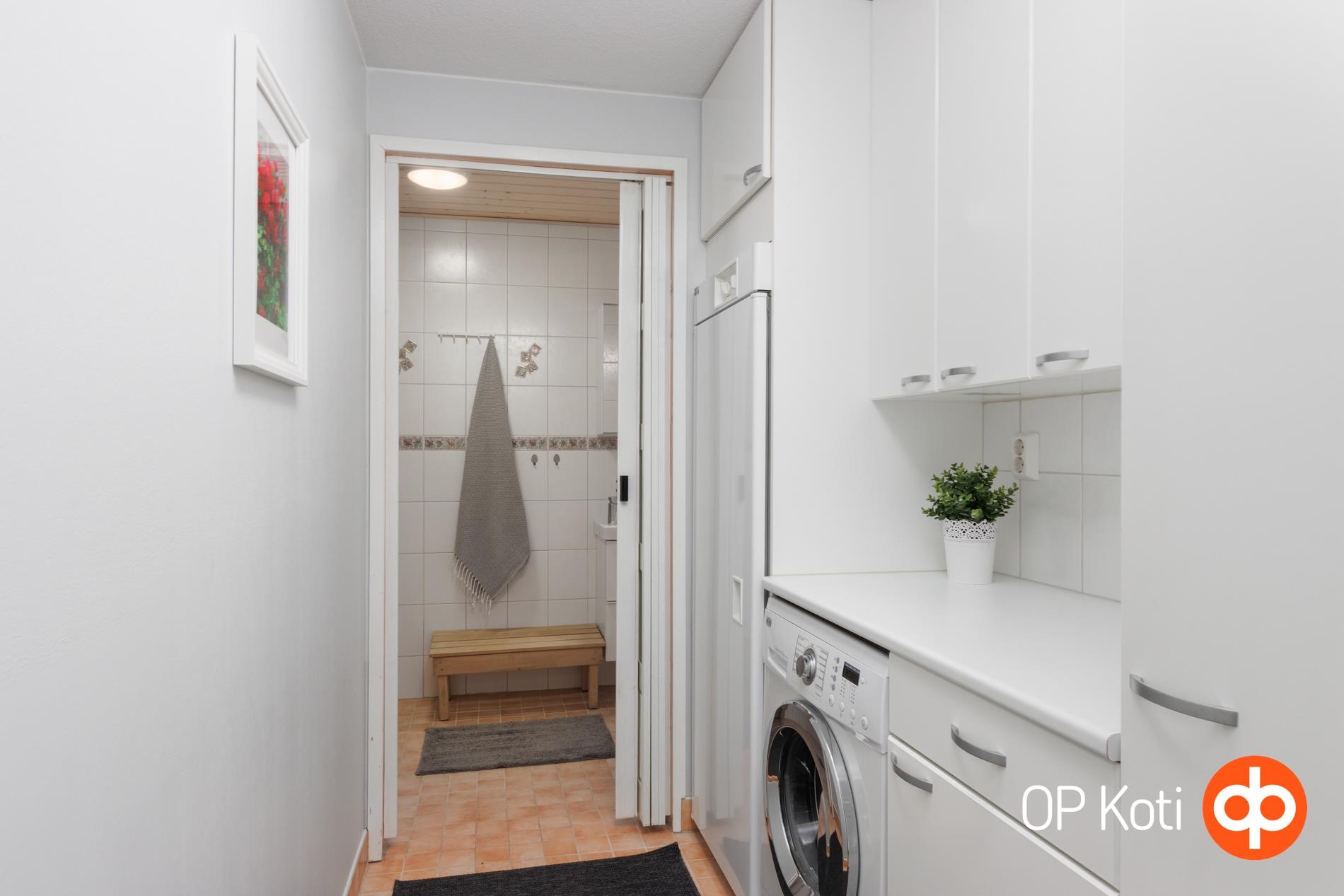 - Sauna, sähkökiuas, kylpyhuone, erillinen wc, suihku, peilikaappi, kaapit, allaskaappi, pesukoneliitäntä, lattialämmitys, kiinteät valaisimet.