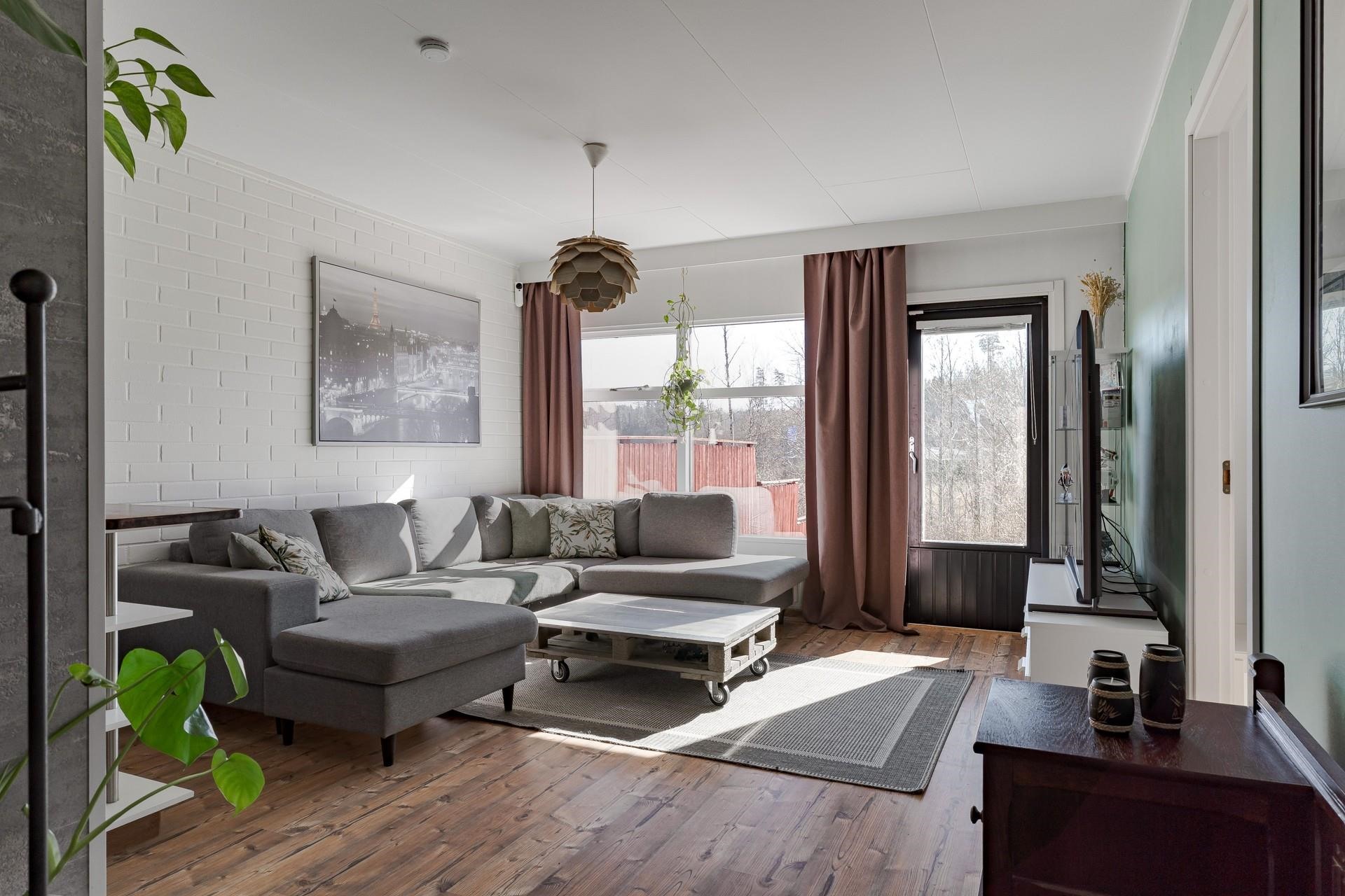Keittiössä on vinyylilattia, seivät on maalattu/ tiiliseinä/ tapettia. Olohuoneessa on vinyylilattia, seinät on maalattu, tiiliseinä. Makuuhuoneiden lattiat ovat vinyyliä, seinät on maalattu ja tapetoitu. Saunan seinät ovat puu ja lattia laattaa. Kylpyhuonen pinnat ovat laattaa.