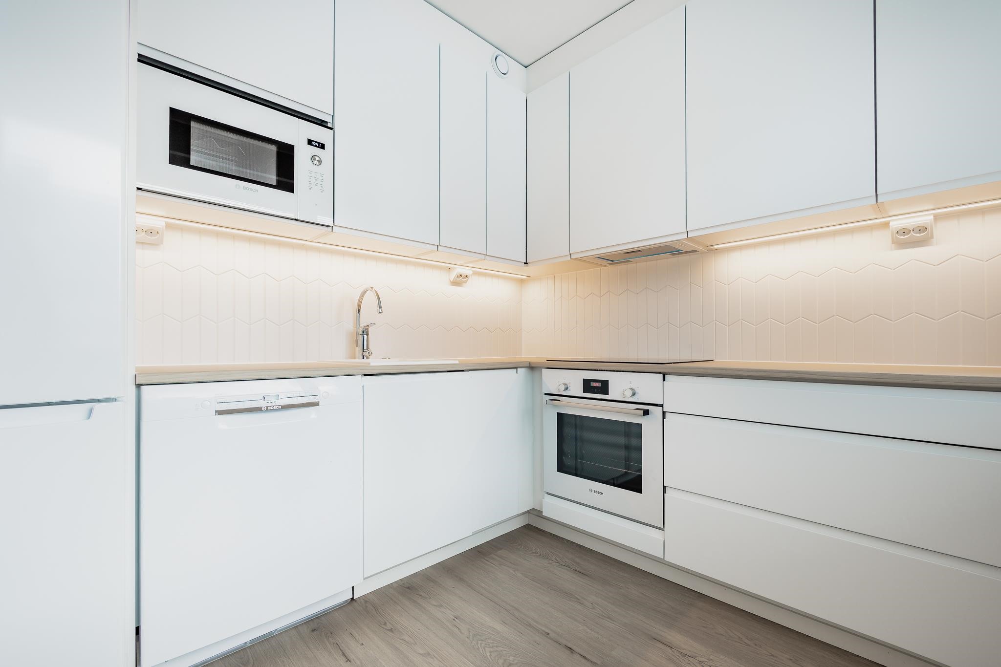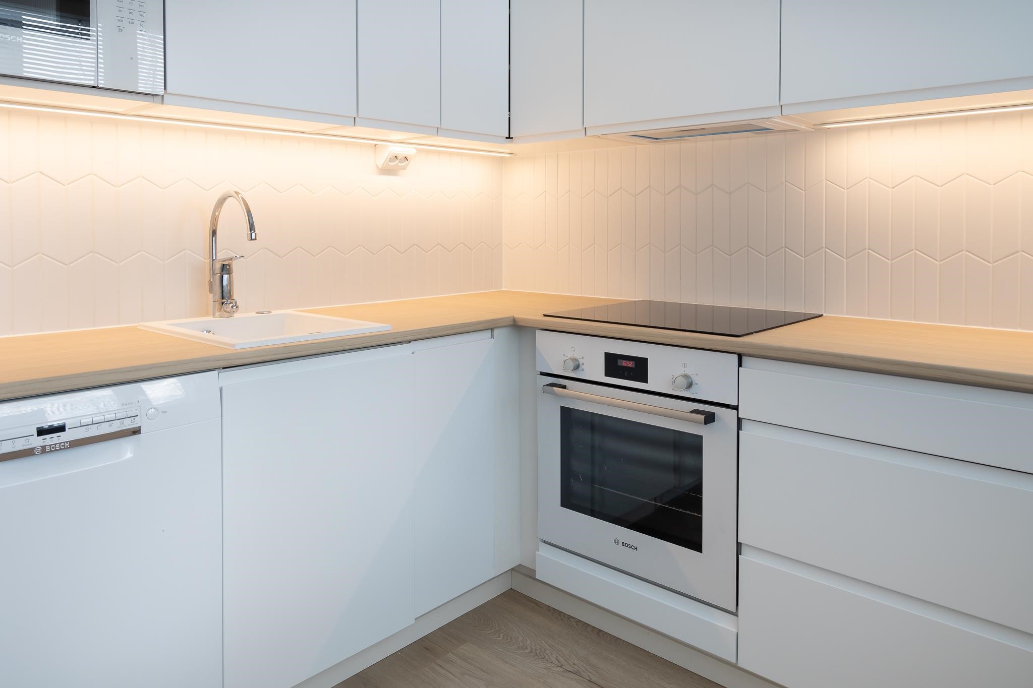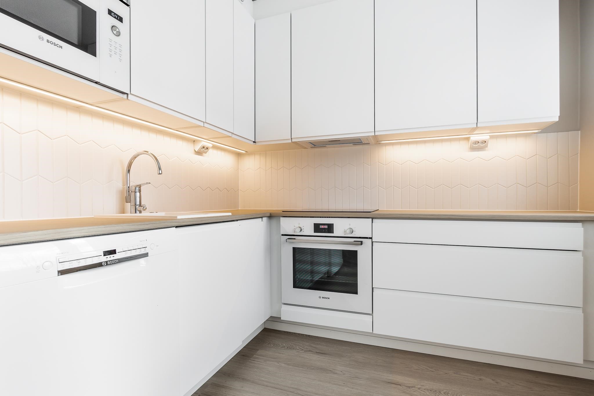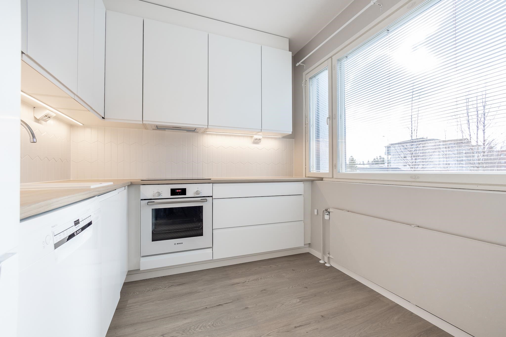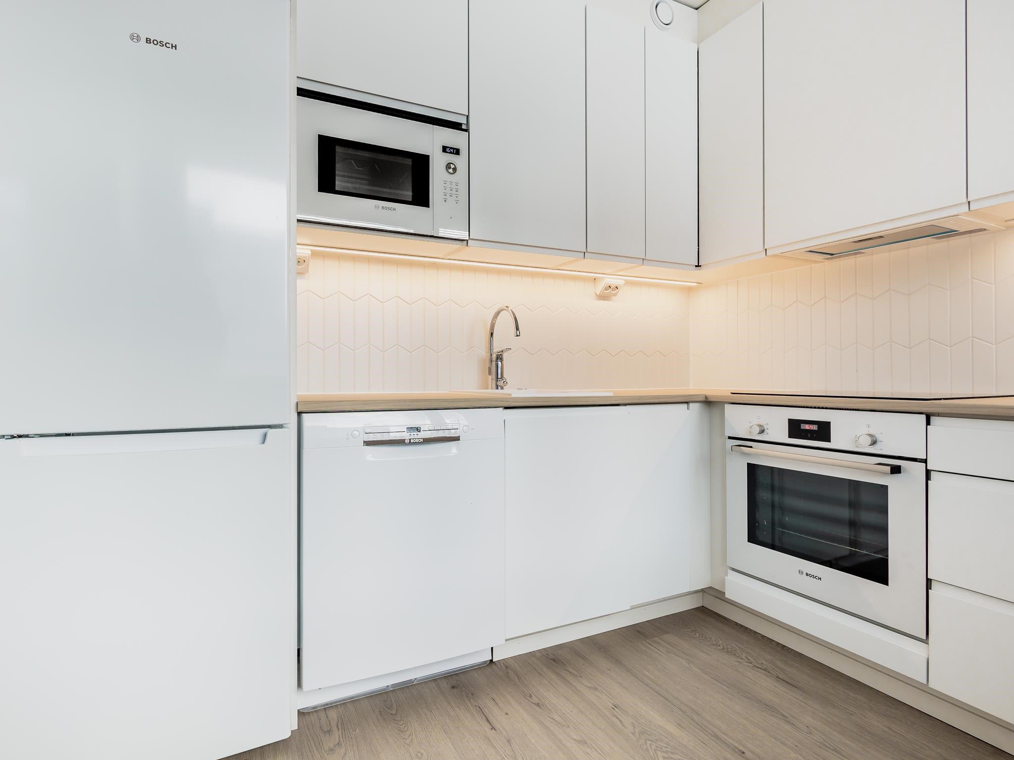- Jääkaappipakastin, erillisuuni, induktioliesi, mikroaaltouuni, astianpesukone, kiinteät valaisimet.