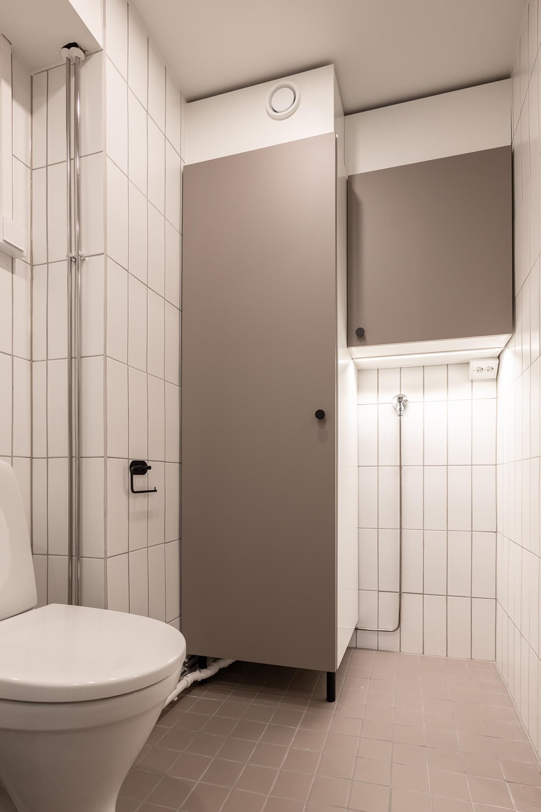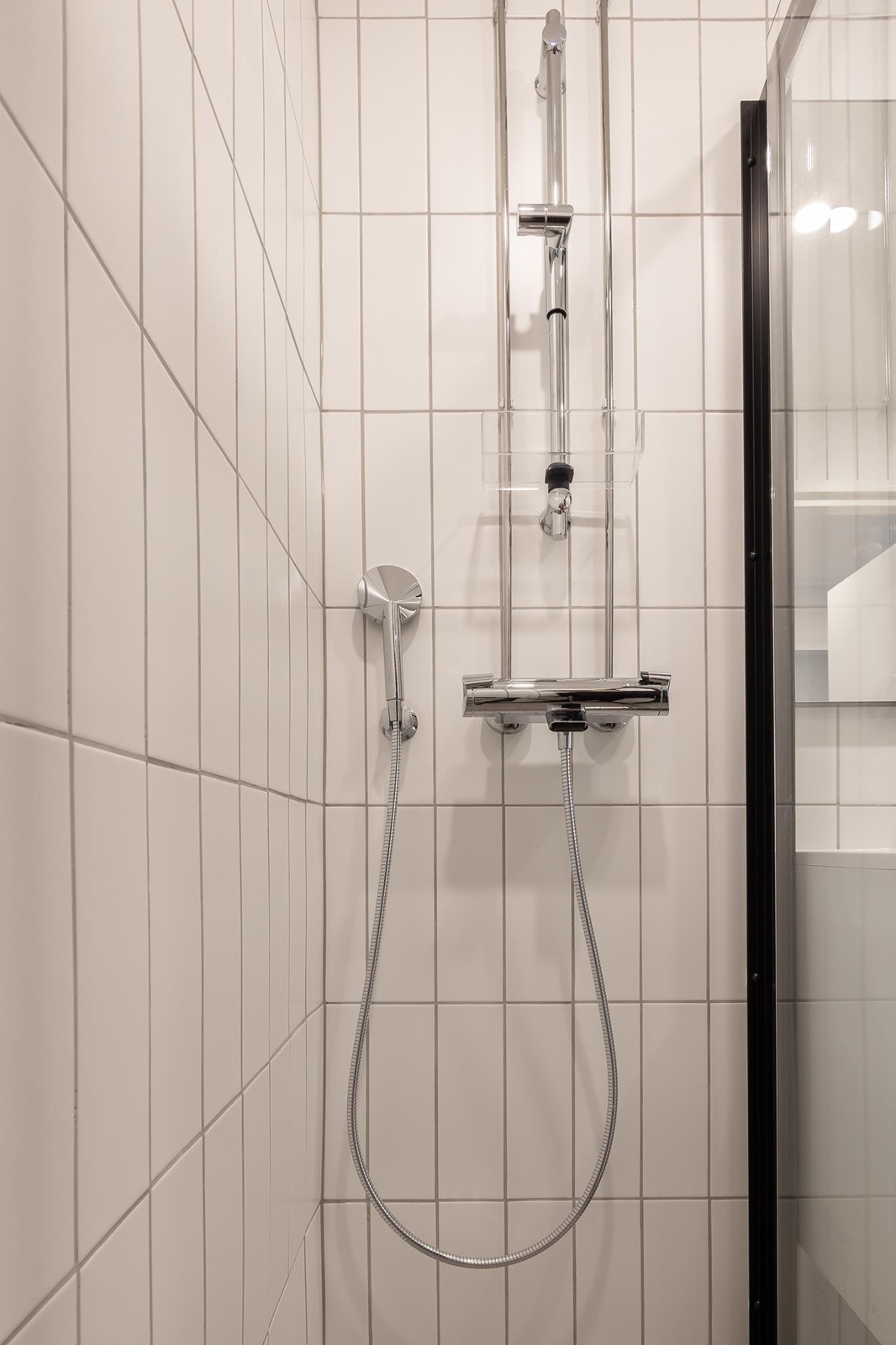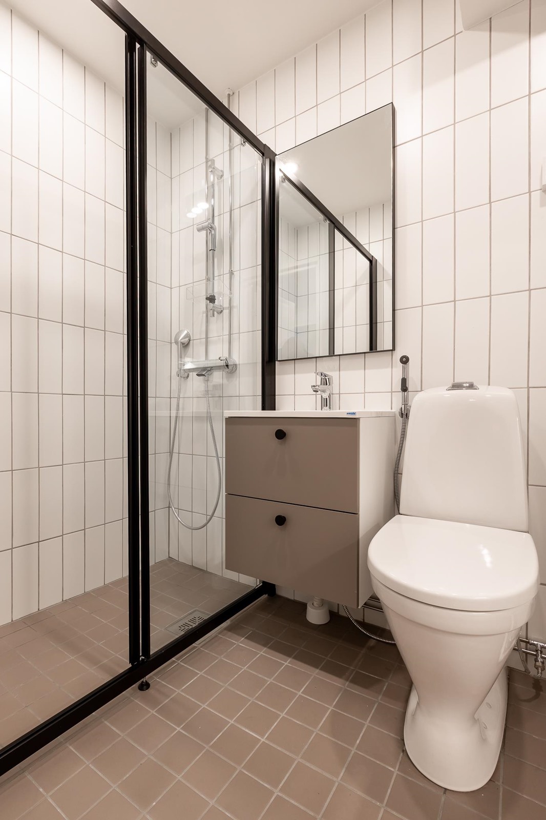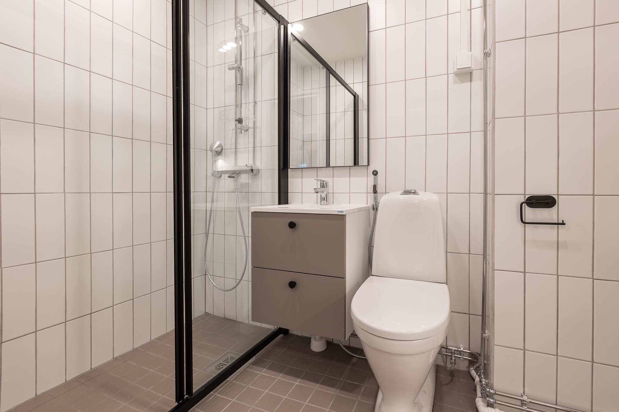 - Suihku, suihkuseinä, peilit, allaskaappi, pesukoneliitäntä, kiinteät valaisimet.
