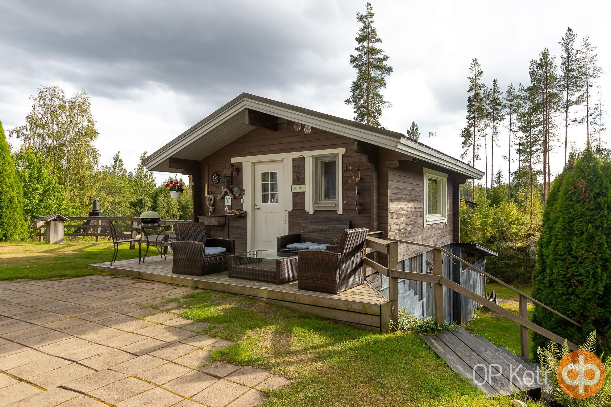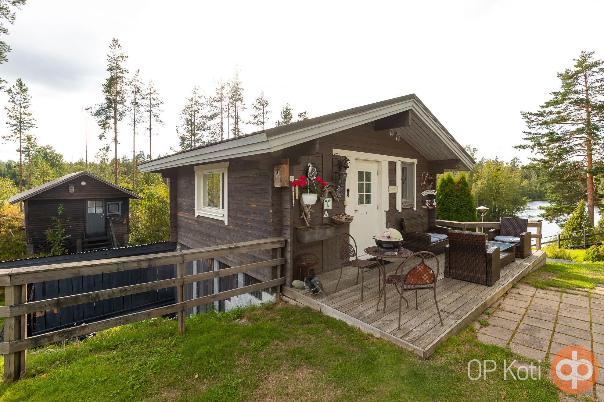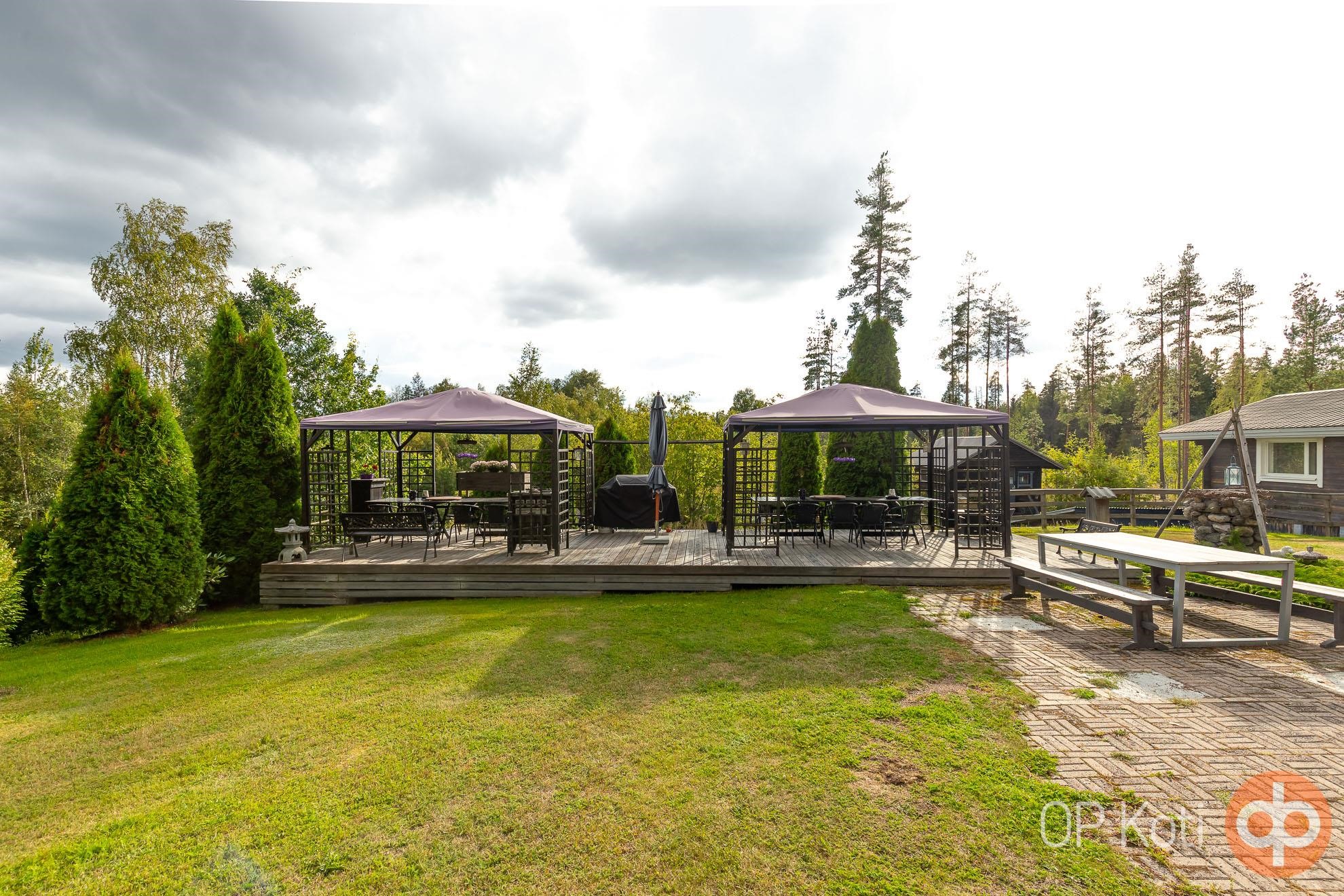 The main building, constructed in 1989, provides living space with two bedrooms. Large glazed terraces at both the front and back of the house offer spacious areas for shared living. Heating is provided by a wood-fired boiler (renewed in 2021). The utility room, hall, and toilet feature electric underfloor heating. The house has been well maintained: windows and doors were renewed in 2021, the heat-storing fireplace in 2020, and an air-source heat pump installed in 2019. Next to the main building is a guest house with its own toilet, and the heating network is shared between the two buildings.