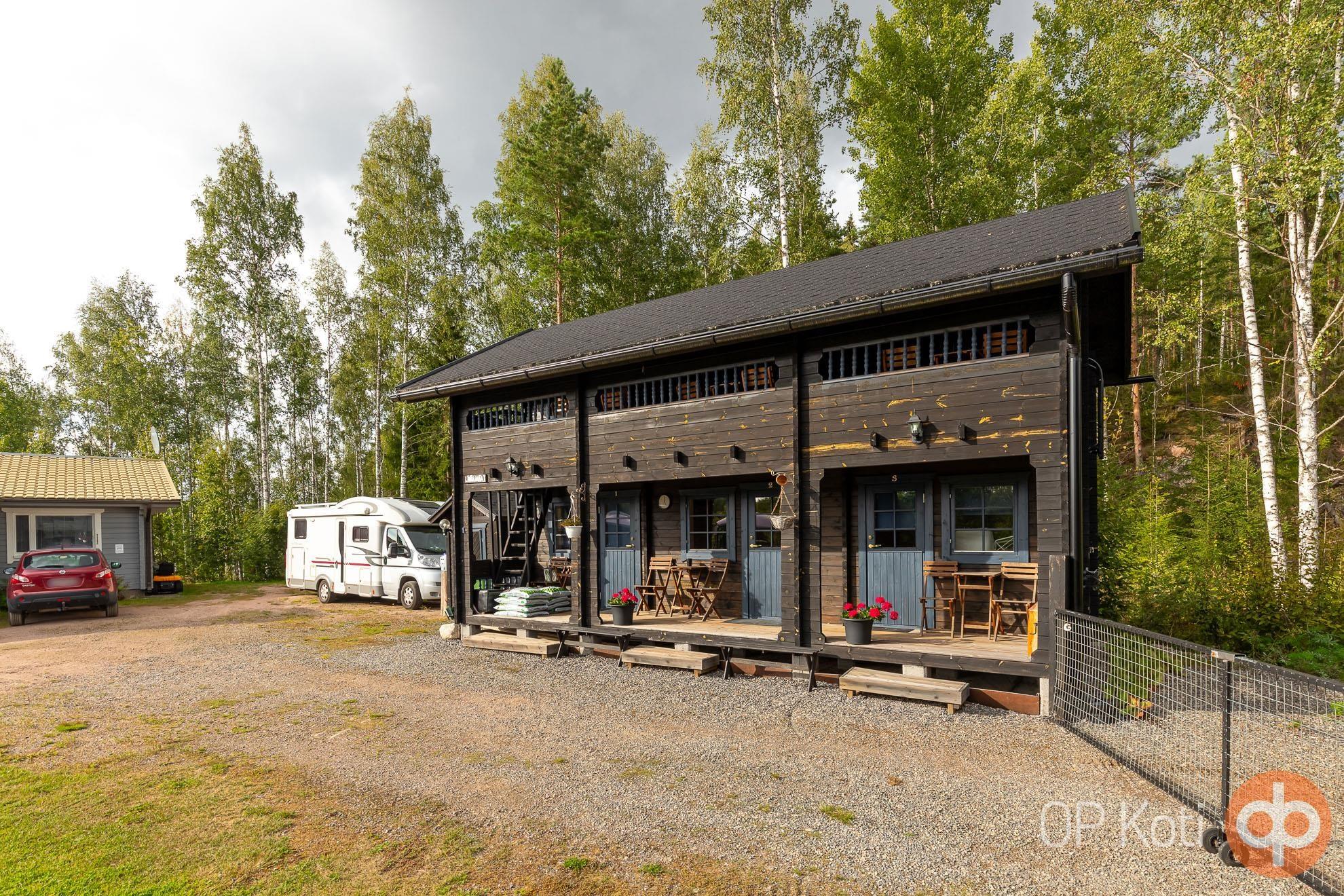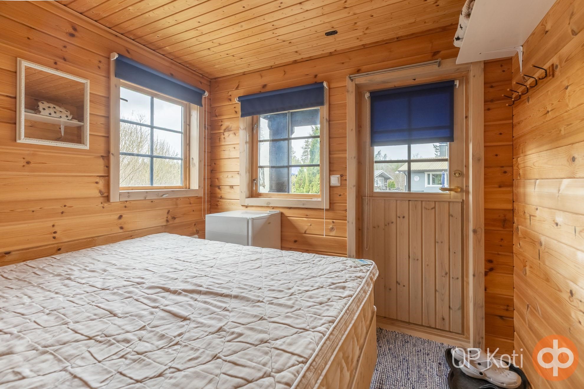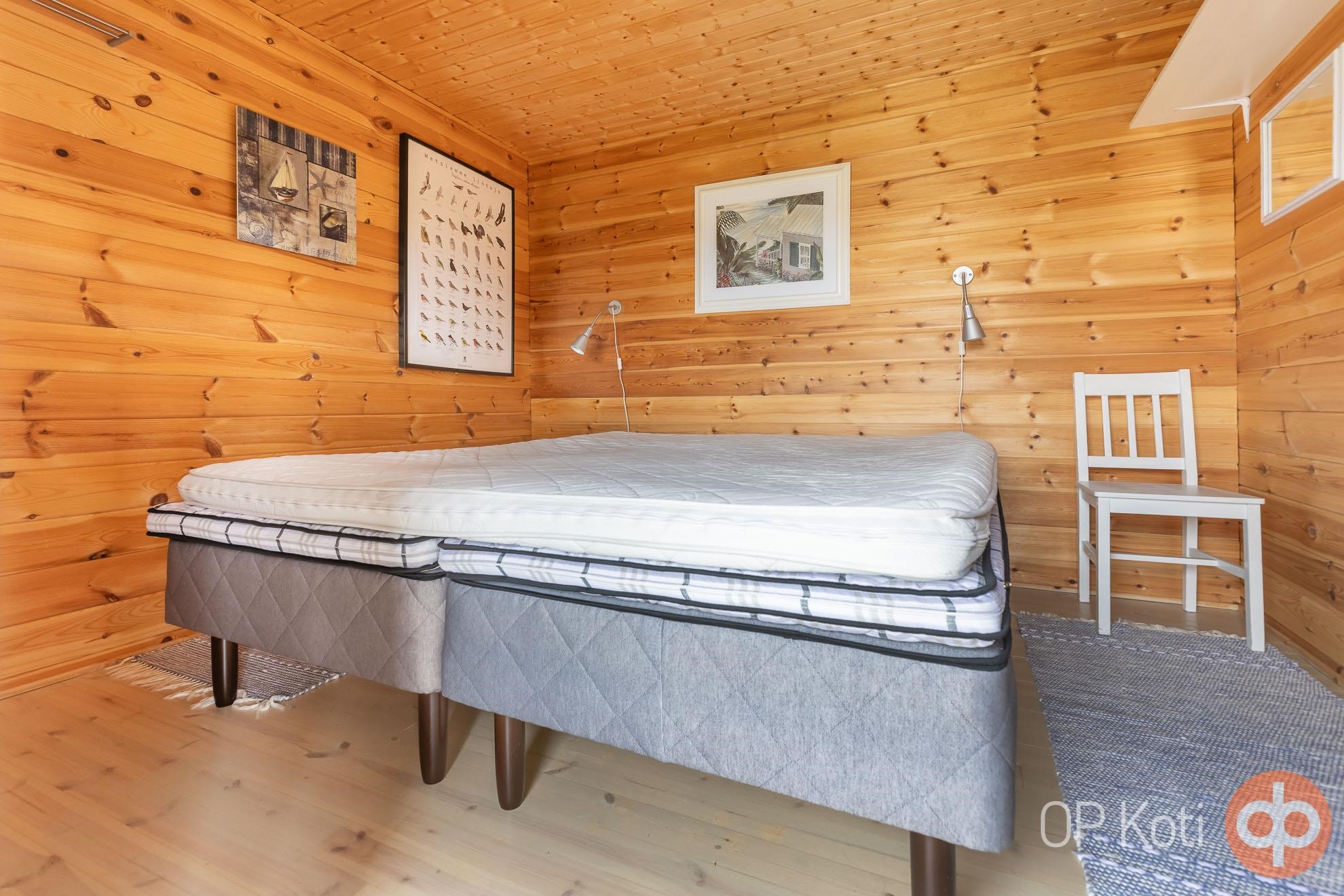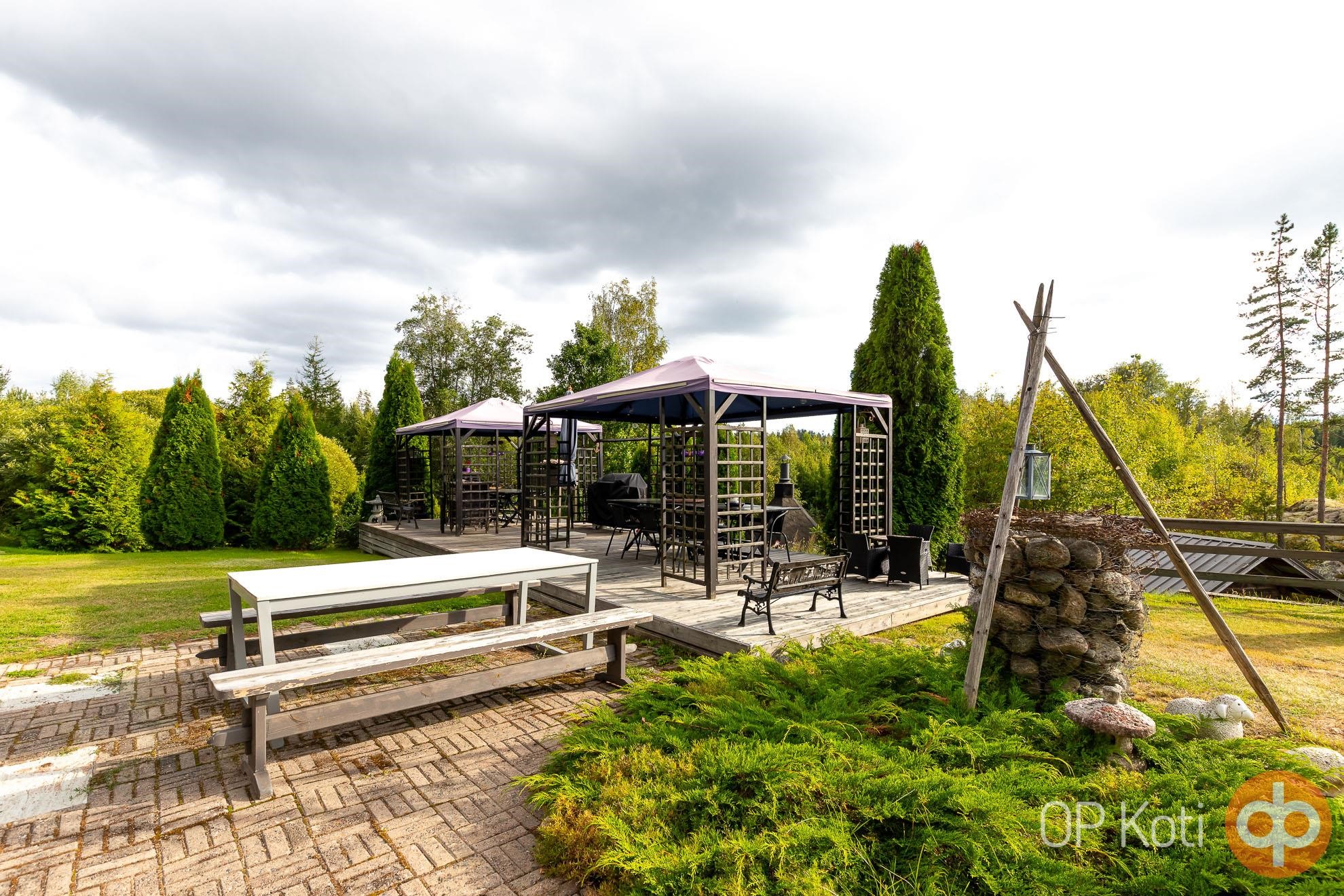 The main building, constructed in 1989, provides living space with two bedrooms. Large glazed terraces at both the front and back of the house offer spacious areas for shared living. Heating is provided by a wood-fired boiler (renewed in 2021). The utility room, hall, and toilet feature electric underfloor heating. The house has been well maintained: windows and doors were renewed in 2021, the heat-storing fireplace in 2020, and an air-source heat pump installed in 2019. Next to the main building is a guest house with its own toilet, and the heating network is shared between the two buildings.